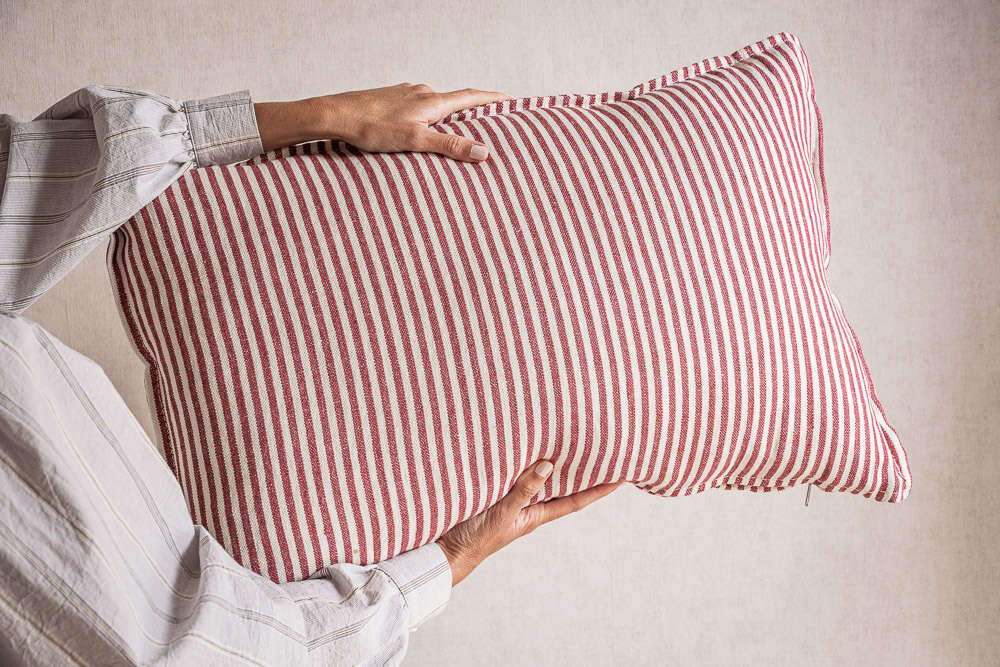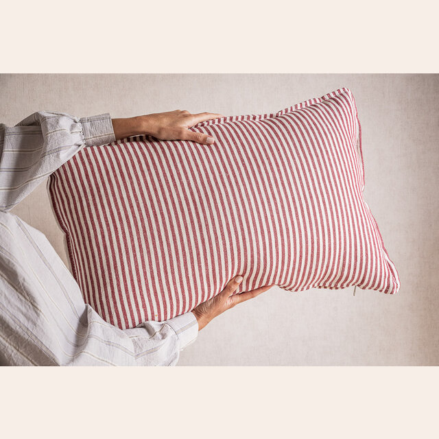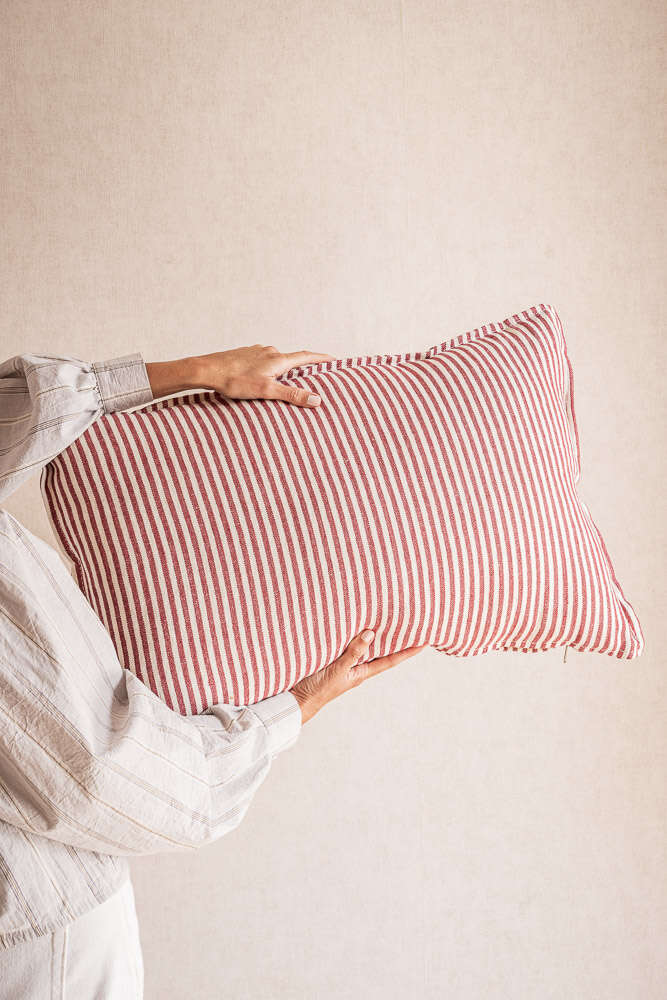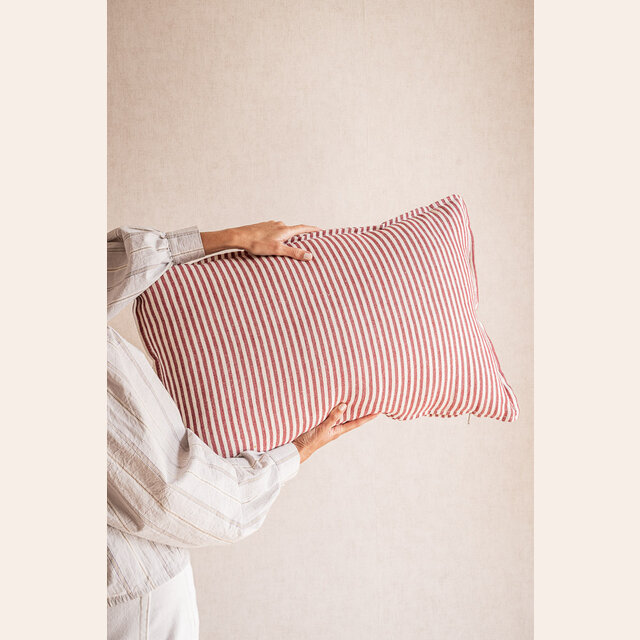 Comodísimo almohadón riñonera con funda 100% lino natural de alto gramaje en estampa a rayas rojas.
