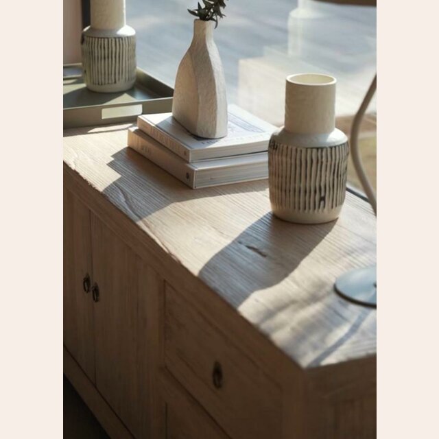 Aparador bajo para TV o detrás de un sillón: un fuerte básico deco en divina madera de olmo antiguo recuperado en lustre natural, con gran capacidad de almacenamiento.
