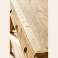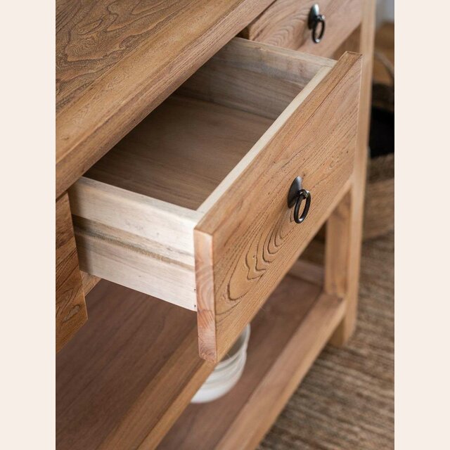 Práctico mueble comodín de olmo macizo natural con 2 estantes y 3 cajones, integrable a múltiples estilos de decoración y funcional en cualquier espacio de la casa: recibidor, living, hall de distribución, dormitorios e incluso cocinas.
