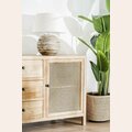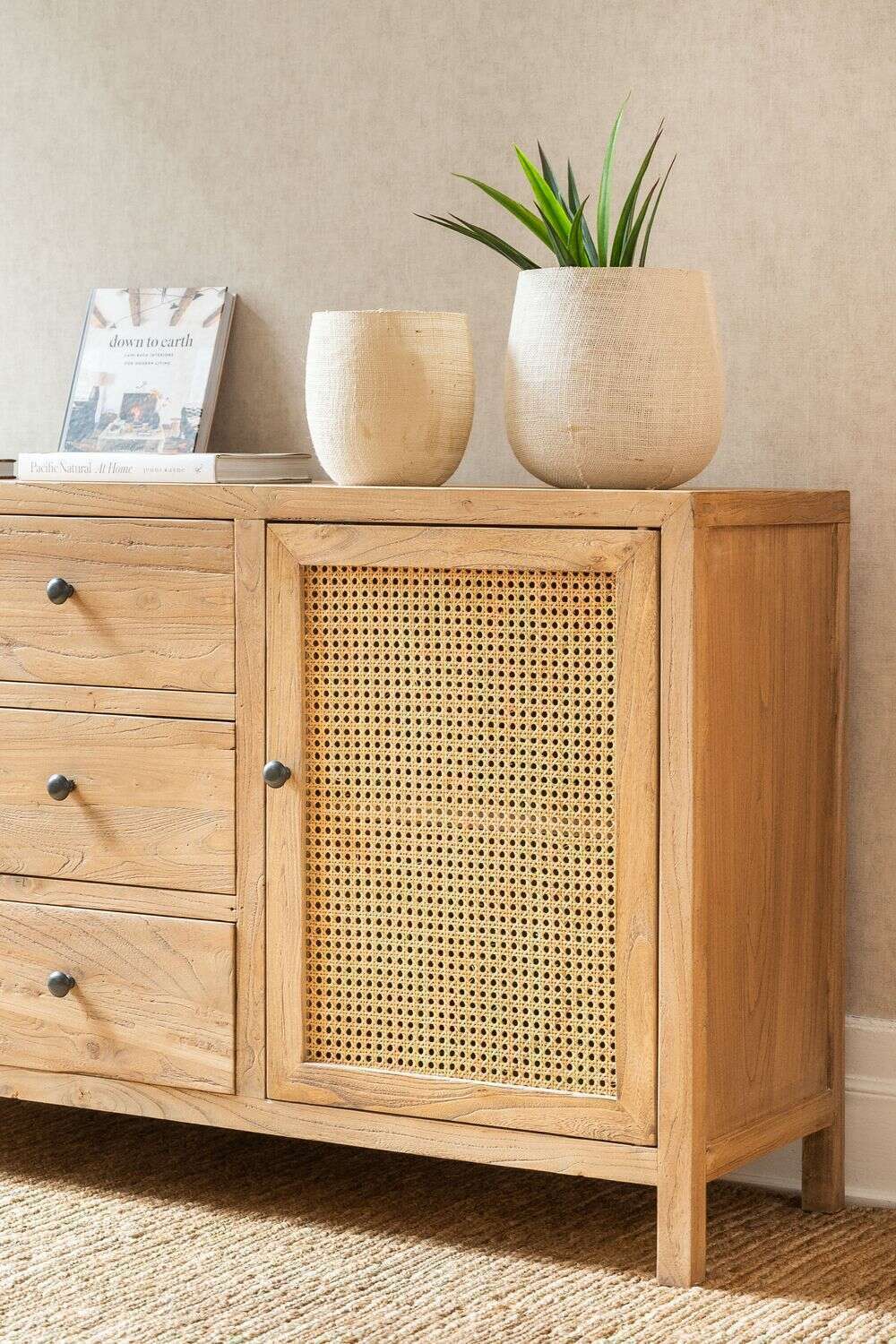 Un fuerte aparador de olmo macizo y esterilla con máxima optimización del almacenamiento: 2 puertas con 2 estantes cada una, y 3 amplios cajones.