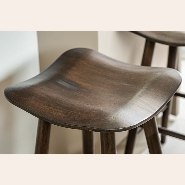 Divino banco de bar o isla en madera de caucho con asiento ergonómico en ondas y estructura también de caucho macizo con cómodo apoya pies.