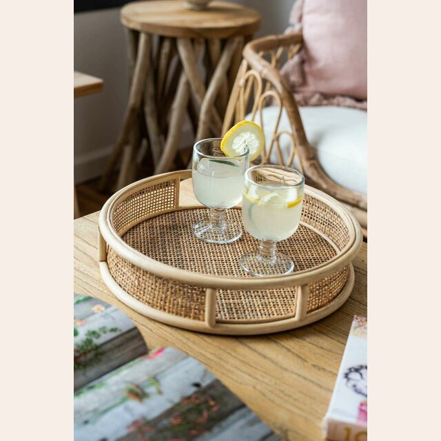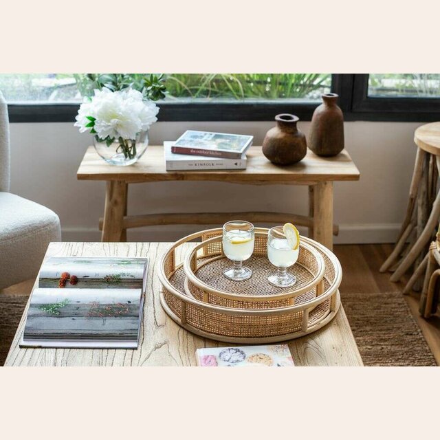 Divina bandeja redonda con asas con borde de bamboo y base de rattan natural.