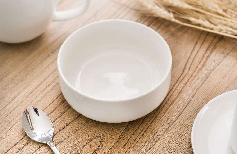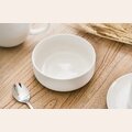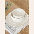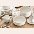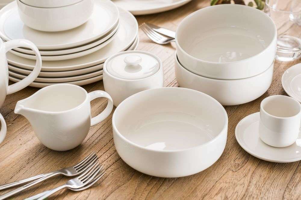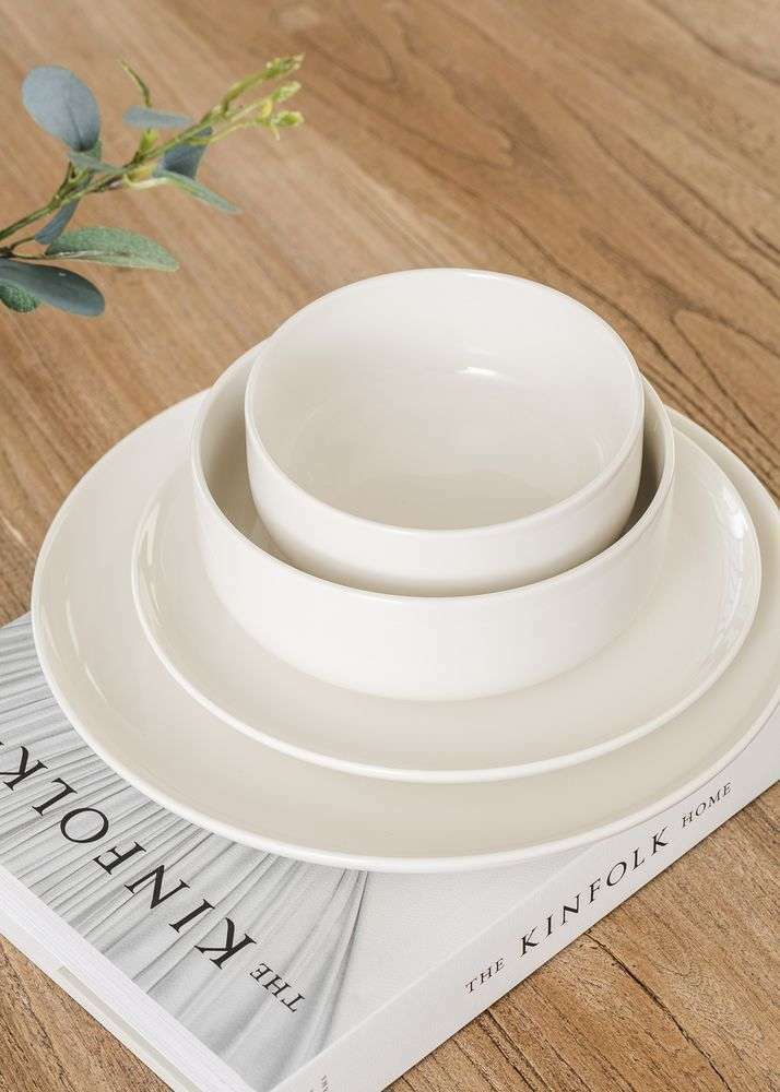 Vajilla de porcelana off-wite de linea moderna y calma,con bordes levemente elevados.