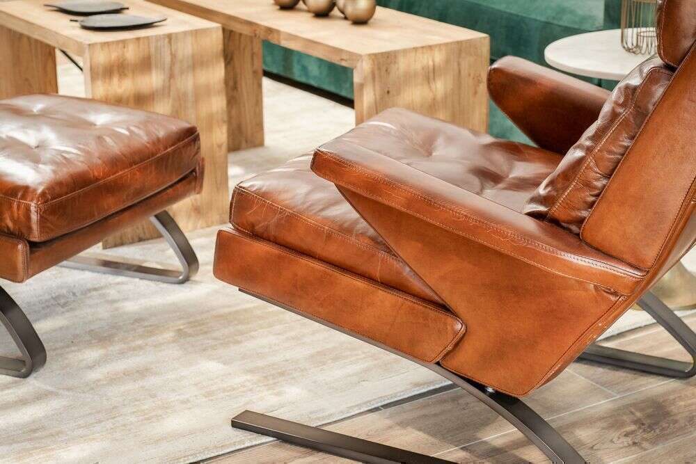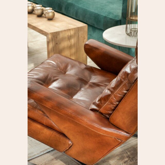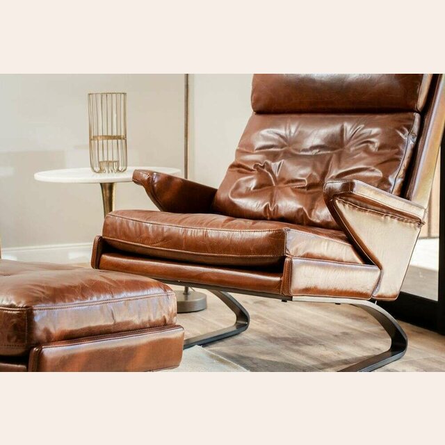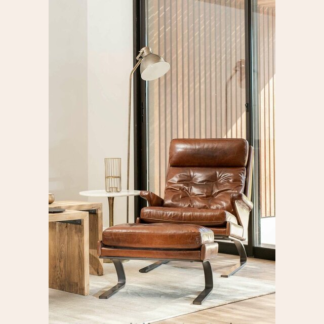 Amplia y comodísima butaca lounge con posapié tapizada en cuero italiano envejecido en color habano y estructura de metal.