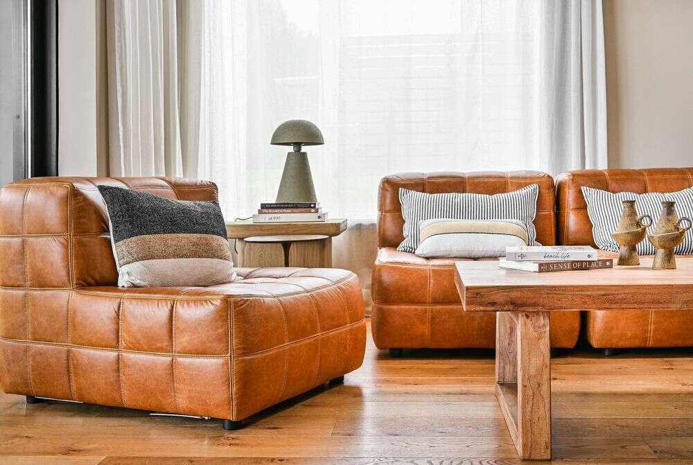 Sillón de 1 cuerpo o butaca amplia encastrable (pueden unirse entre sí formando un sillón de 2, 3 o 4 cuerpos) - de cuero italiano envejecido color caramelo.