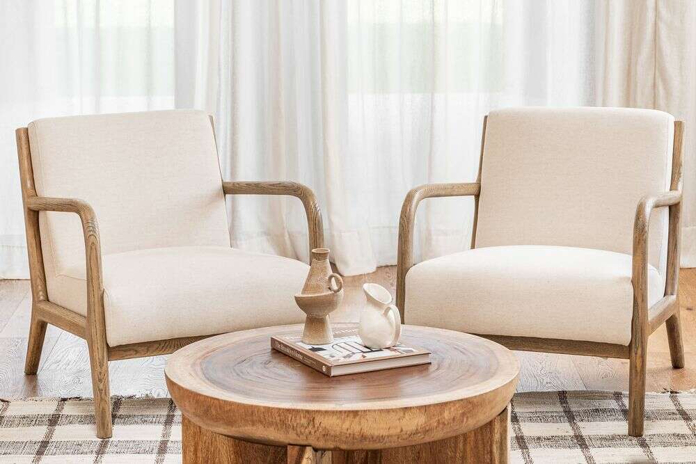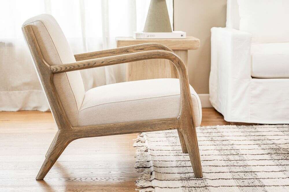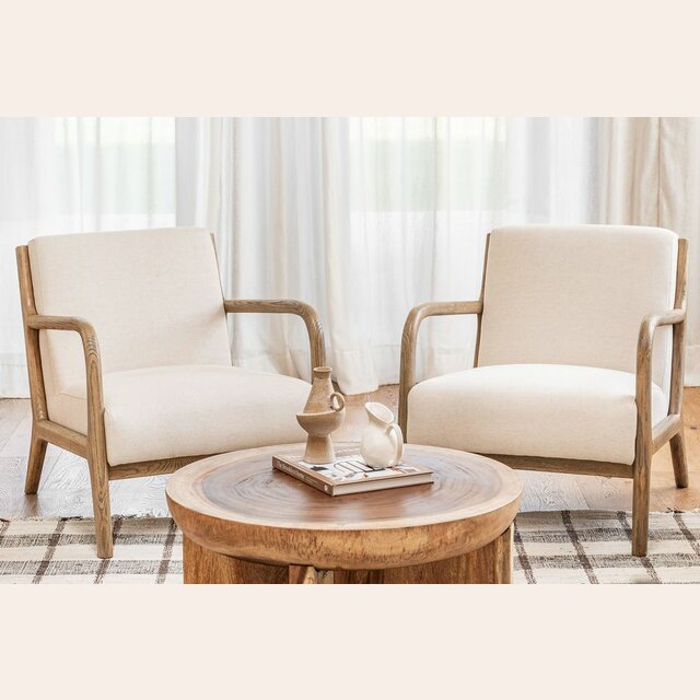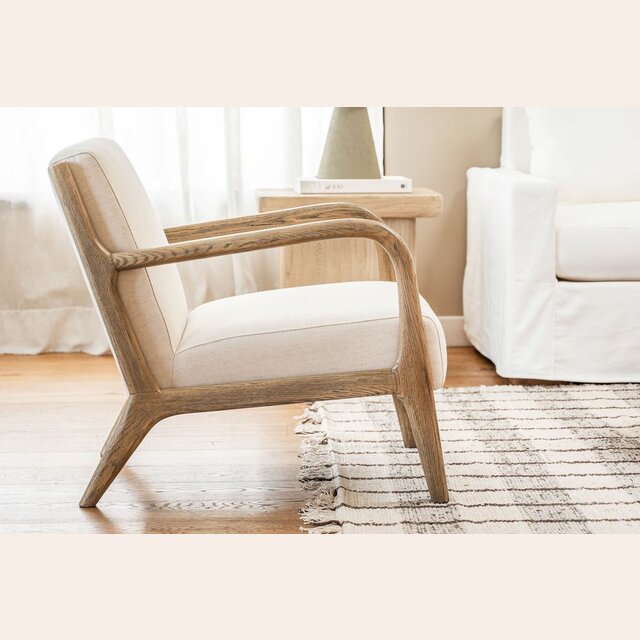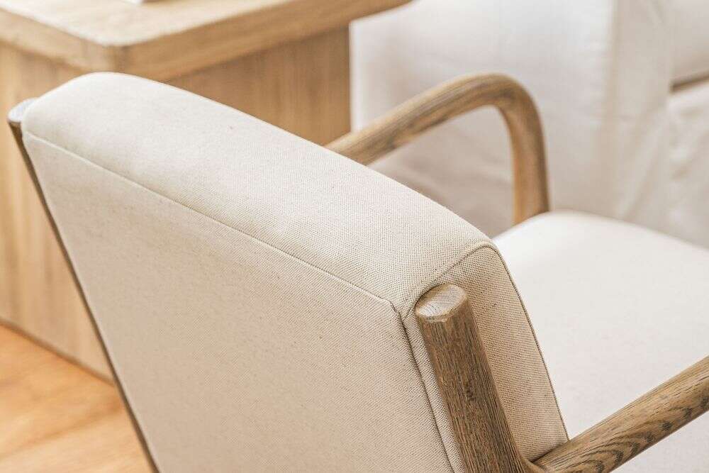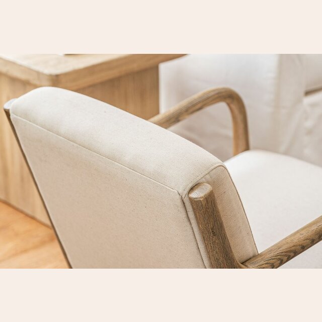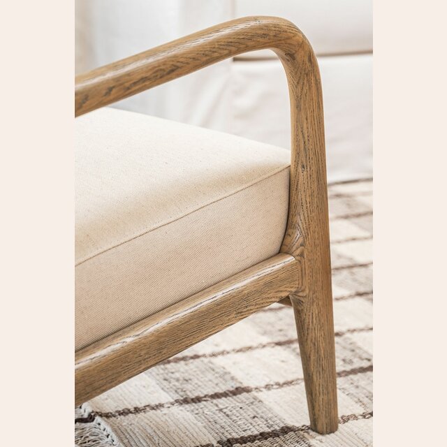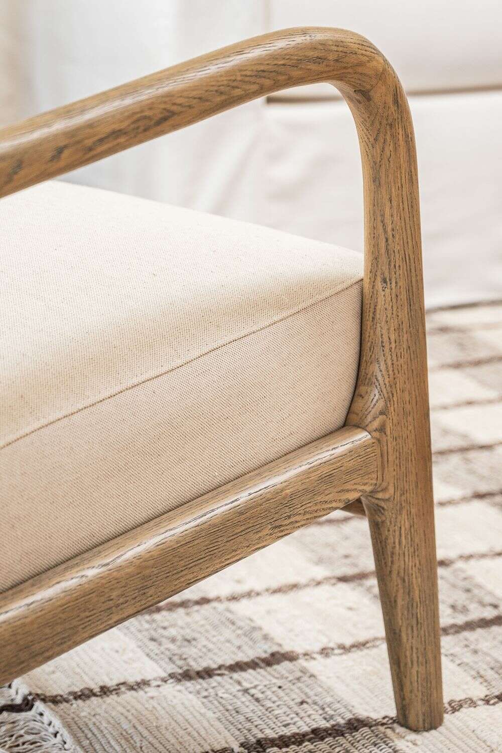 Divina butaca de líneas curvas en fresno macizo y tapizado en lino crudo.