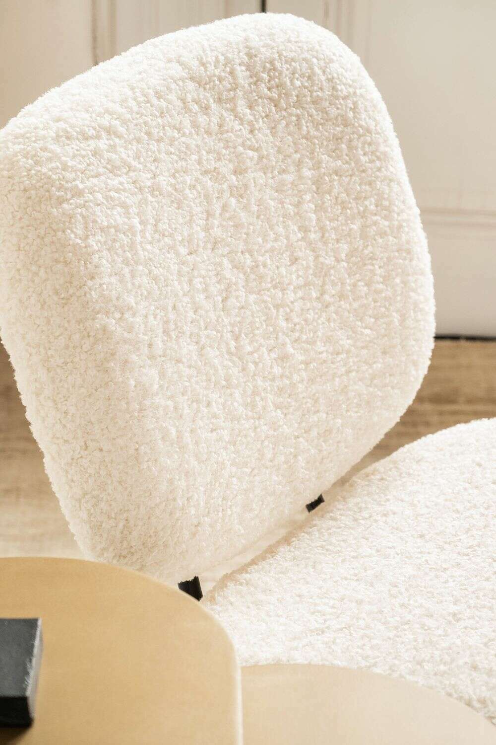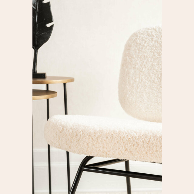 Butaca Juana con estructura de hierro y asiento tapizado de corderito sintético.
