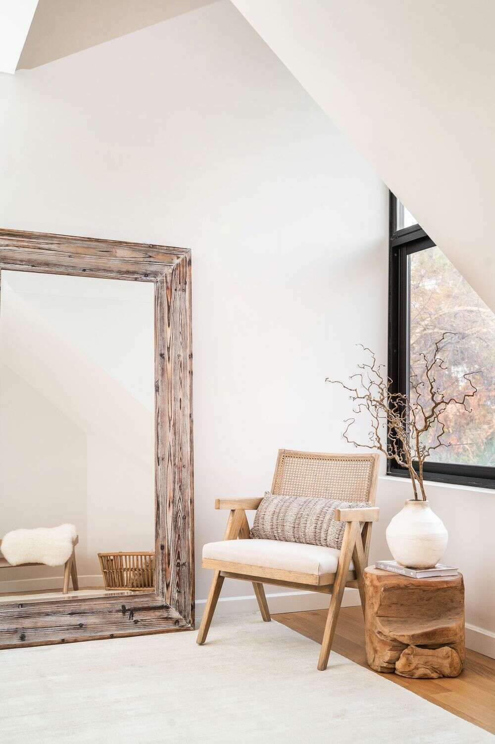 Butaca de líneas rectas en madera de fresno macizo curvo con cómodo asiento de lino crudo y respaldo de esterilla.