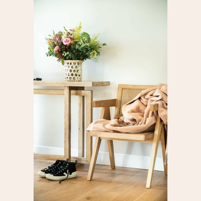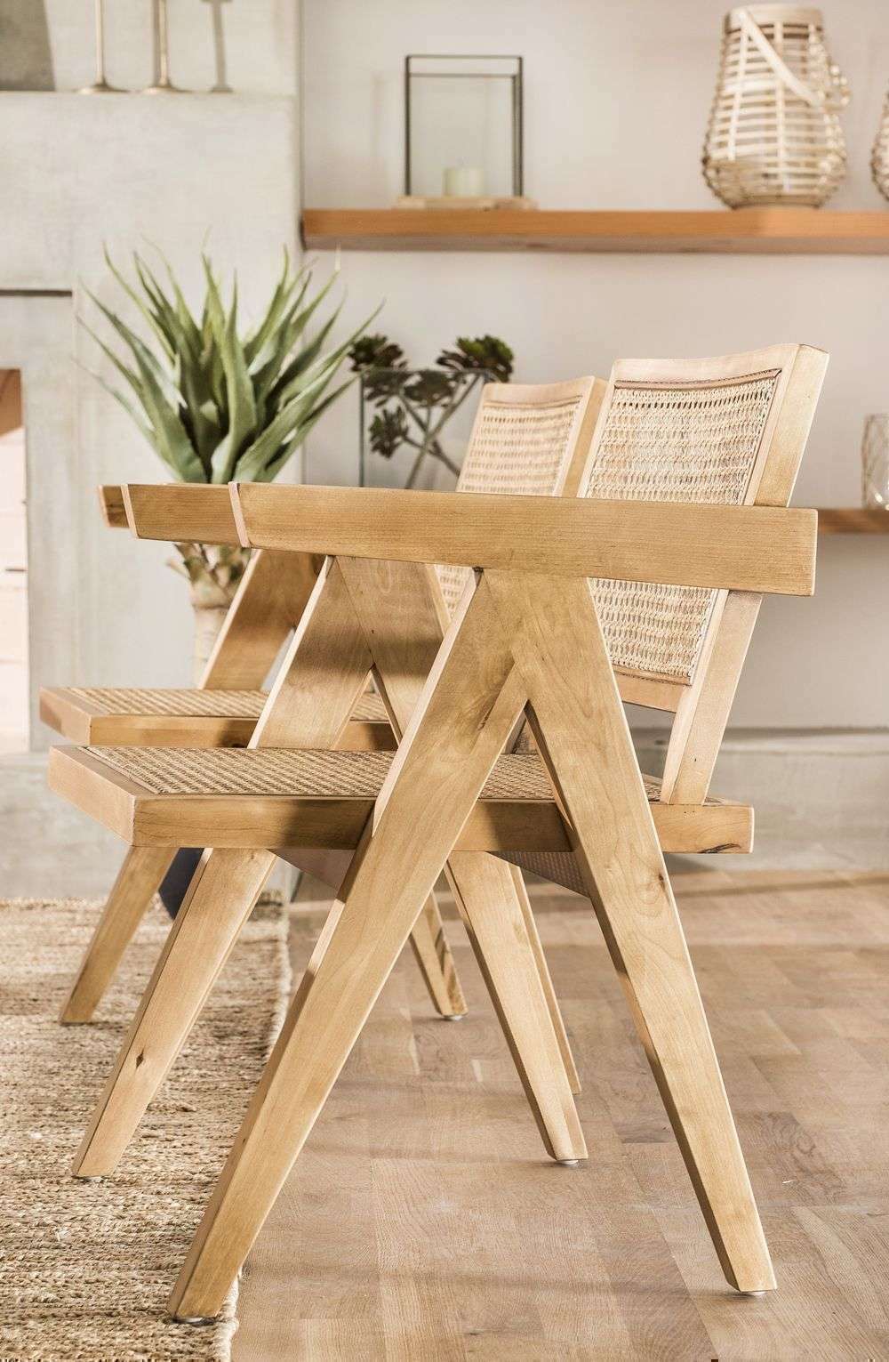 Butaca de pino macizo lustre miel, con asiento y respaldo de esterilla.