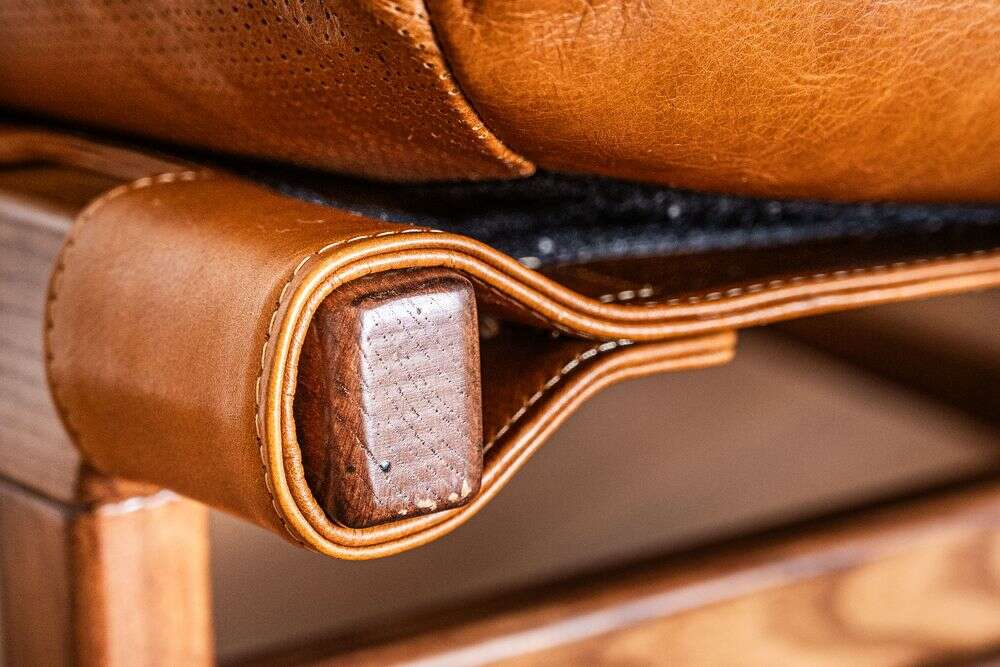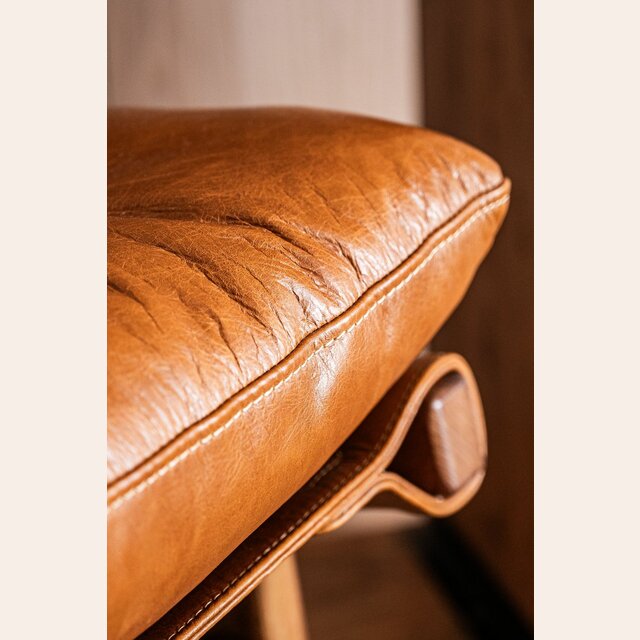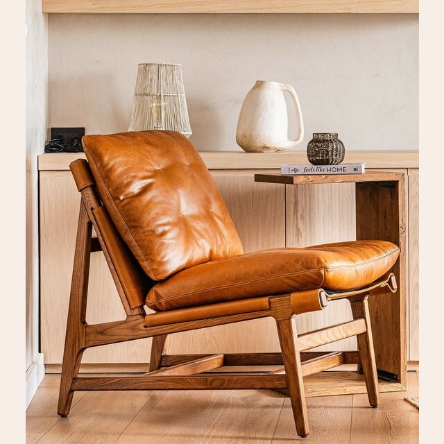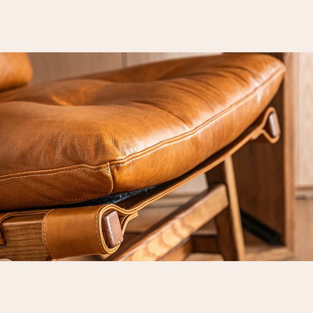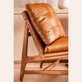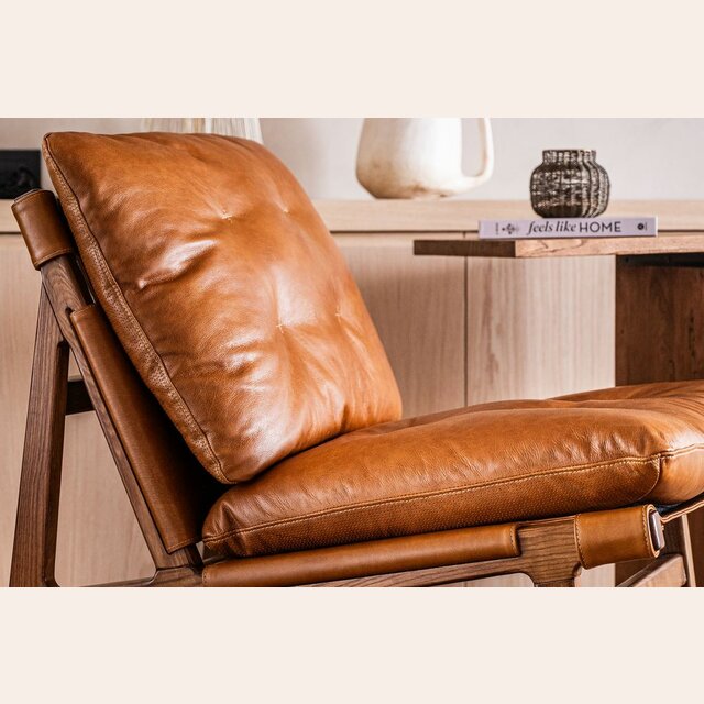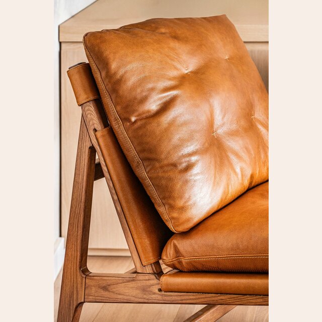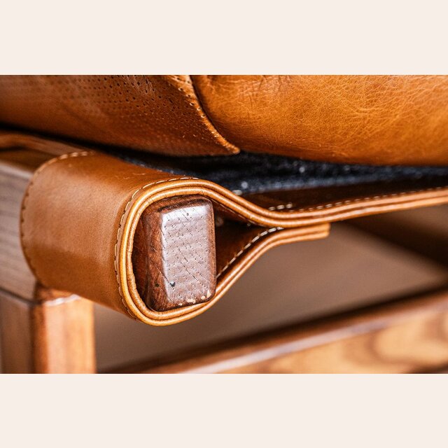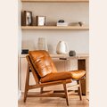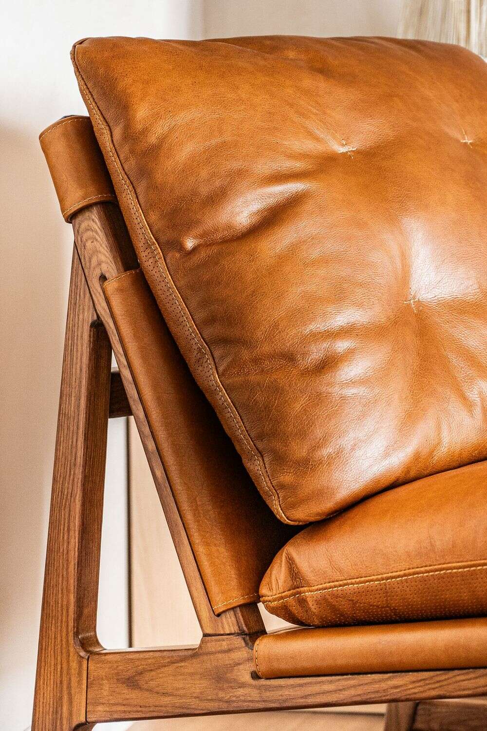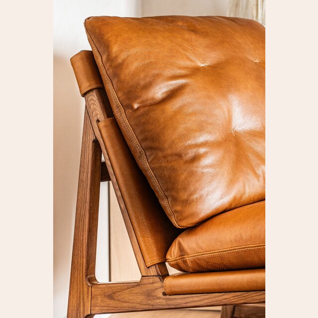Espectacular butaca de estilo mid century en cuero italiano añejo, color caramelo, y estructura de fresno macizo en suave lustre tostado.