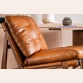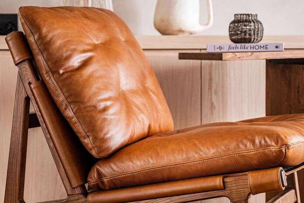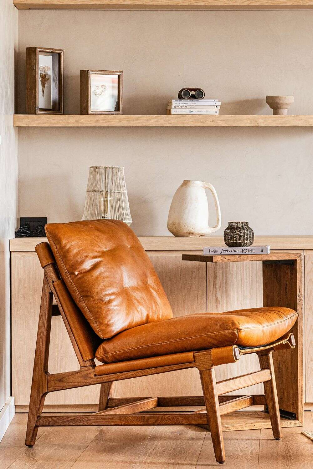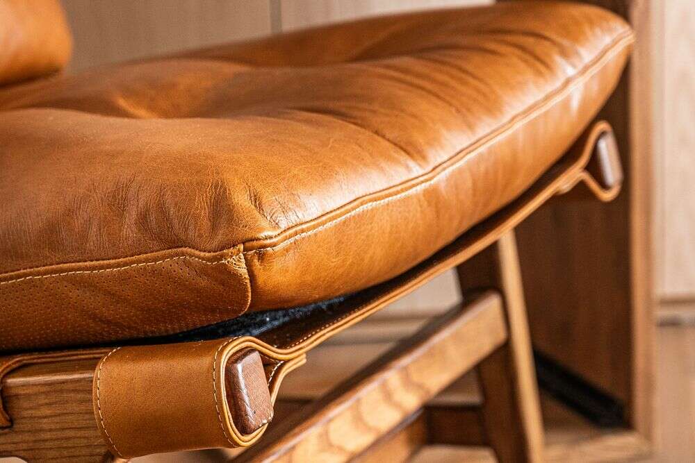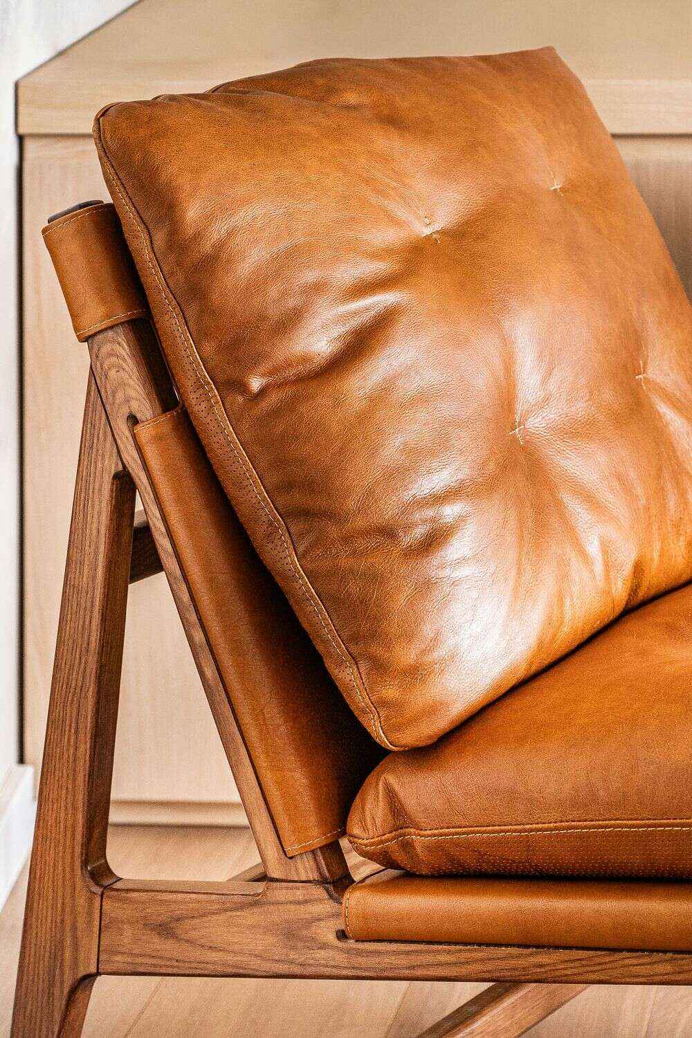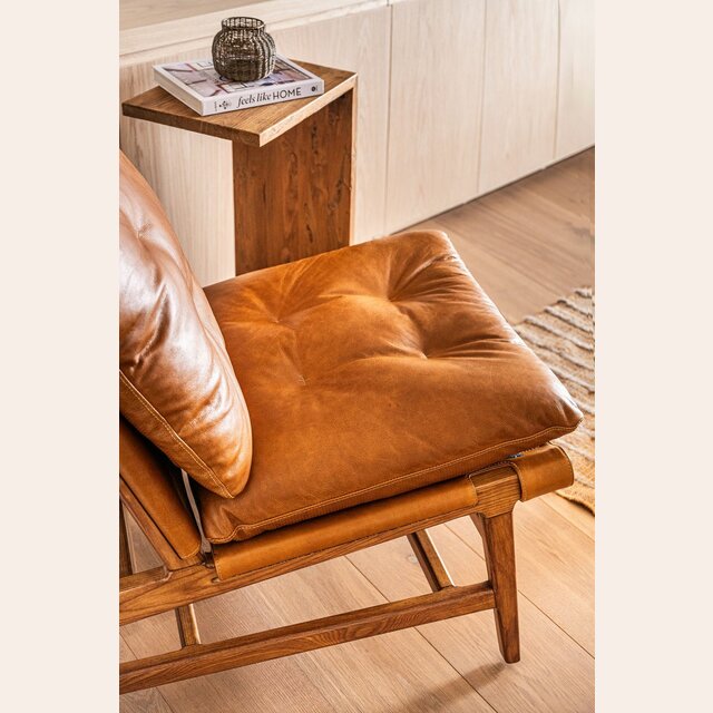 Espectacular butaca de estilo mid century en cuero italiano añejo, color caramelo, y estructura de fresno macizo en suave lustre tostado.