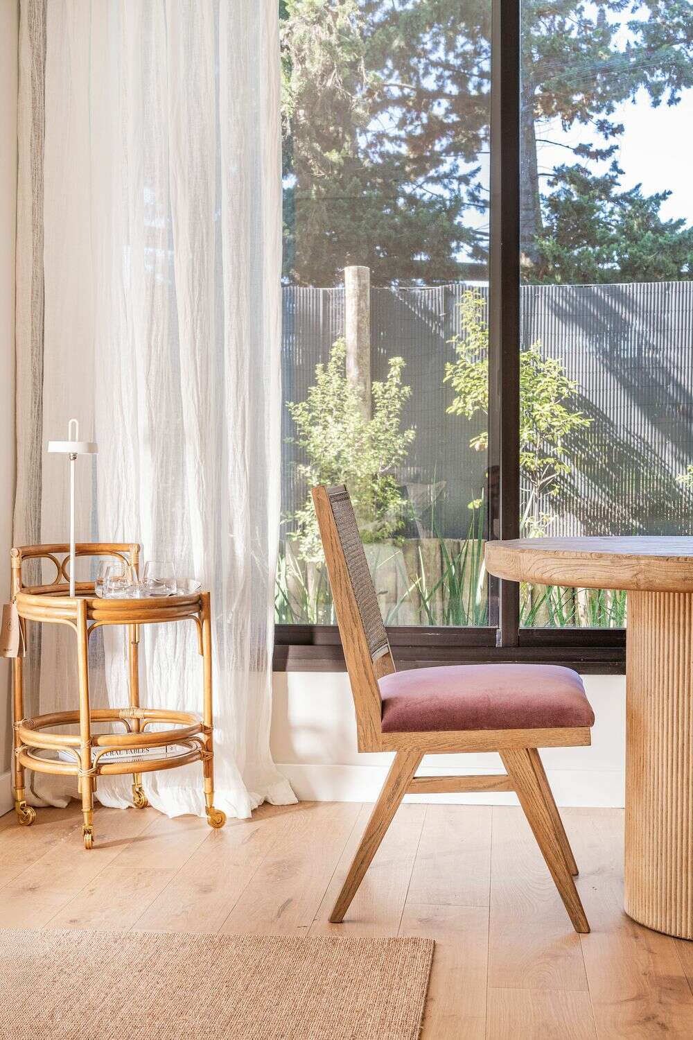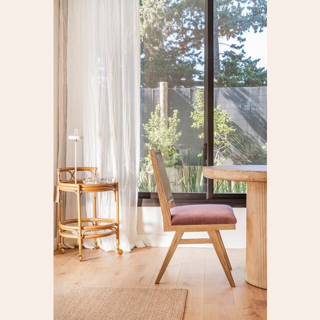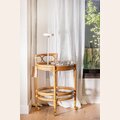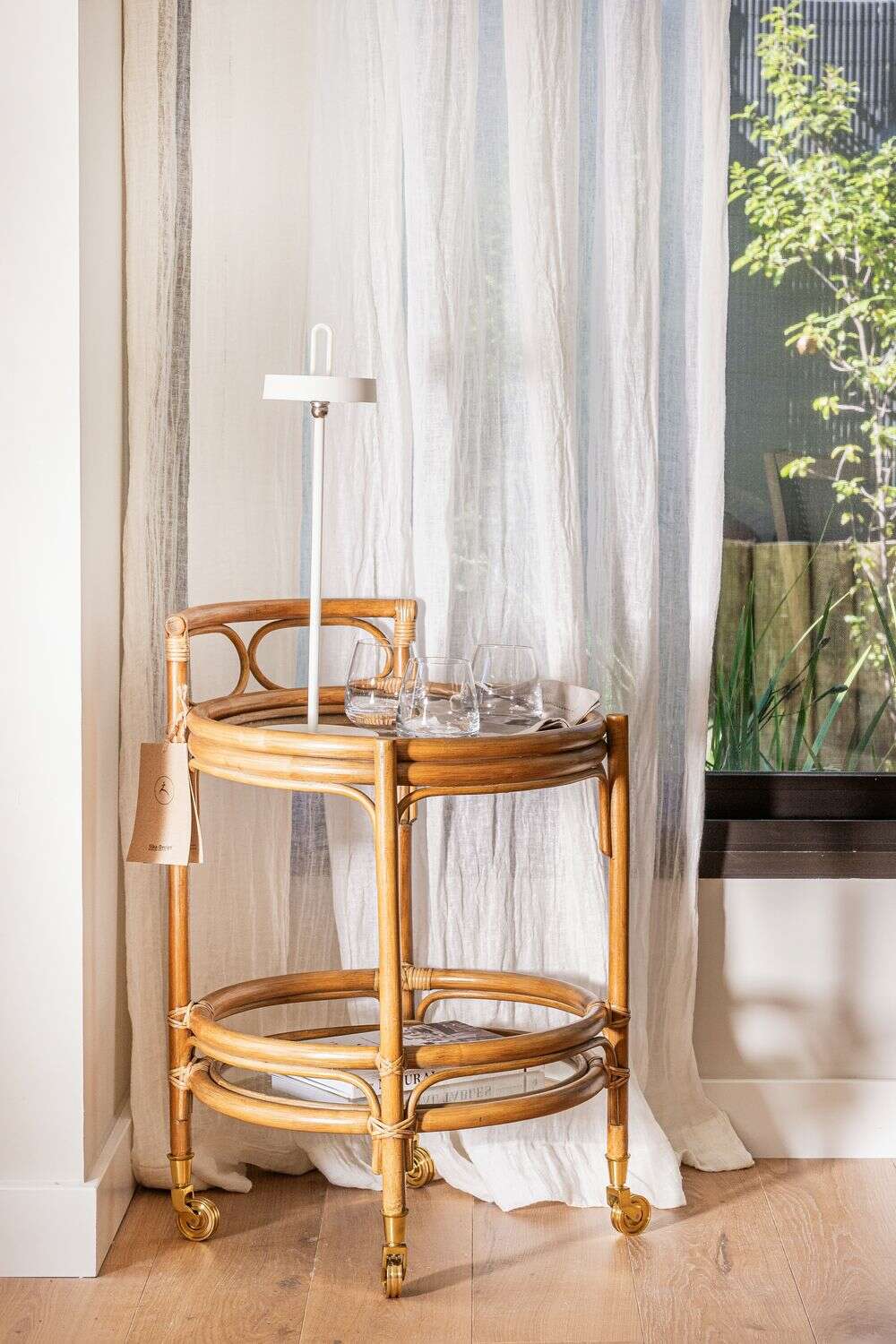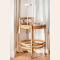 Práctico carro de bamboo y vidrio con rueditas, asas para fácil transporte y un trabajo artesanal de los materiales con excelente ejecución y calidad.