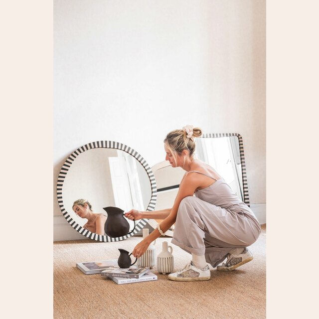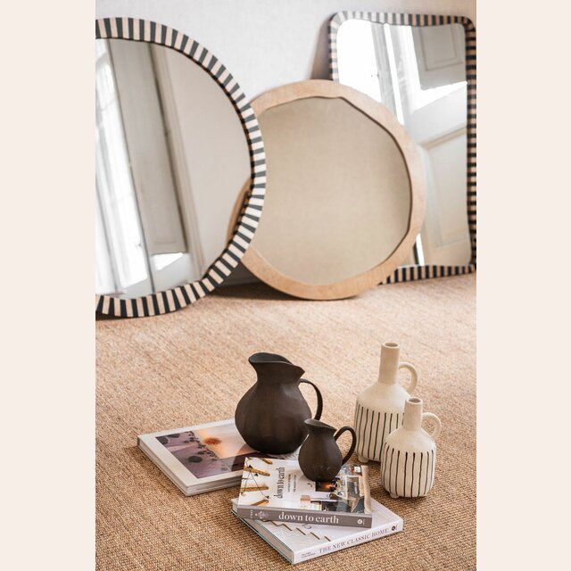 La colección de espejos Kenia con borde irregular y estampa a rayas es una pieza con personalidad y jugada para levantar espacios con una base neutra, o incluso dar más power a una decoración maximalista.