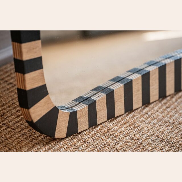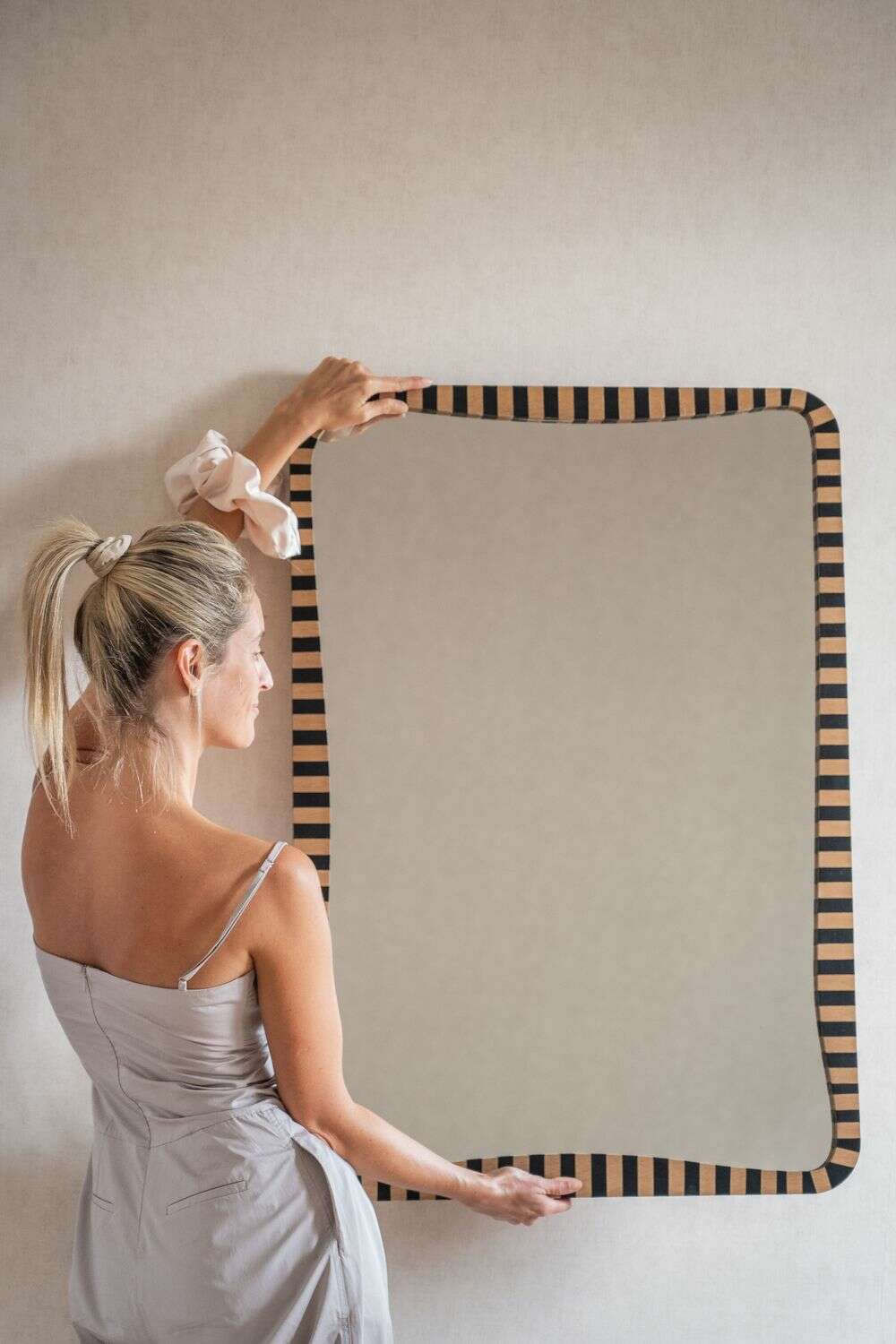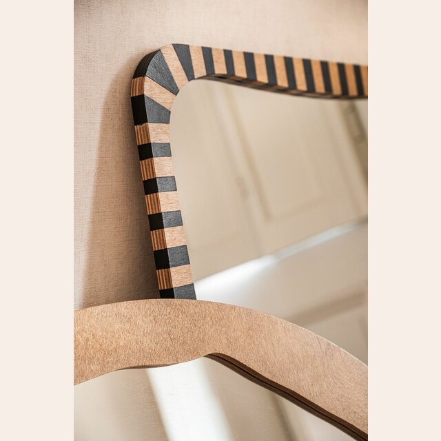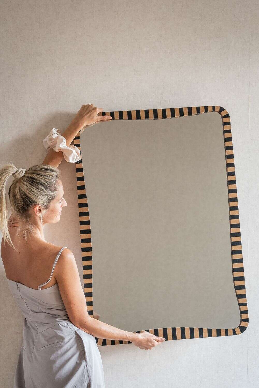 La colección de espejos Kenia con borde irregular y estampa a rayas es una pieza con personalidad y jugada para levantar espacios con una base neutra, o incluso dar más power a una decoración maximalista.