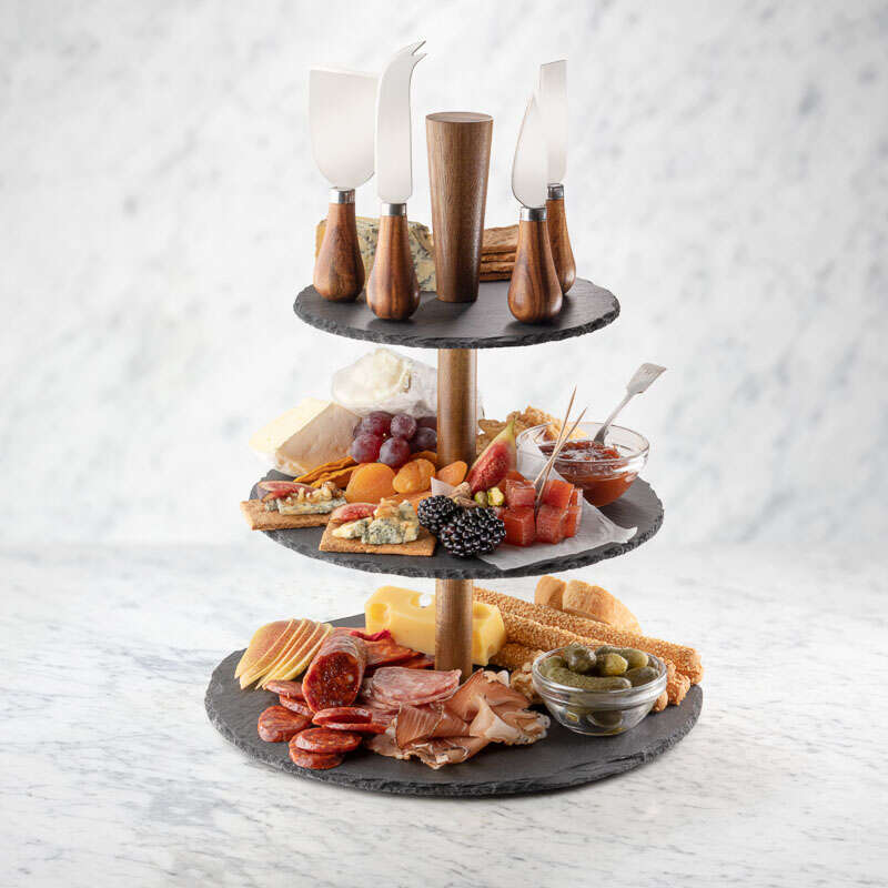 FUENTE PIZARRA 3 PISOS CON 4 CUCHILLOS DE QUESO TAYLORS