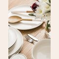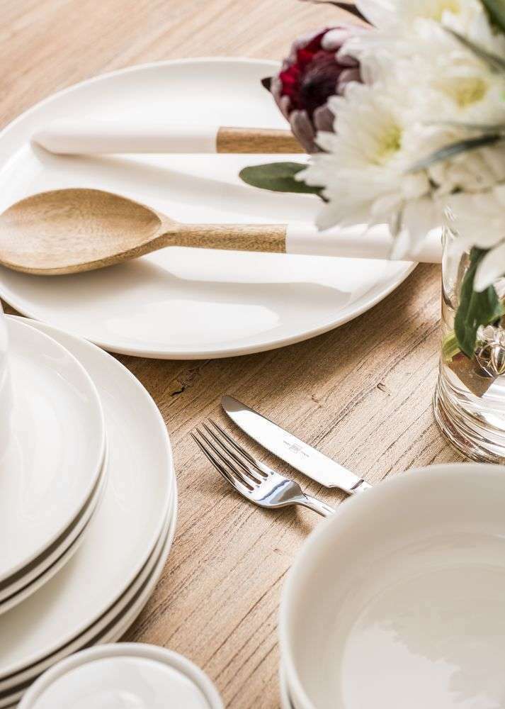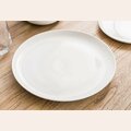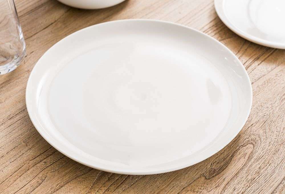 Vajilla de porcelana off-wite de linea moderna y calma,con bordes levemente elevados.