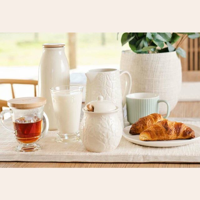 Jarrito de vidrio para té con colador y tapita multifunción.