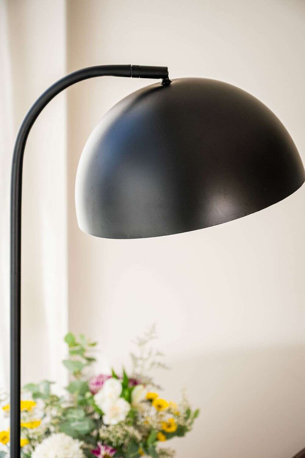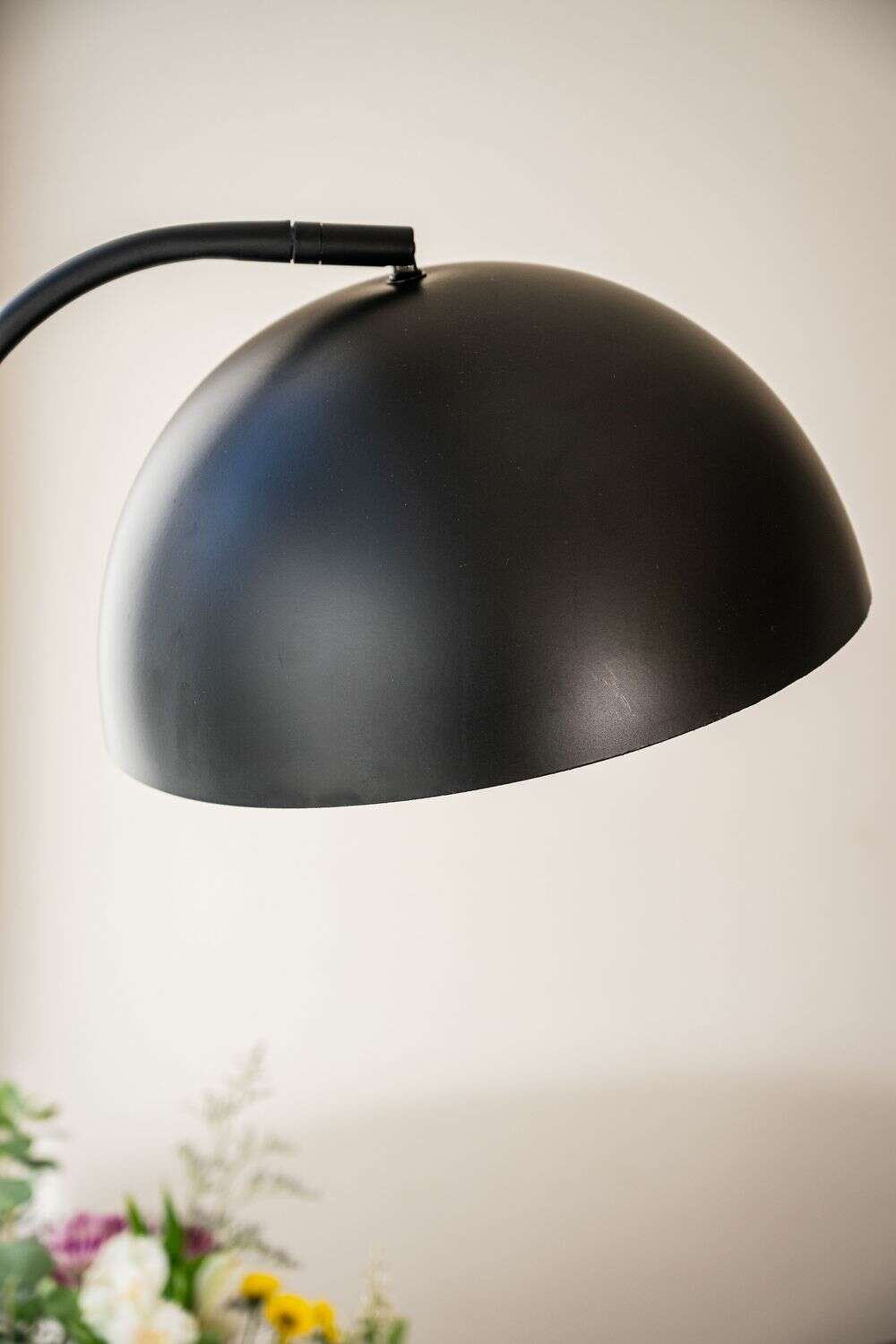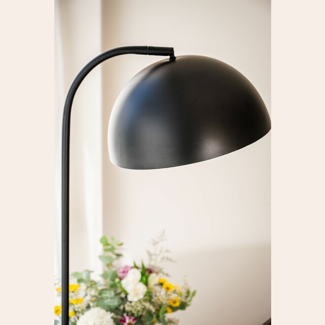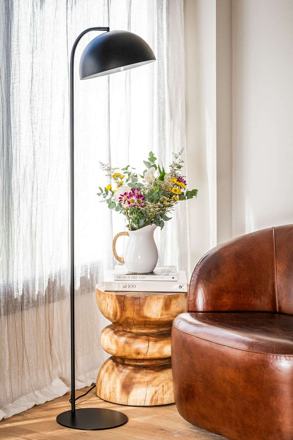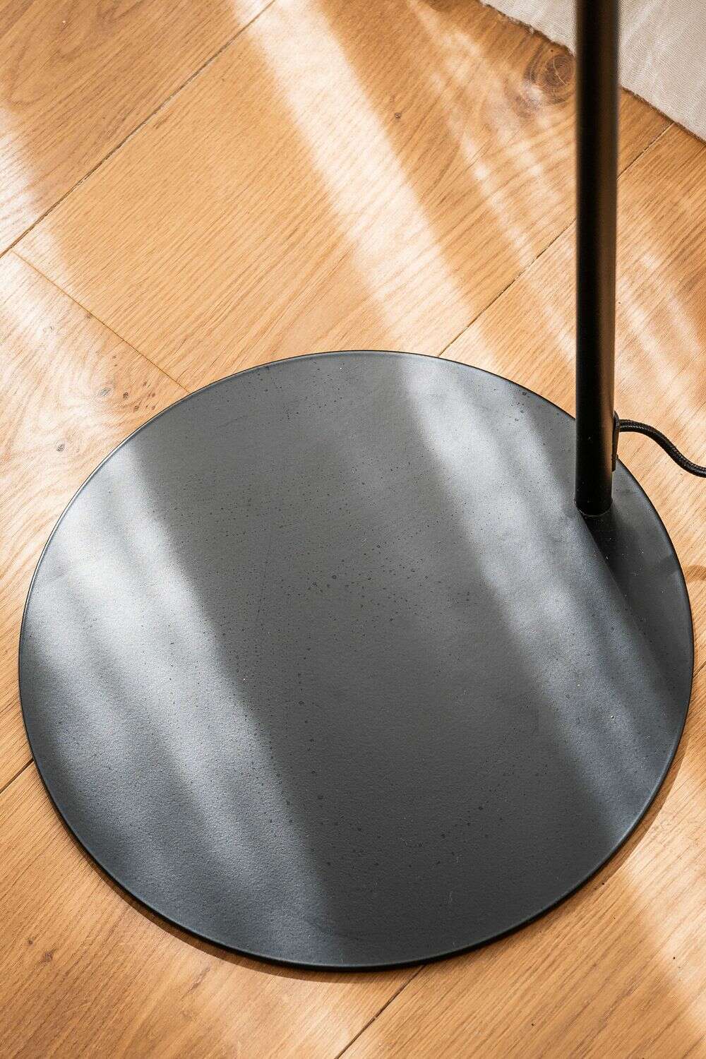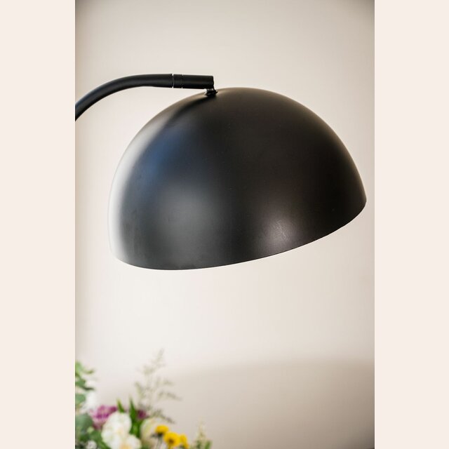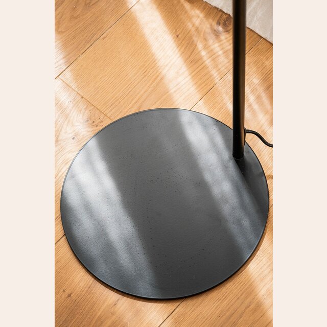Moderna lámpara de pie con pantalla capelina, metal color negro.