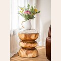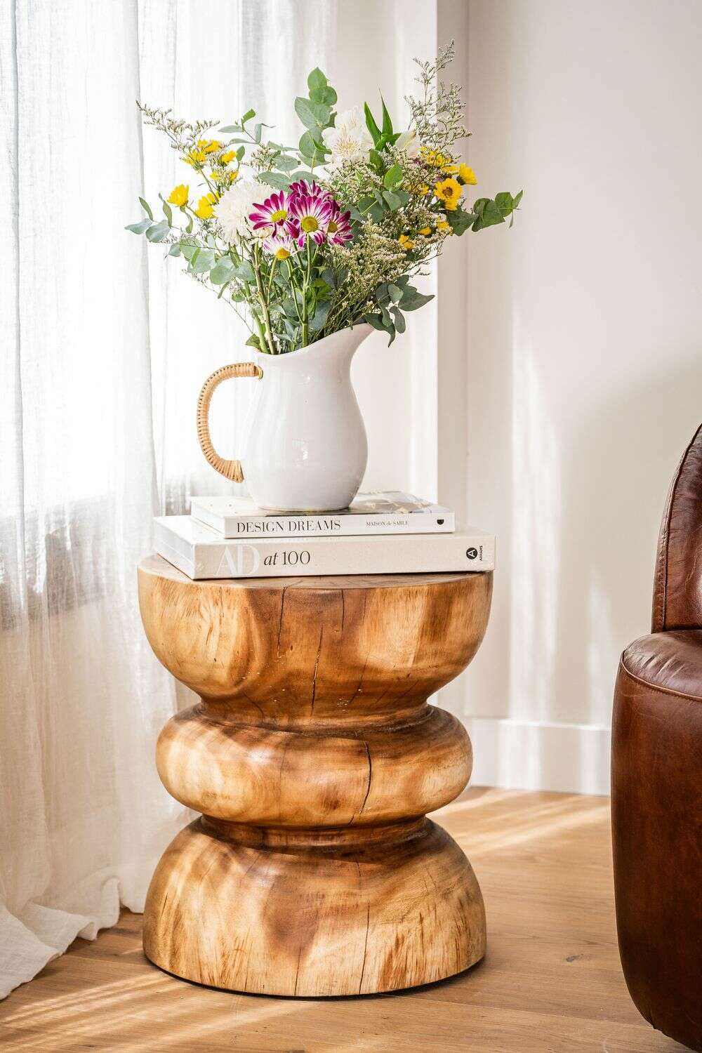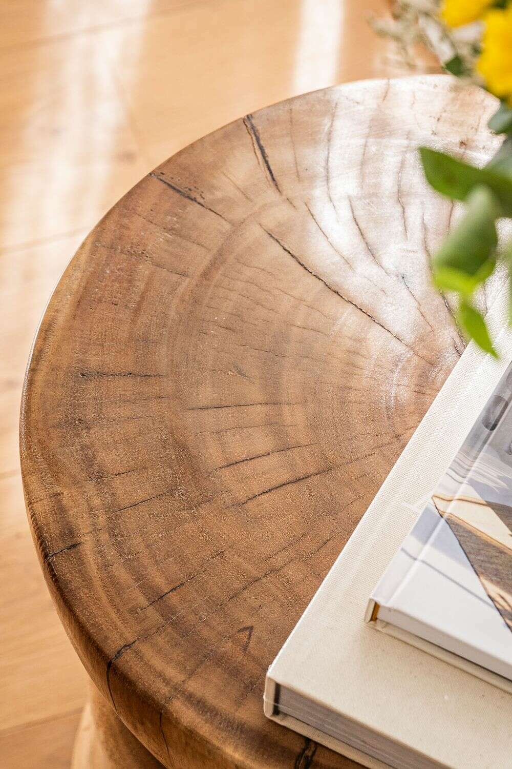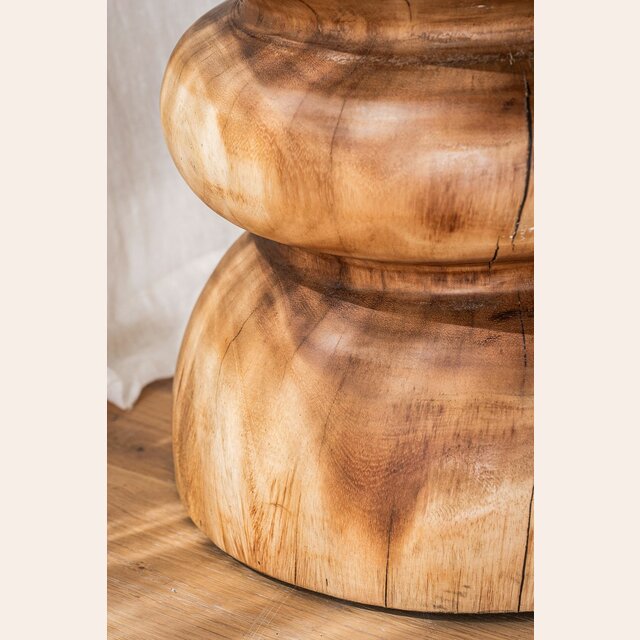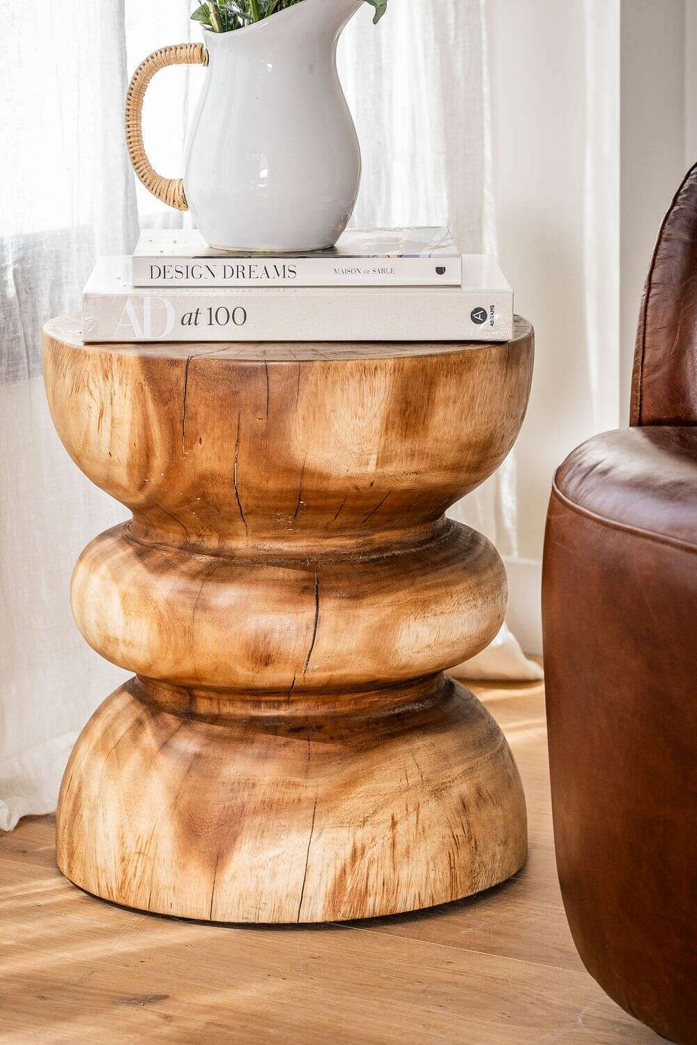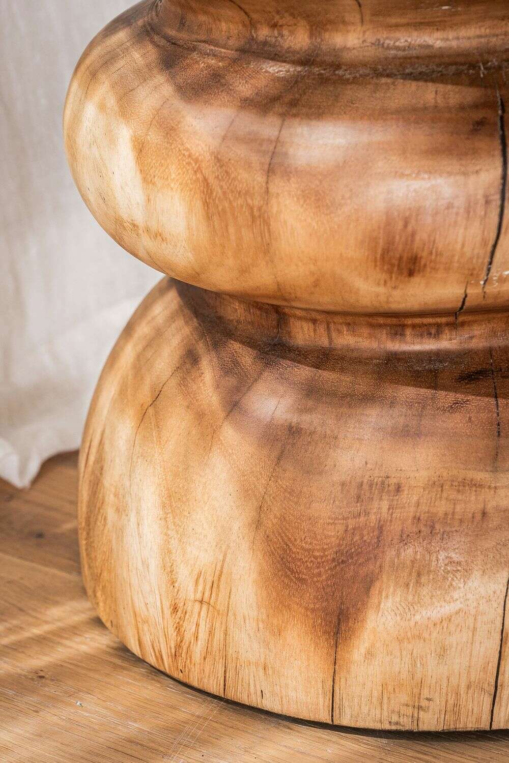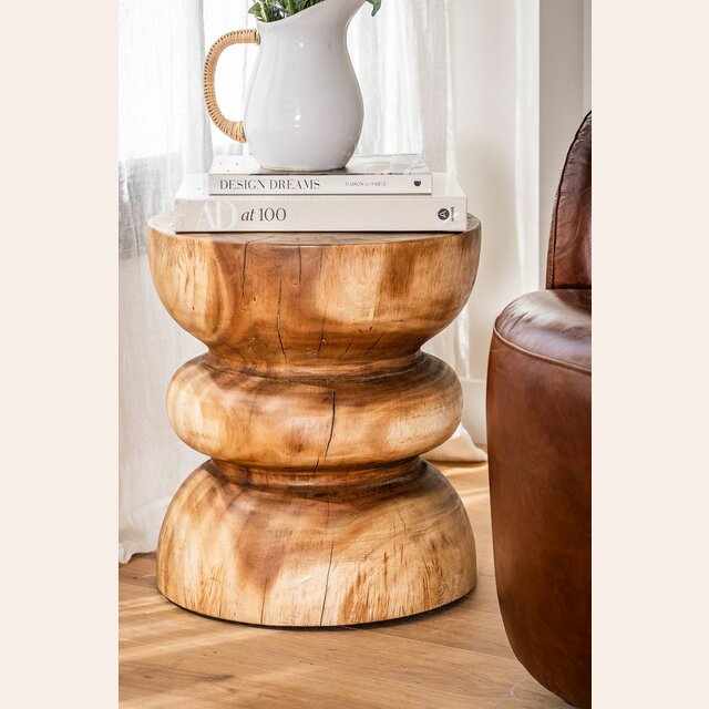 Mesa auxiliar o lateral en madera maciza de árbol de suar en suave lustre tostado.