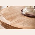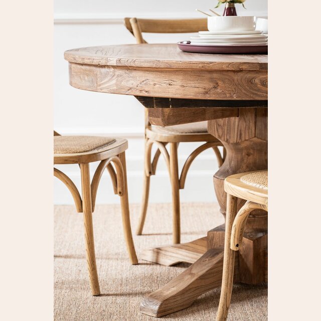Mesa de comedor redonda con extensión a oval, de olmo antiguo macizo reciclado en lustre natural, con cómoda base central y un estilo atemporal a prueba de modas y el paso del tiempo.