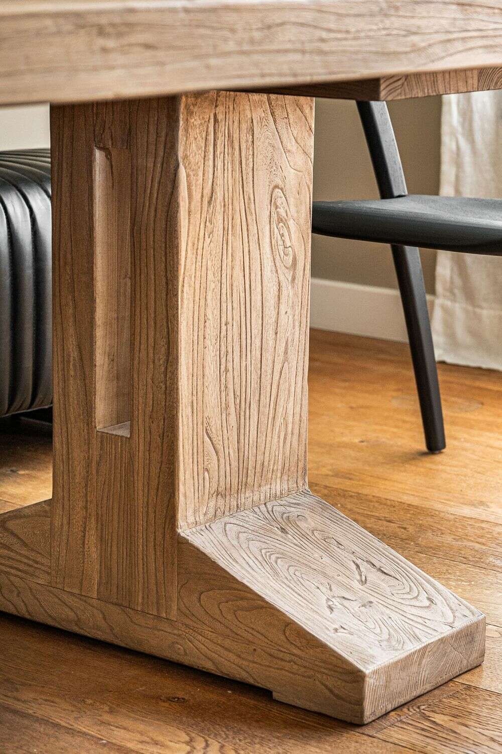 Impactante mesa de comedor de olmo antiguo reciclado en lustre natural, con base recta maciza de cómoda disposición para las piernas.