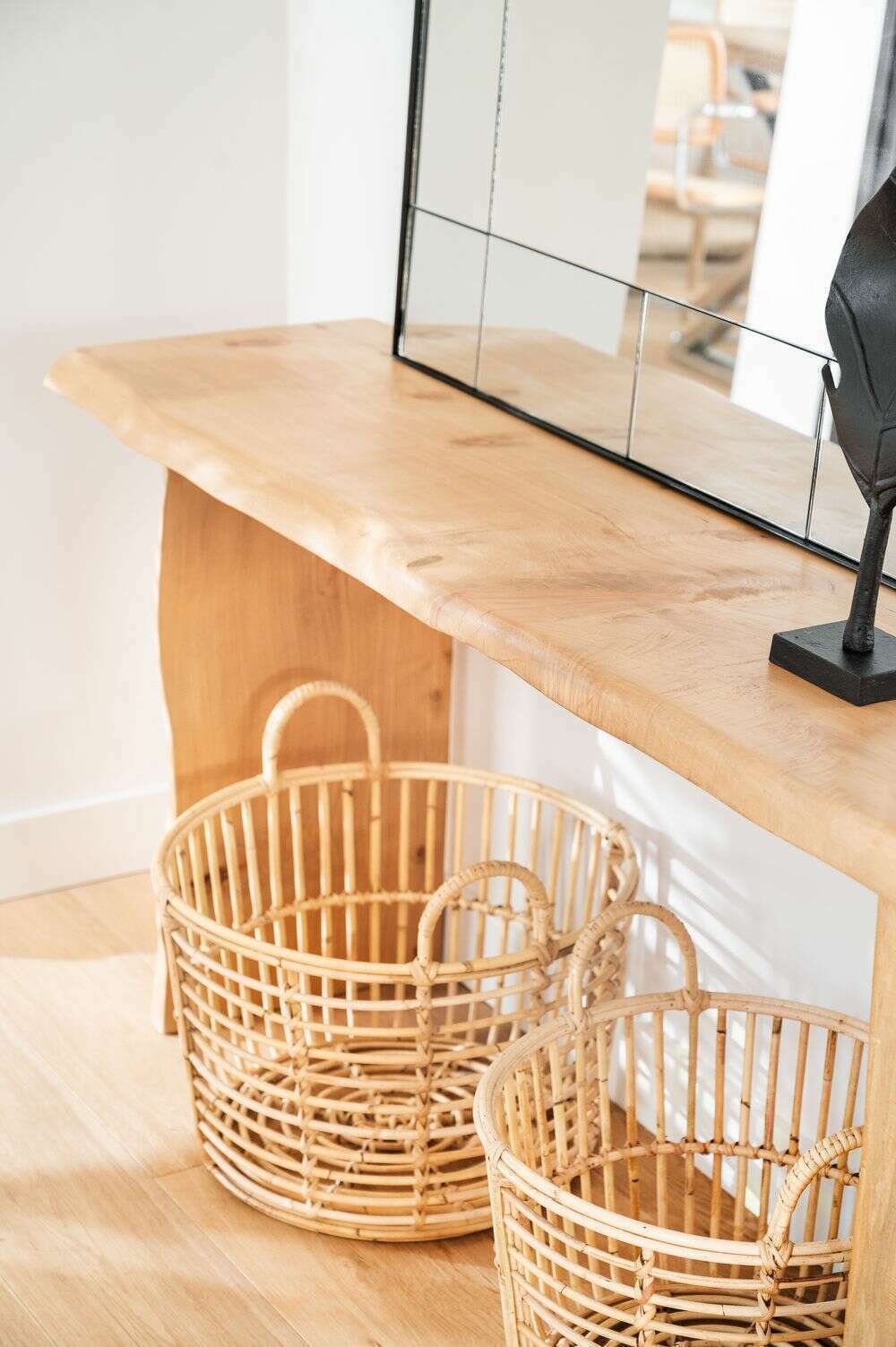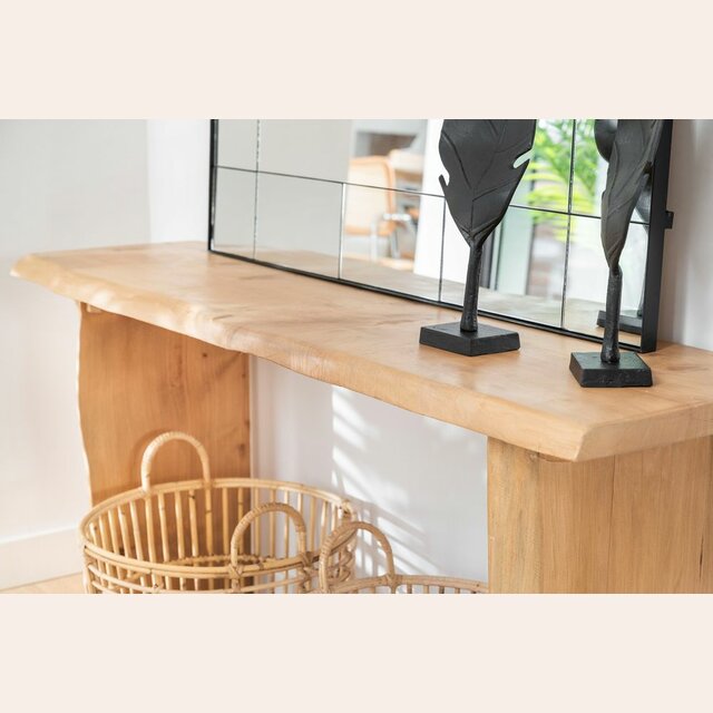 Consola de ciprés macizo con terminación irregular en lustre natural.