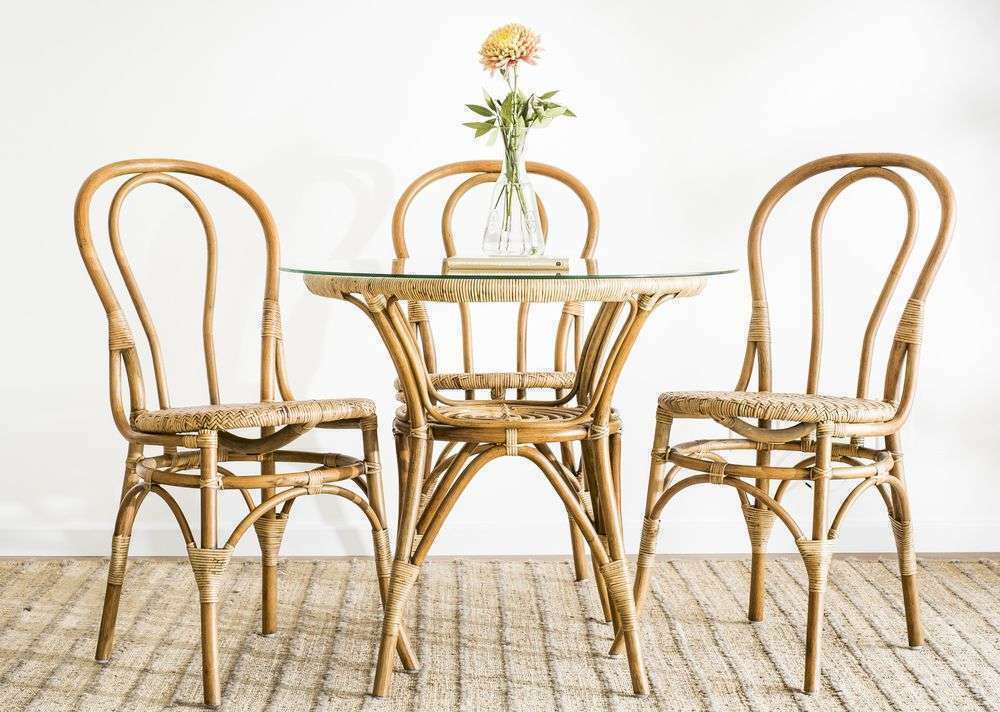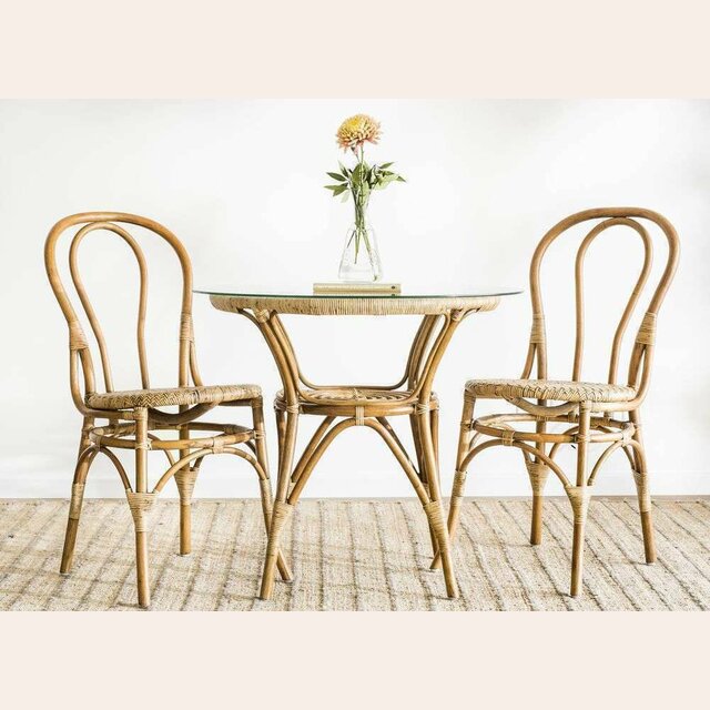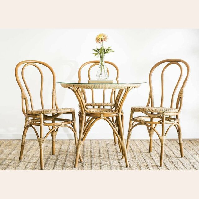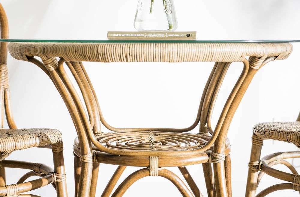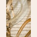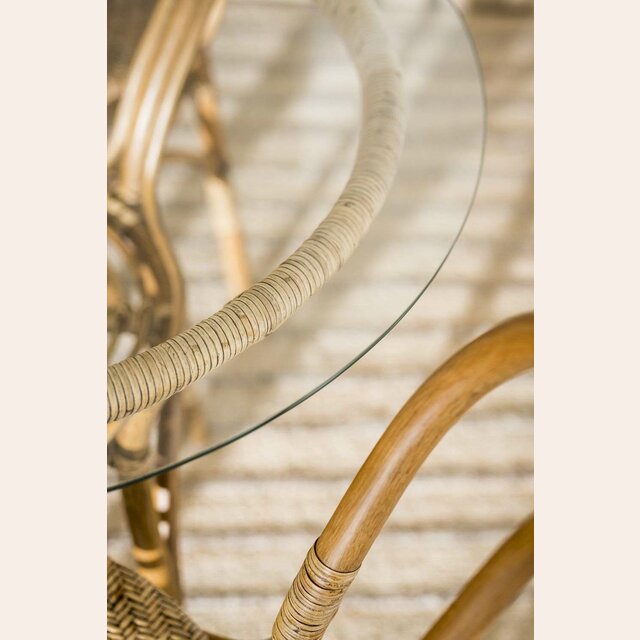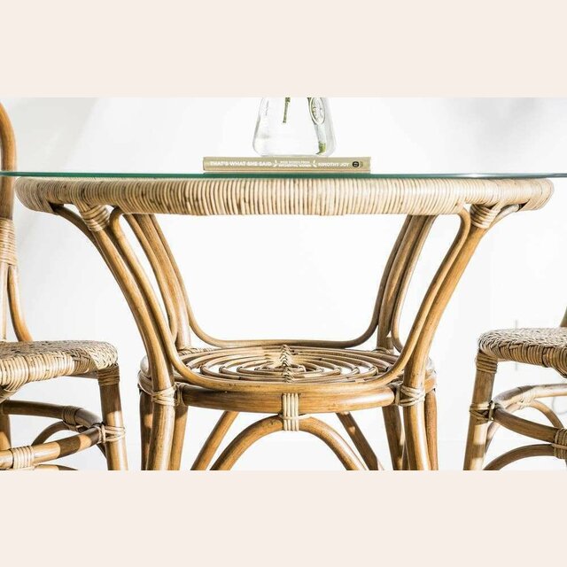 Mesa redonda de bamboo, rattan y tapa de vidrio en un tamaño ideal para rincones con espacio limitado de comedor.