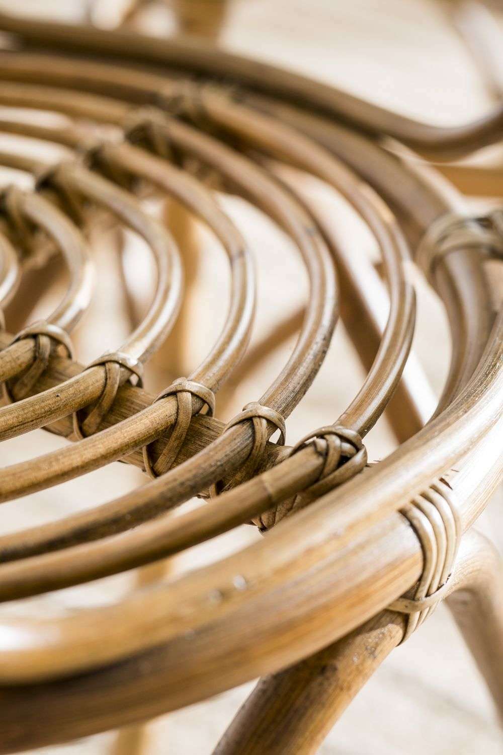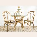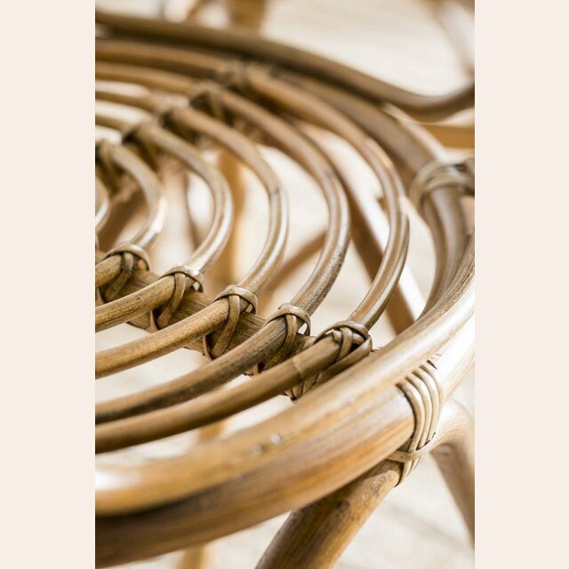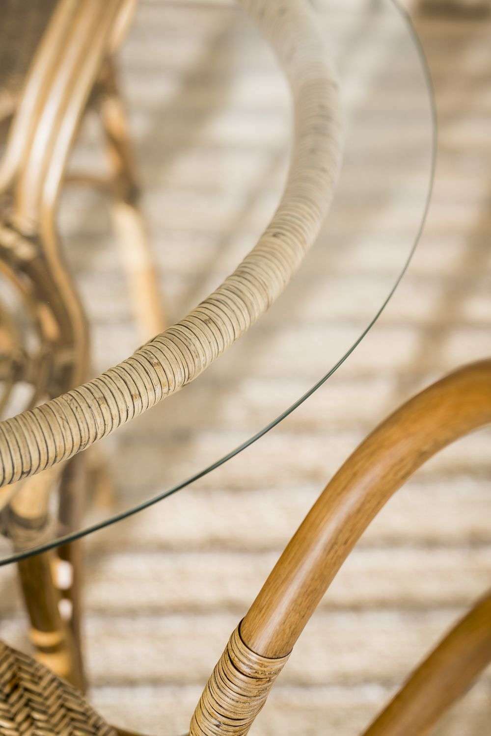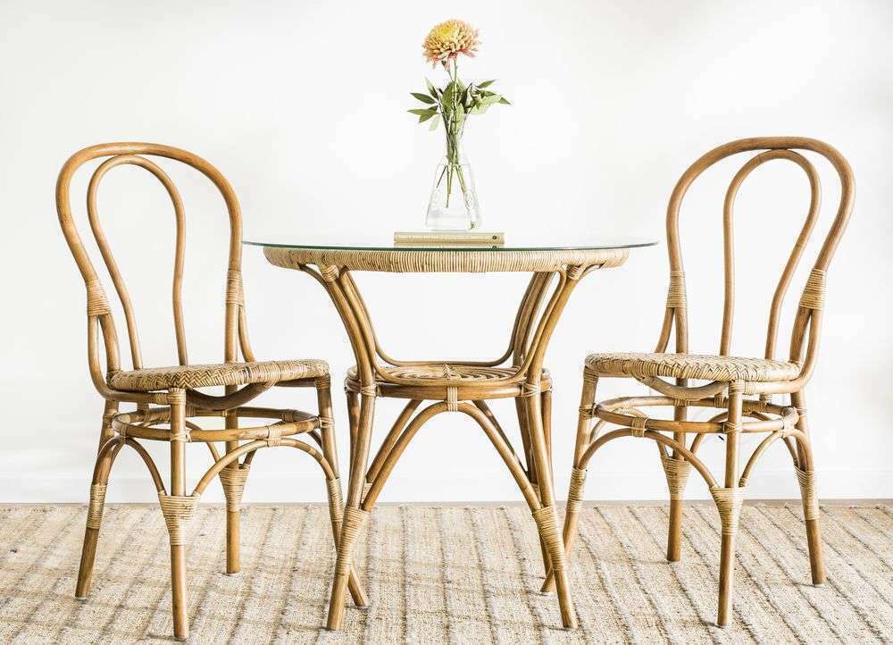 Mesa redonda de bamboo, rattan y tapa de vidrio en un tamaño ideal para rincones con espacio limitado de comedor.