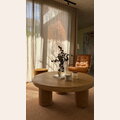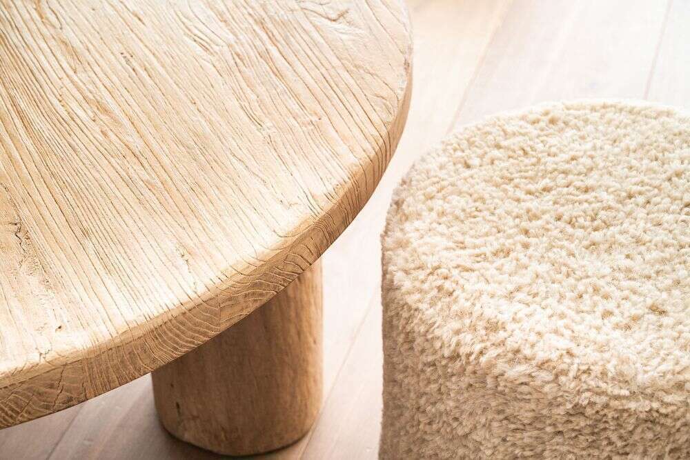 Divina mesa redonda de olmo antiguo reciclado en lustre natural con de troncos.