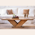 Mesa ratona de olmo antiguo natural con gran pie macizo central maciza y tapa de suaves terminaciones curvas.