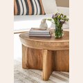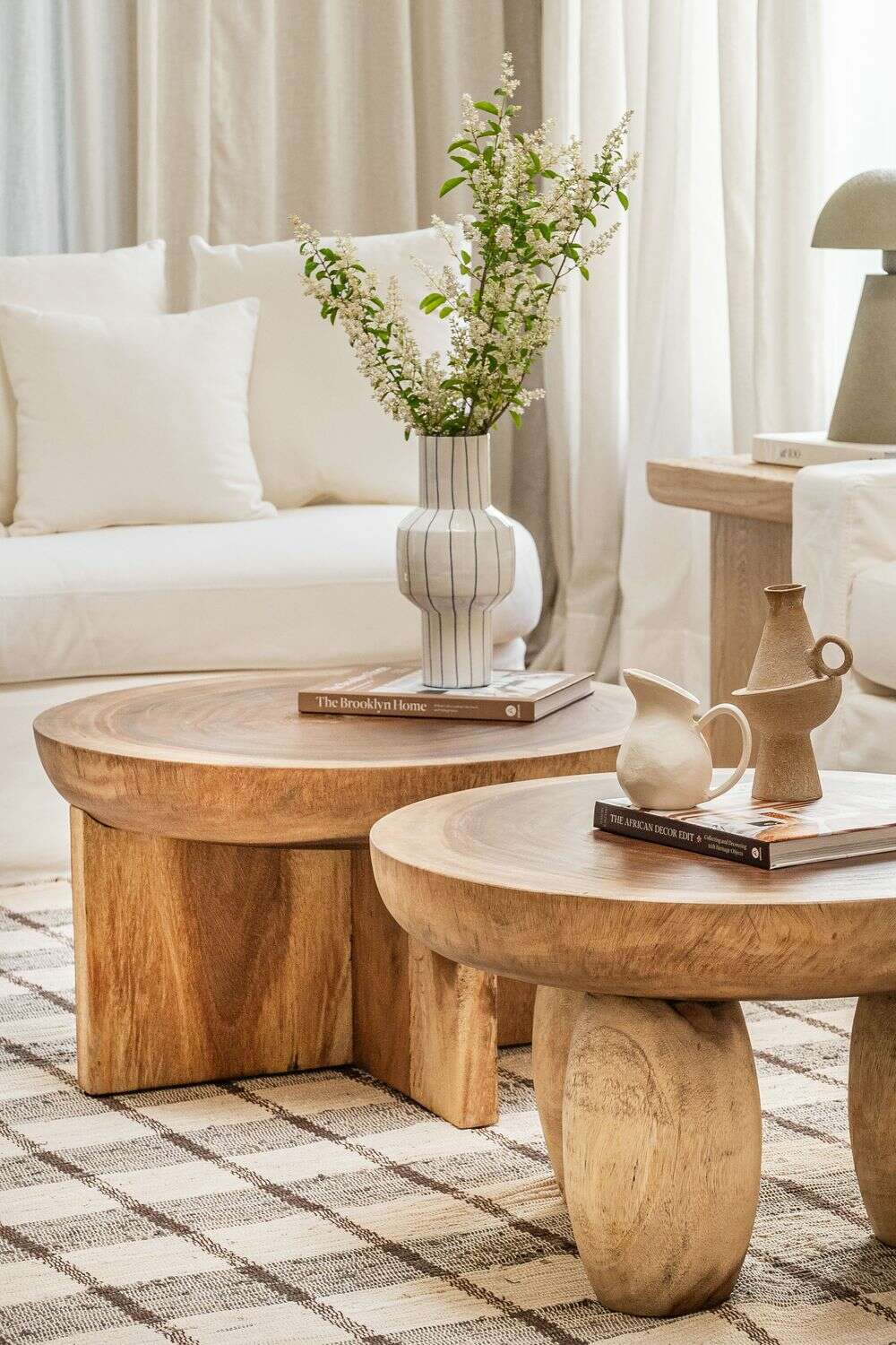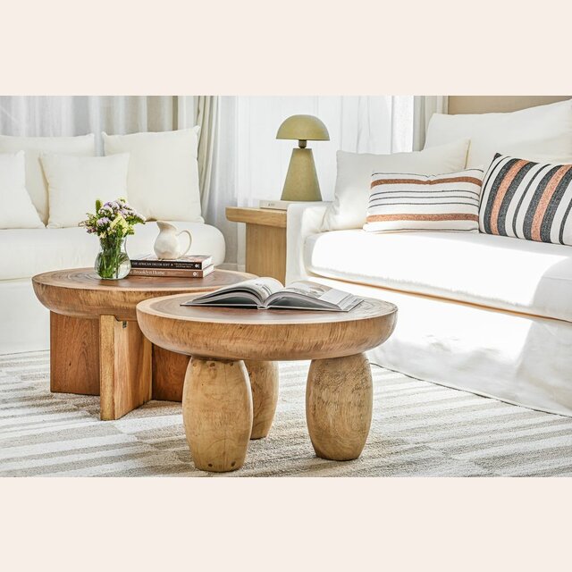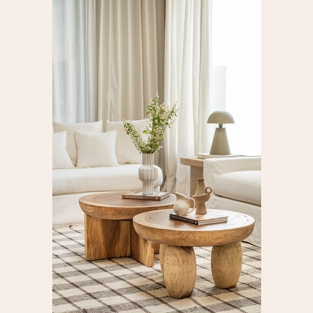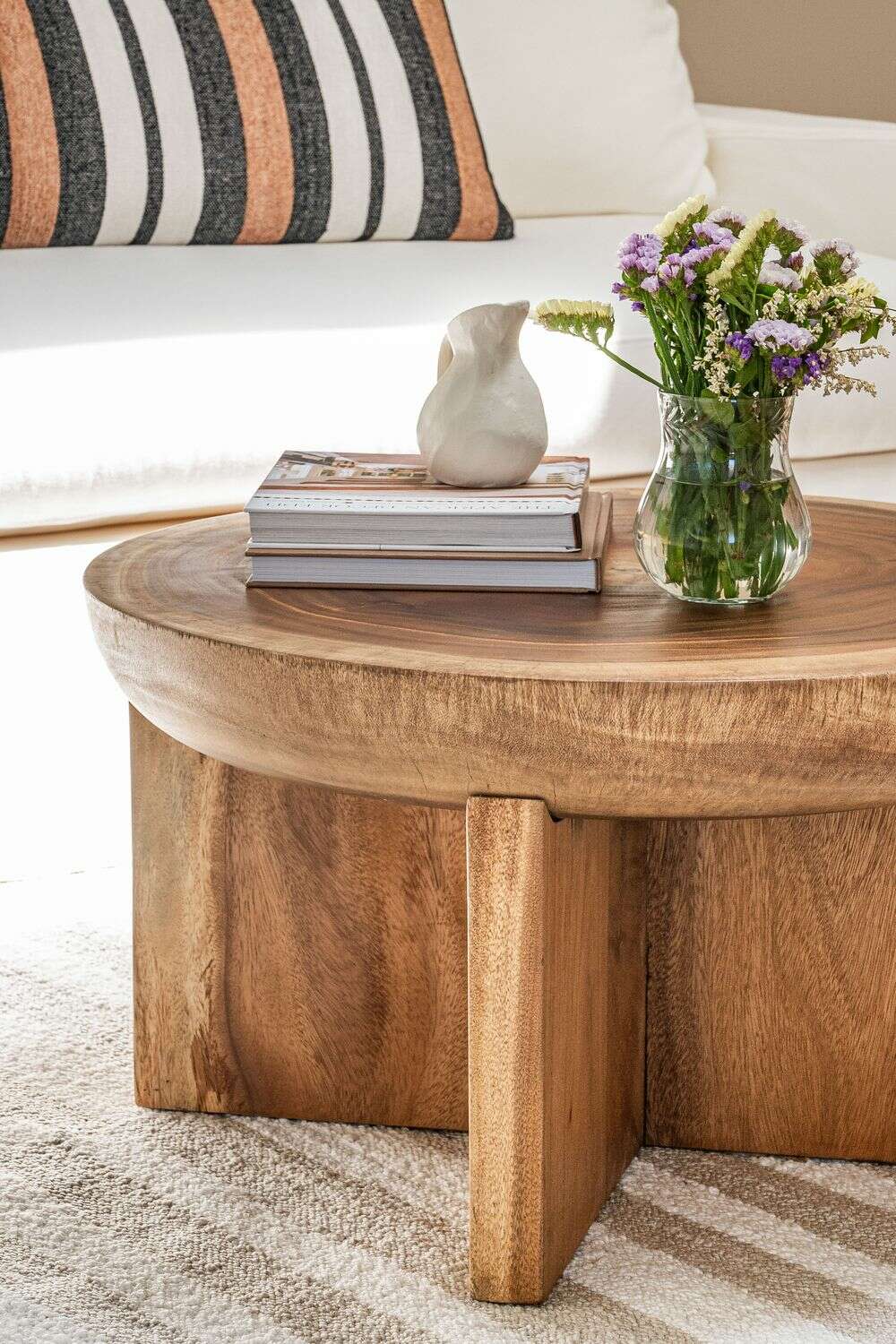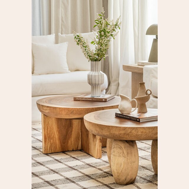 Mesa de centro en madera maciza de árbol de suar, lustre suavemente tostado.