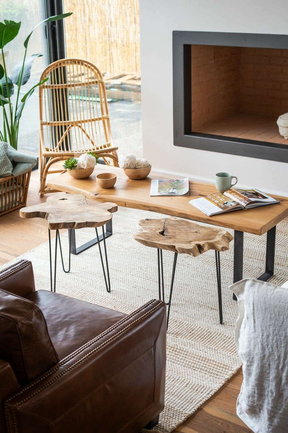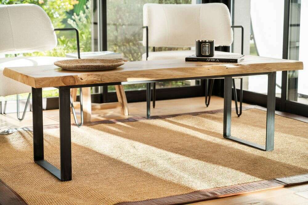 Mesa de living angosta con tronco irregular de ciprés macizo lustrado natural y patas de hierro rectas.