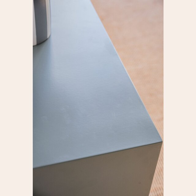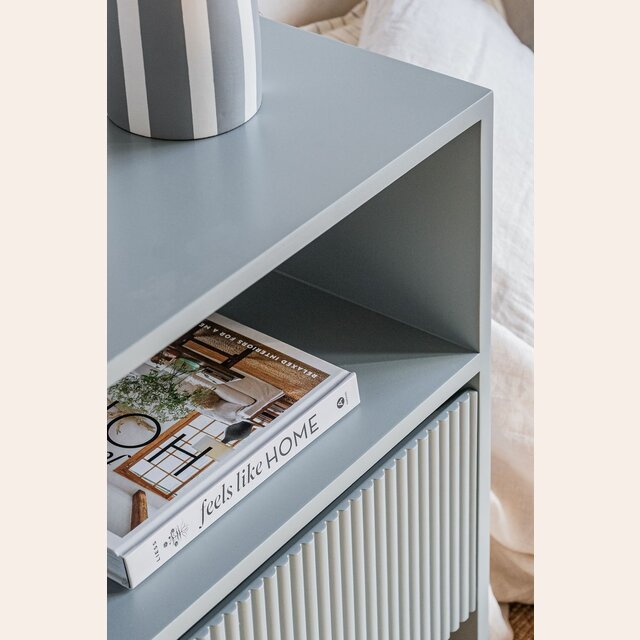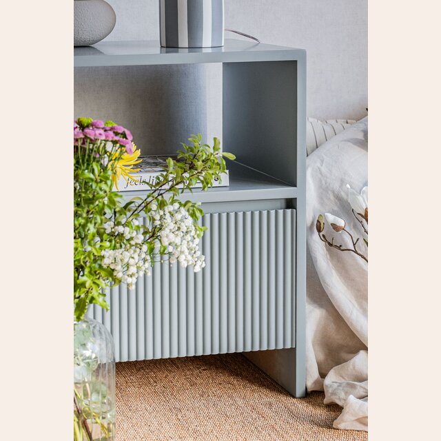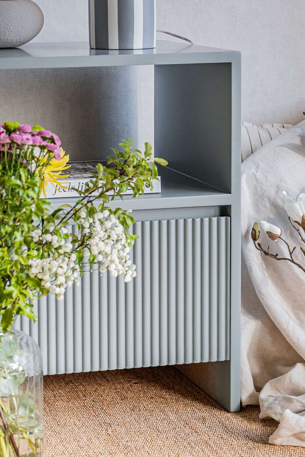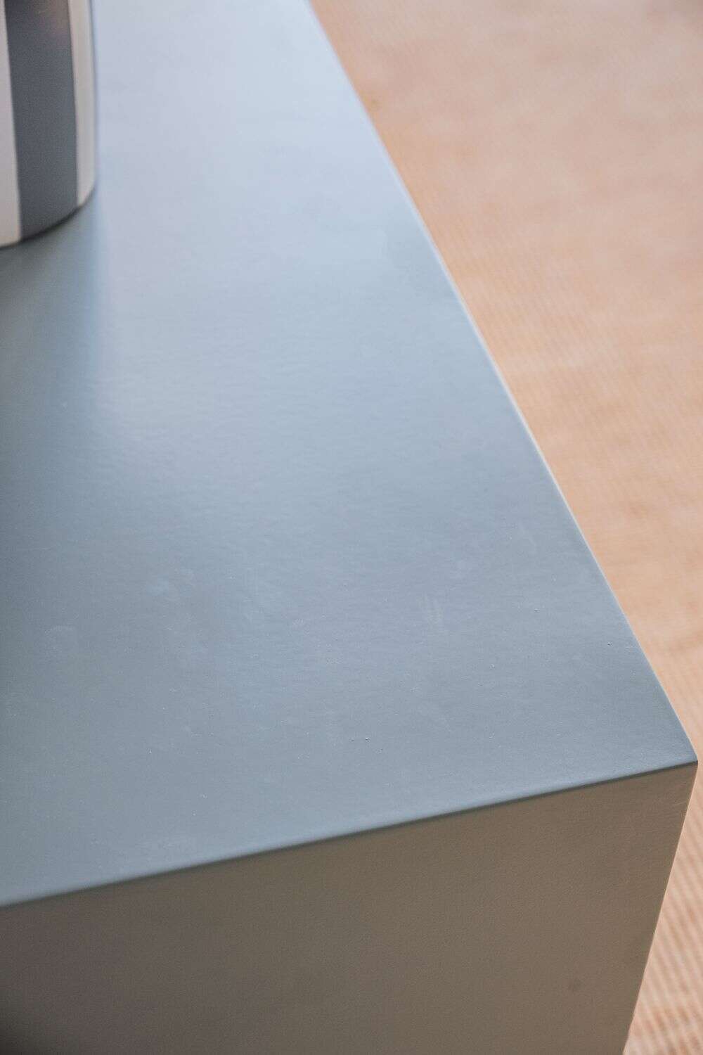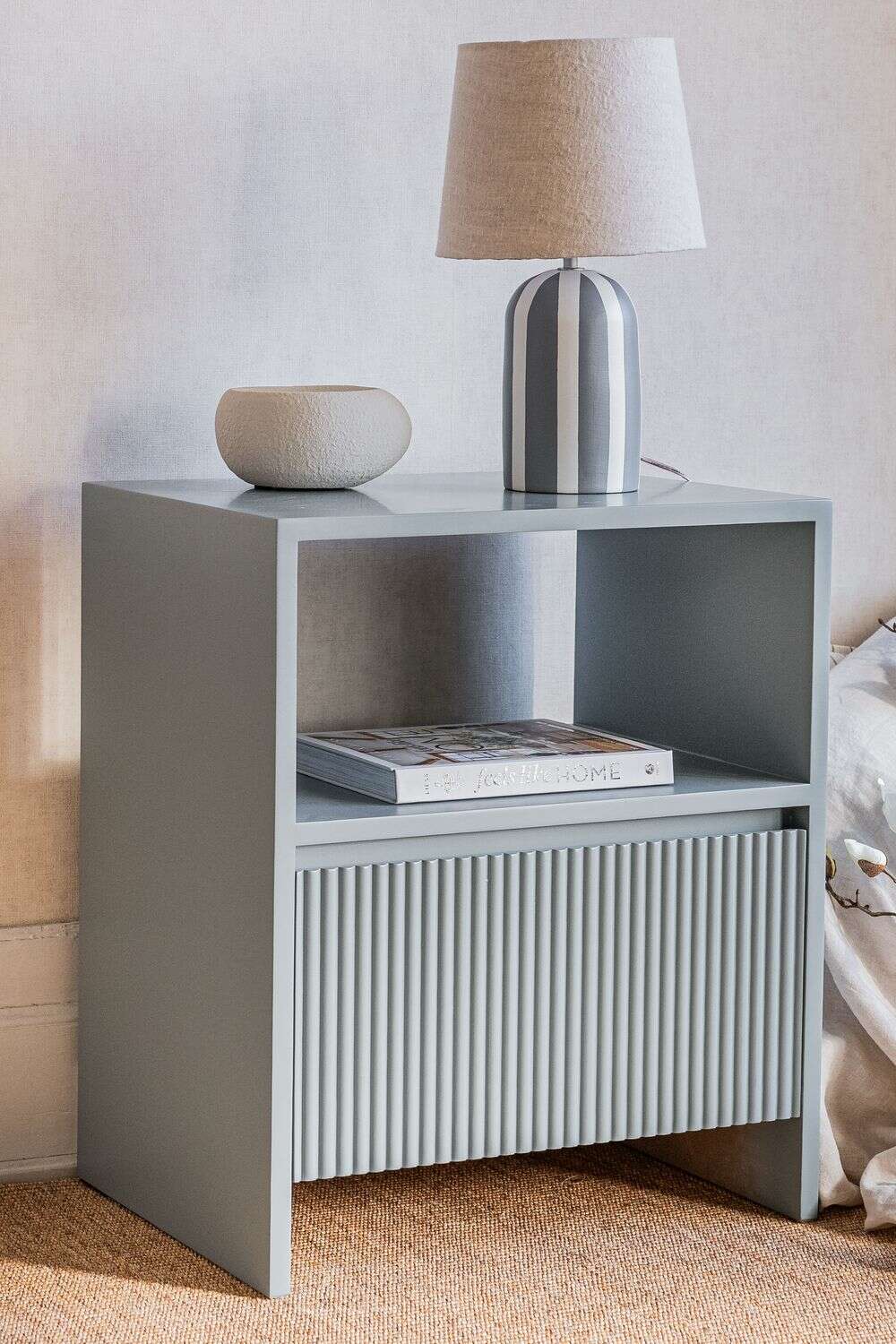 Mesa de luz de multiplaca melamínica espesor 2mm, laqueada en color gris celestón ("nube"): un color con fuerza pero muy combinable, unisex y perfecto para combinar con textiles y texturas diversas por su superficie lisa.