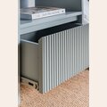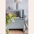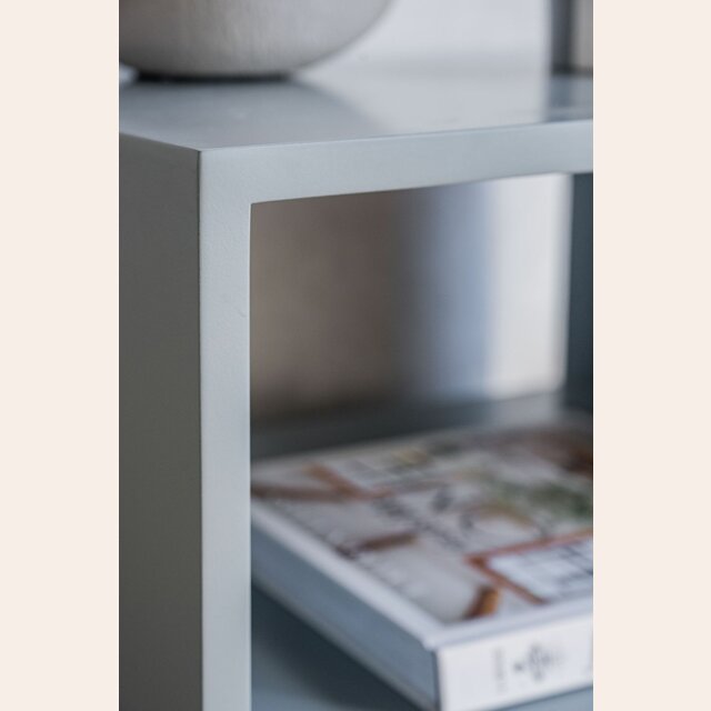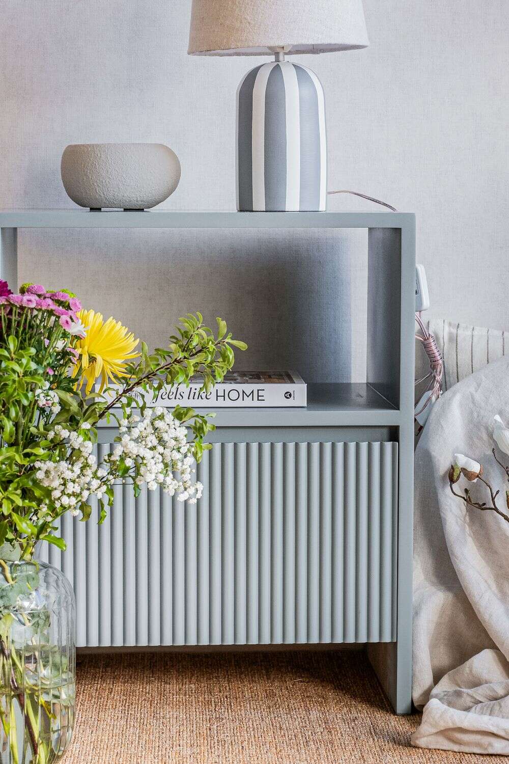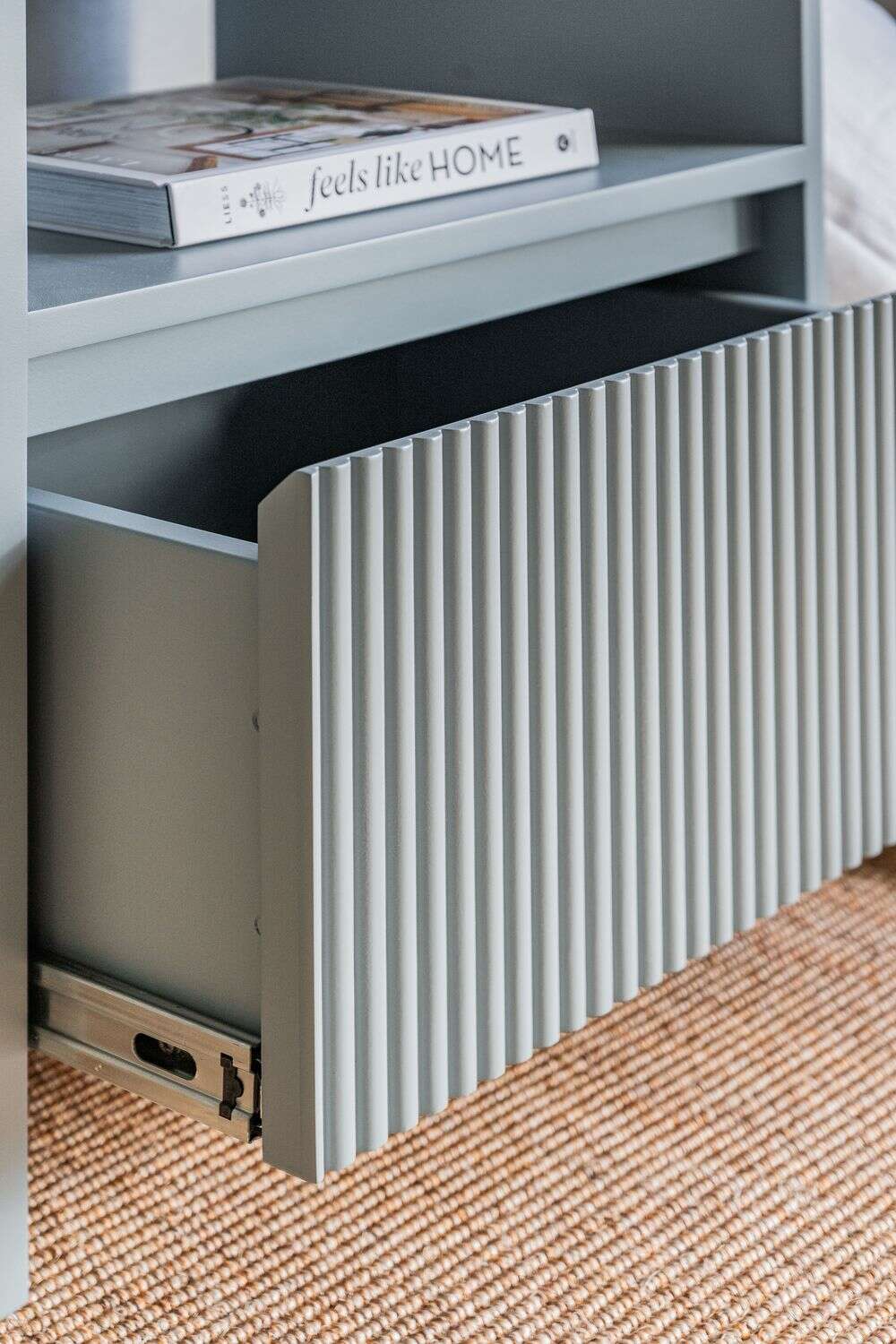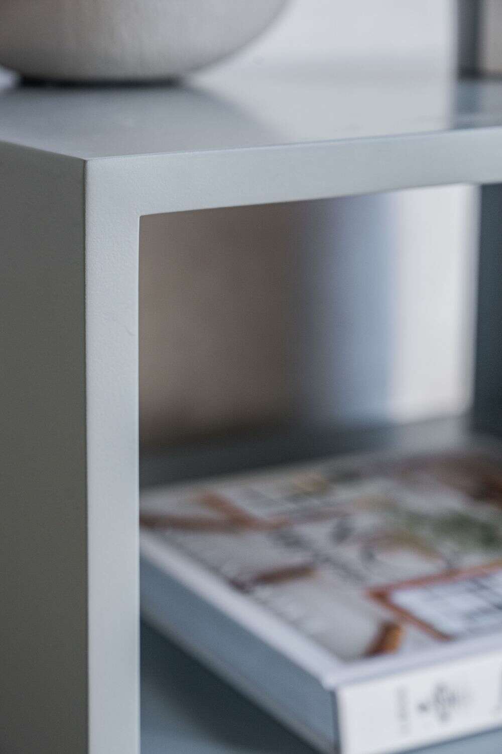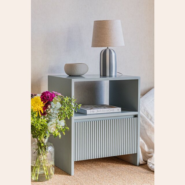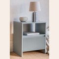 Mesa de luz de multiplaca melamínica espesor 2mm, laqueada en color gris celestón ("nube"): un color con fuerza pero muy combinable, unisex y perfecto para combinar con textiles y texturas diversas por su superficie lisa.