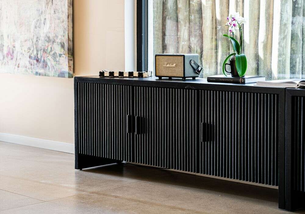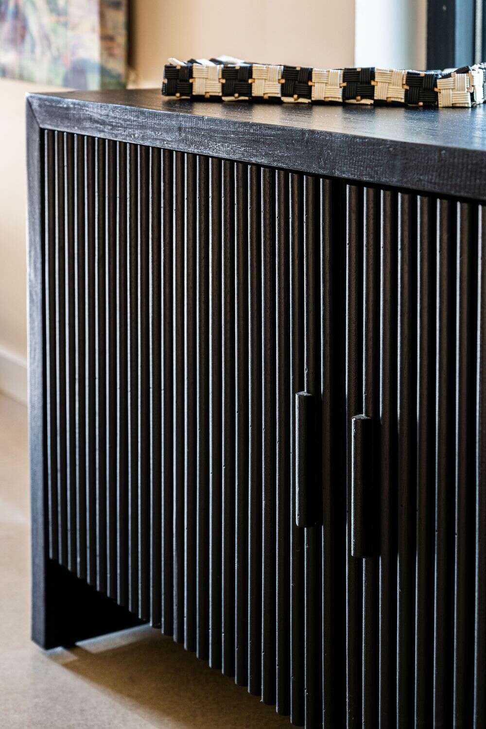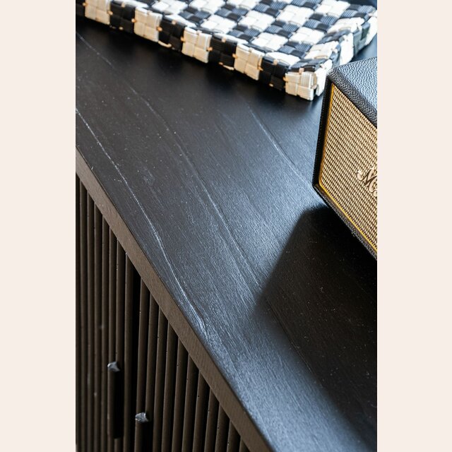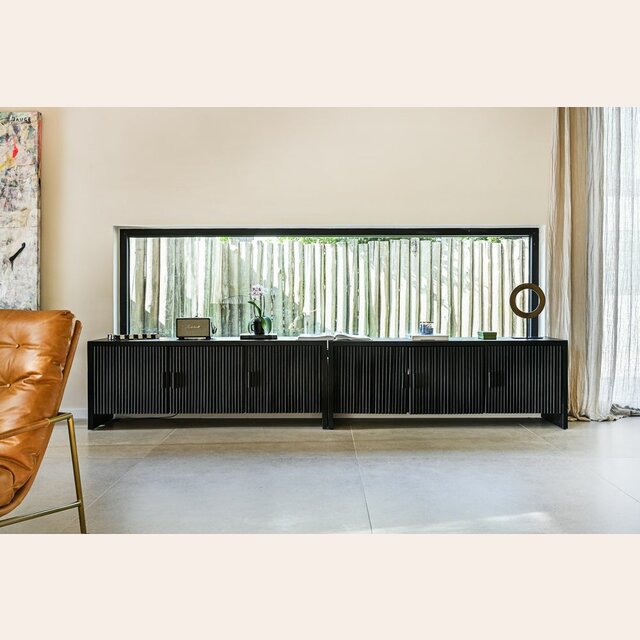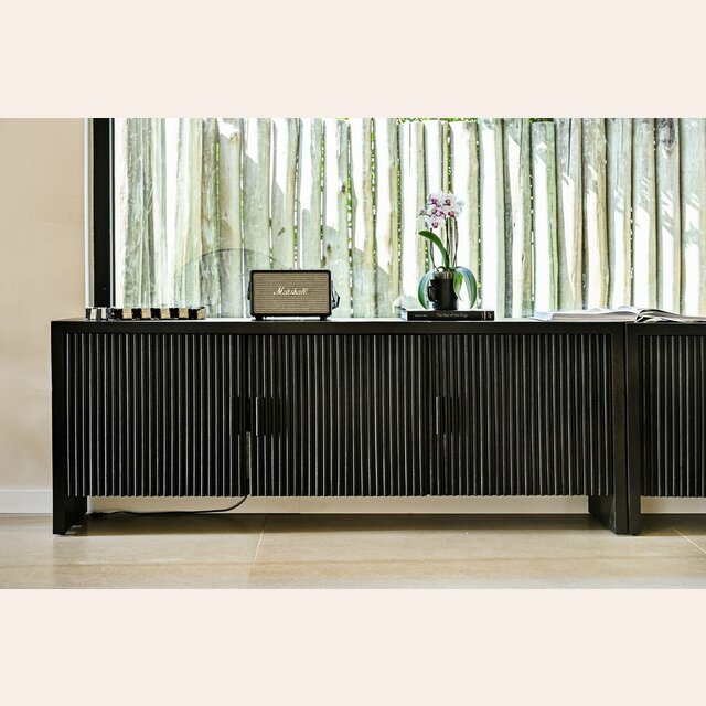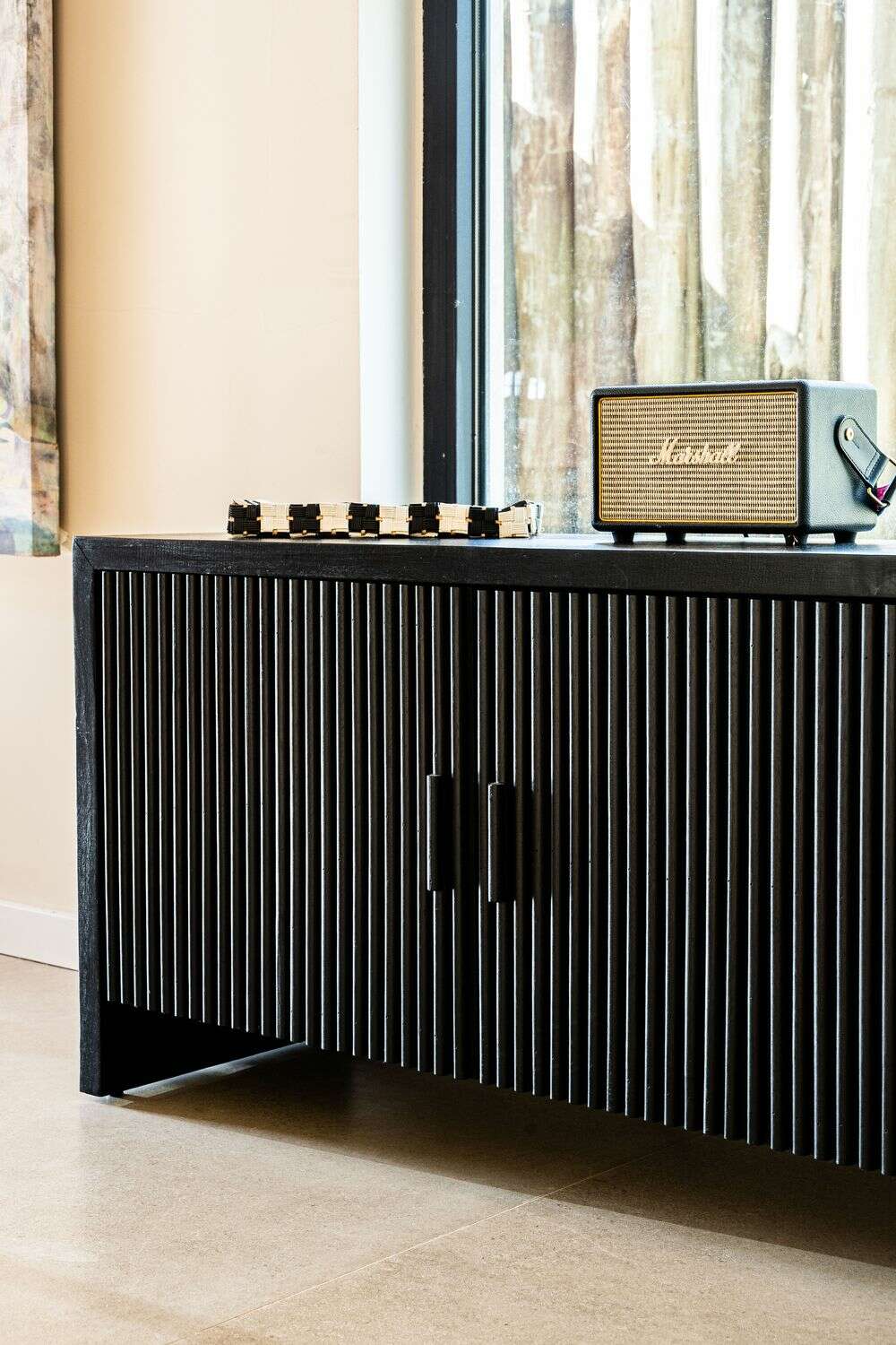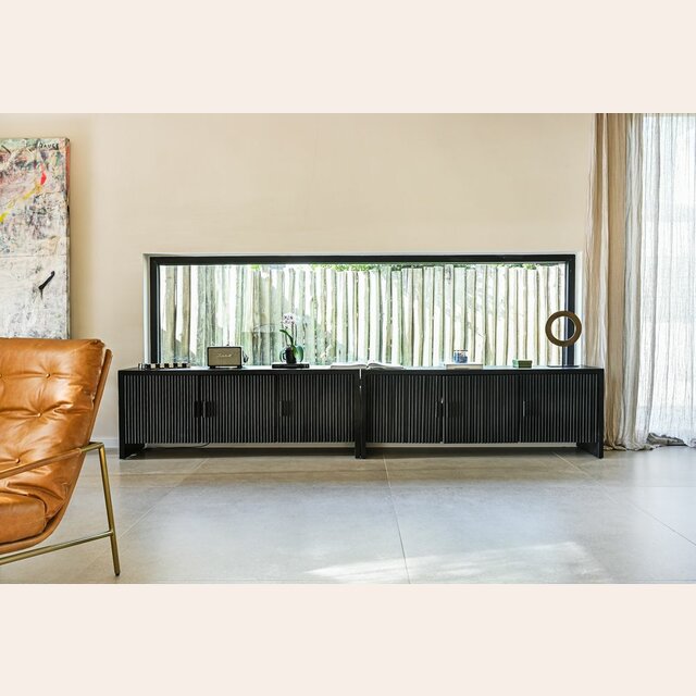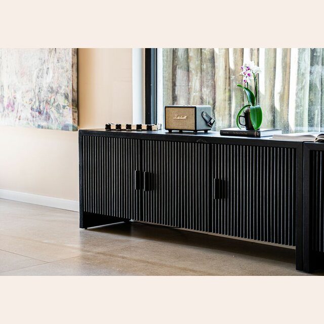 Versión con puertas del favorito rack Studio, en álamo macizo lustre total black.