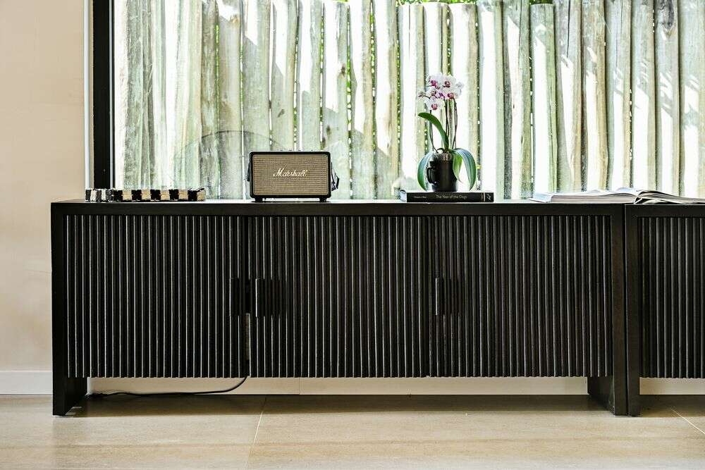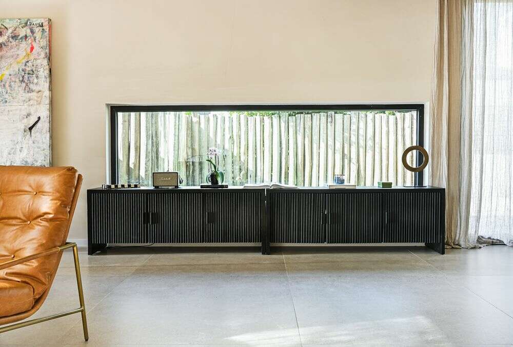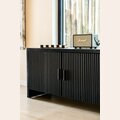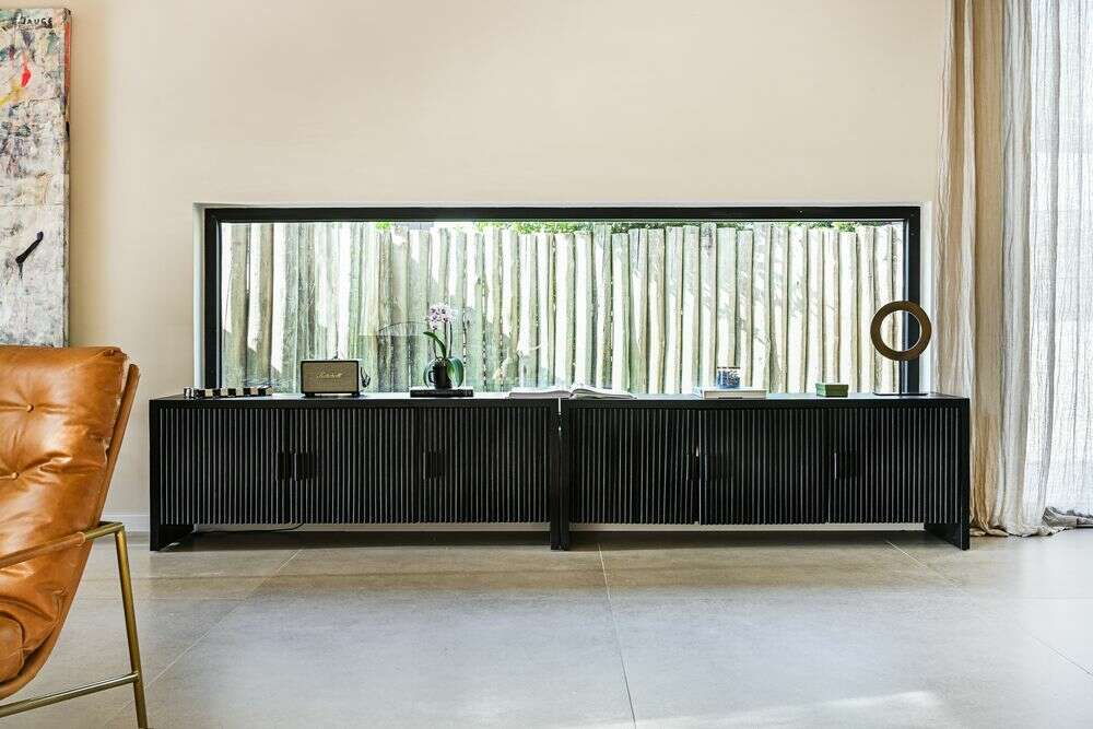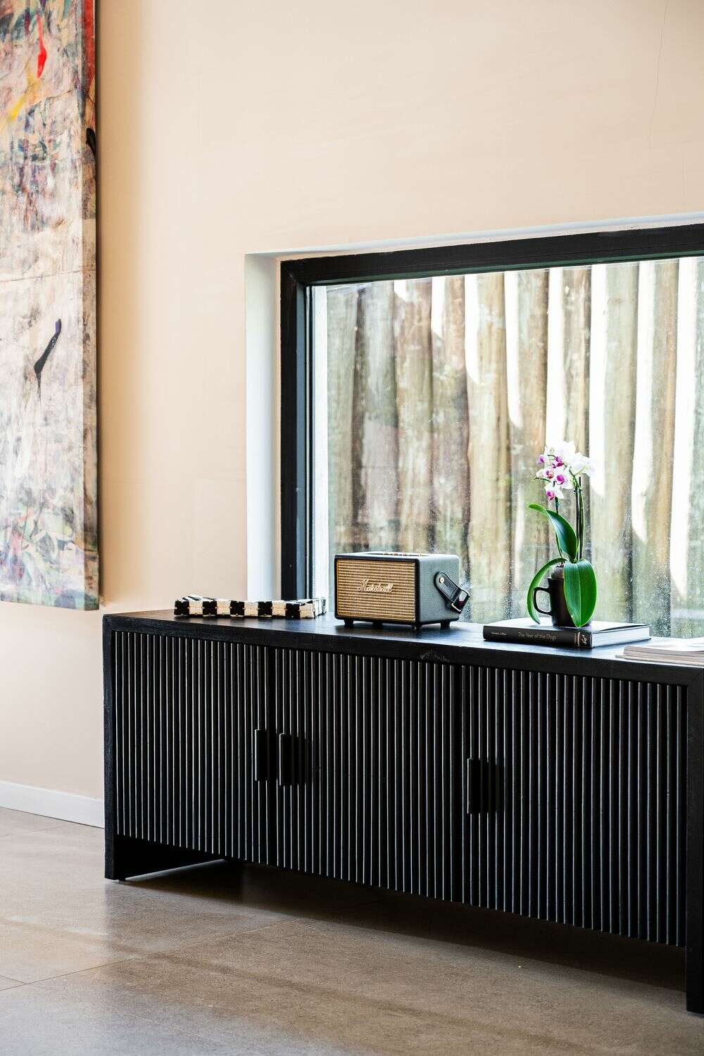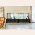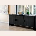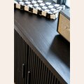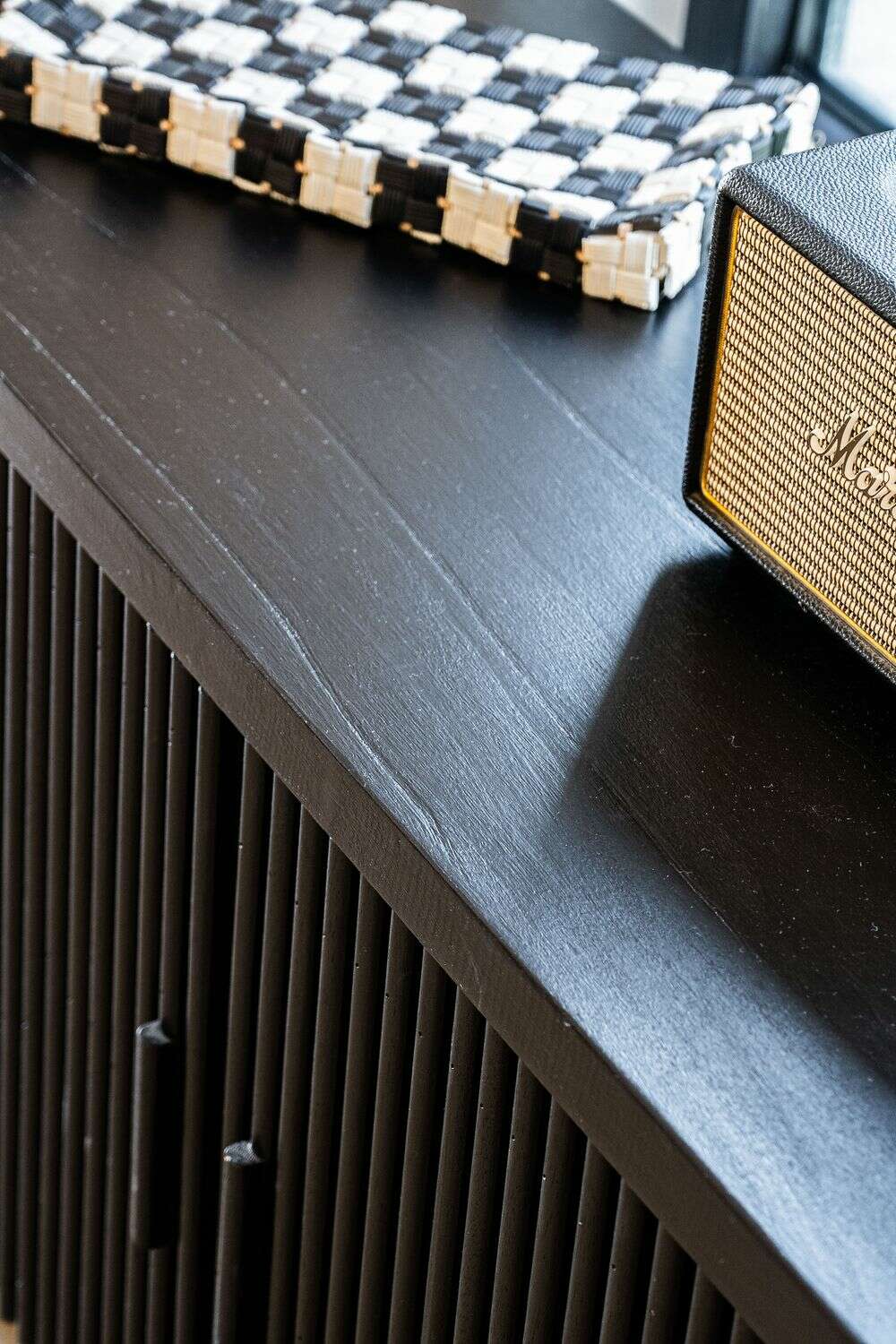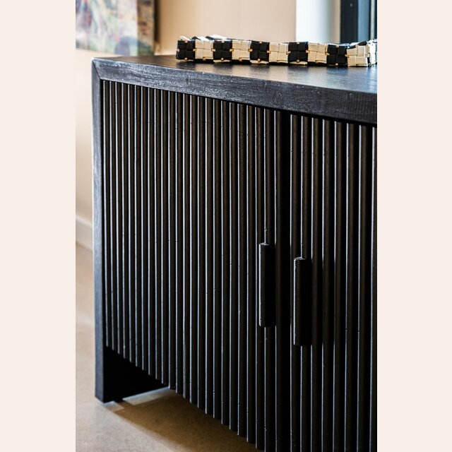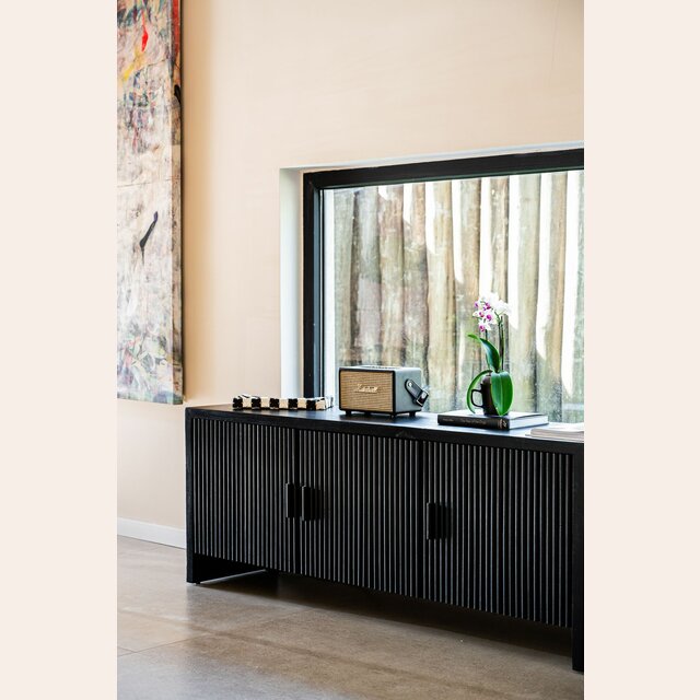 Versión con puertas del favorito rack Studio, en álamo macizo lustre total black.