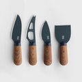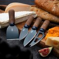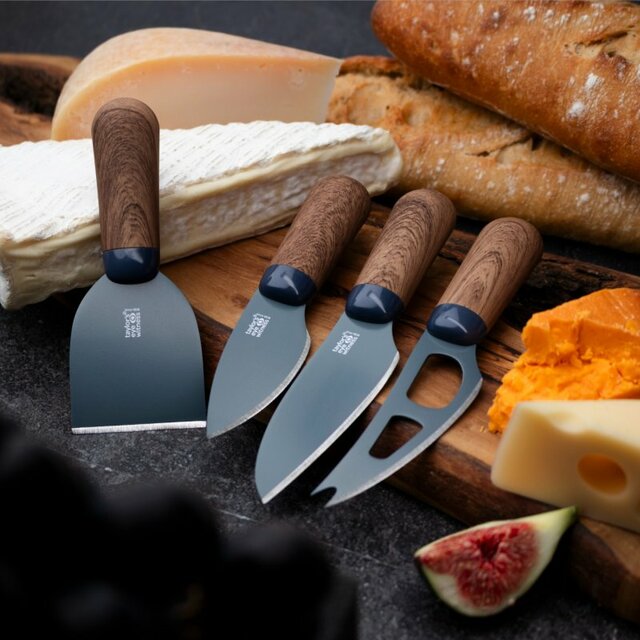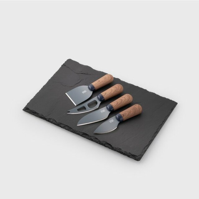 Contiene: 1 tabla de pizarra y 4 cuchillos de queso con cuerpo de acero y recubrimiento cerámico color gris y mango ergonómico en madera de nogal.