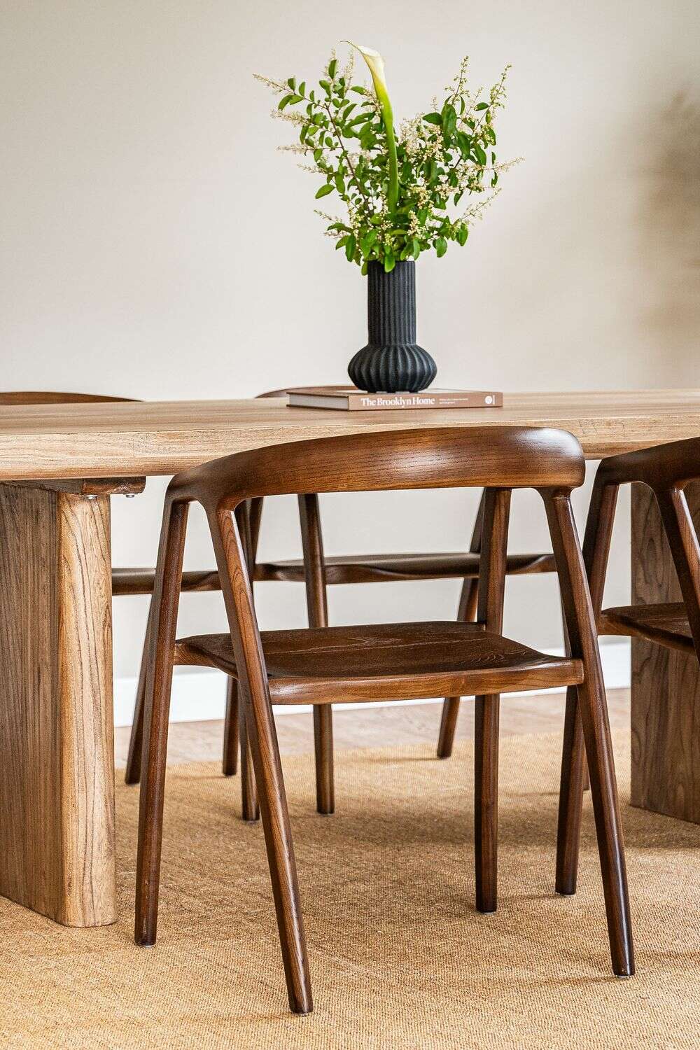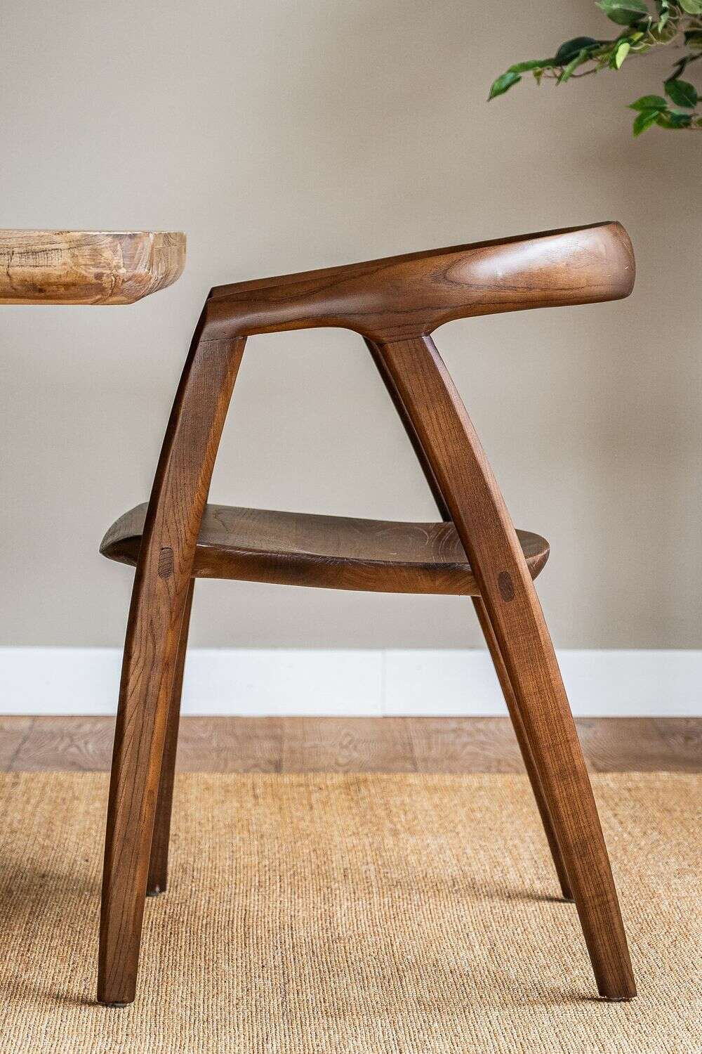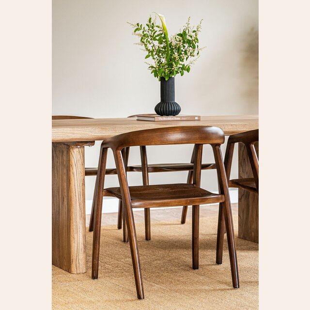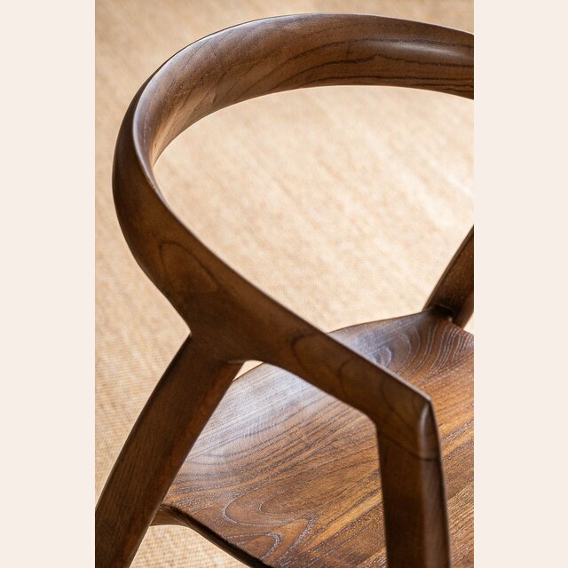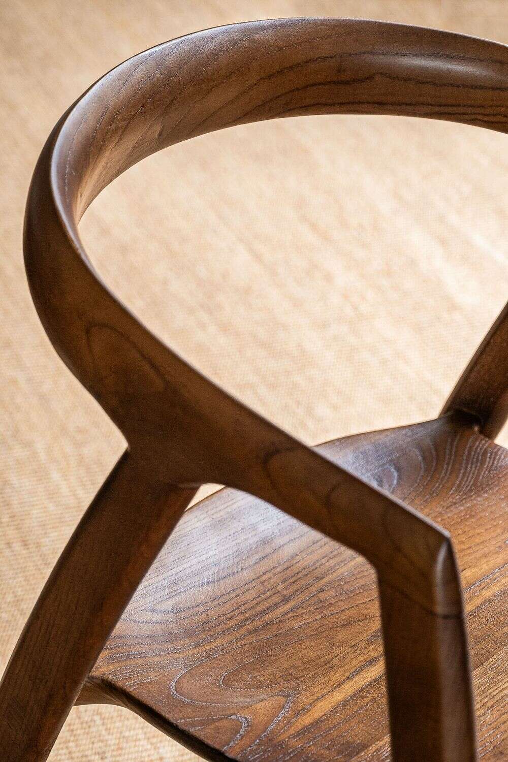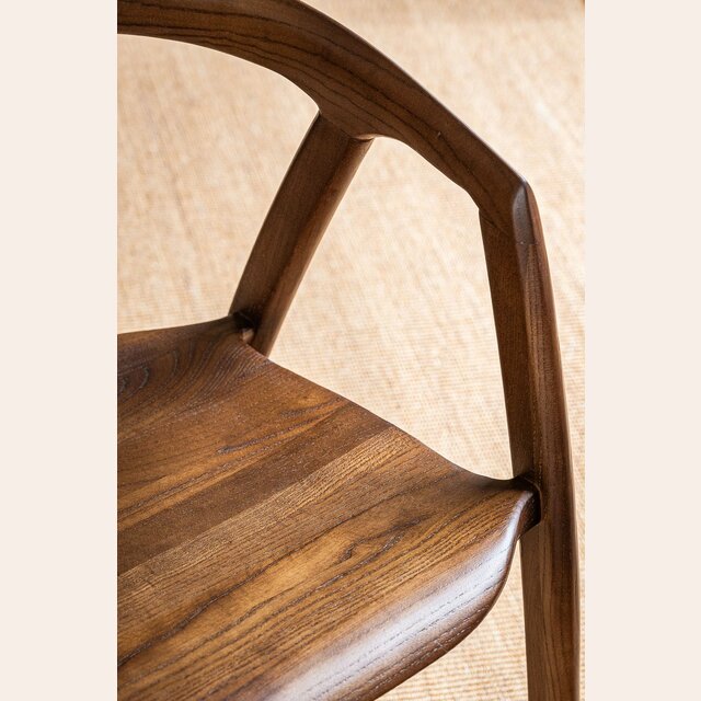 Asiento ergonómico y diseño curvo en madera maciza de olmo en lustre avellana.
