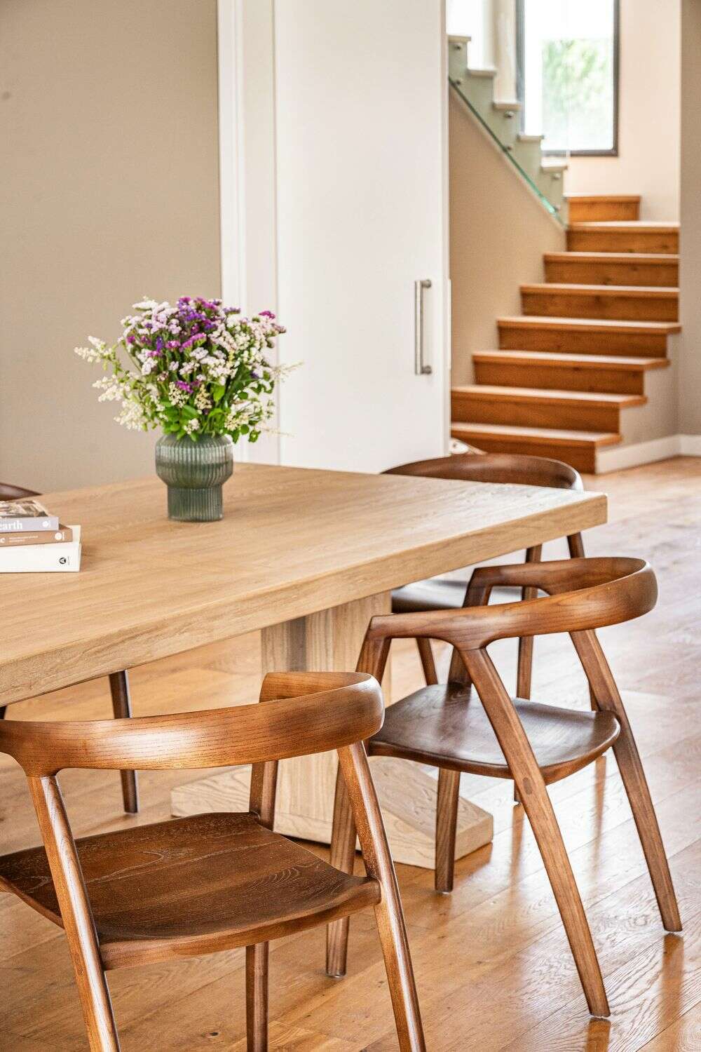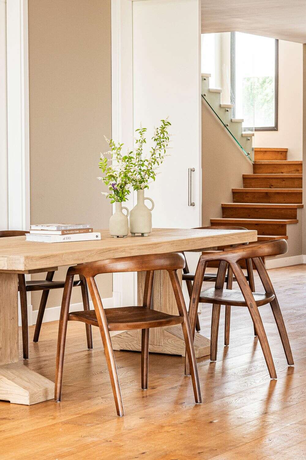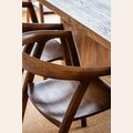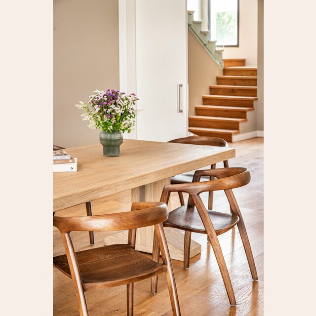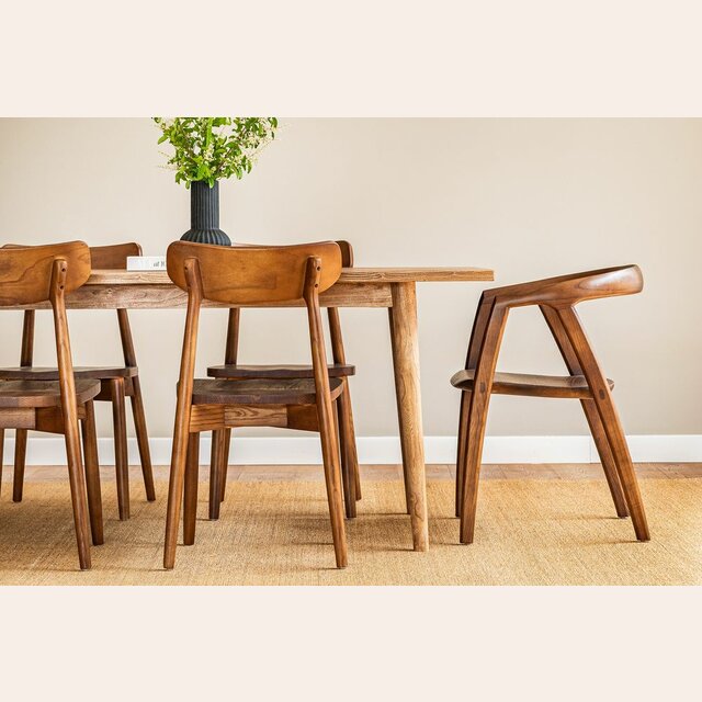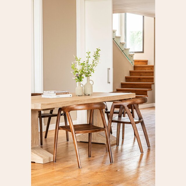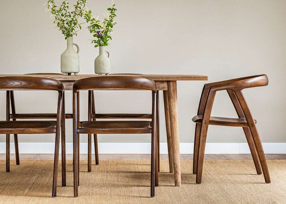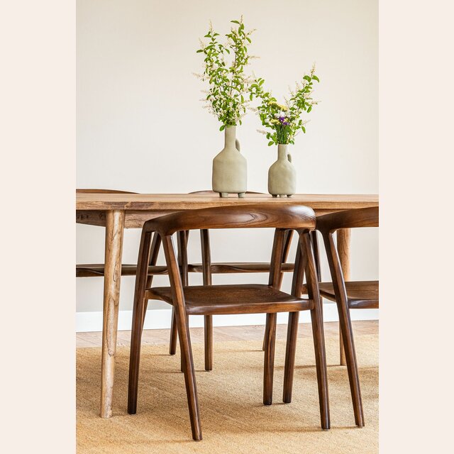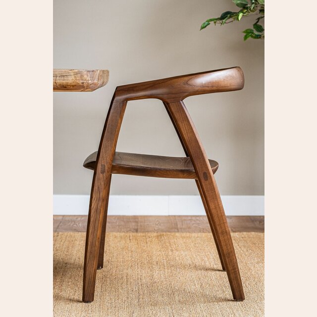 Asiento ergonómico y diseño curvo en madera maciza de olmo en lustre avellana.