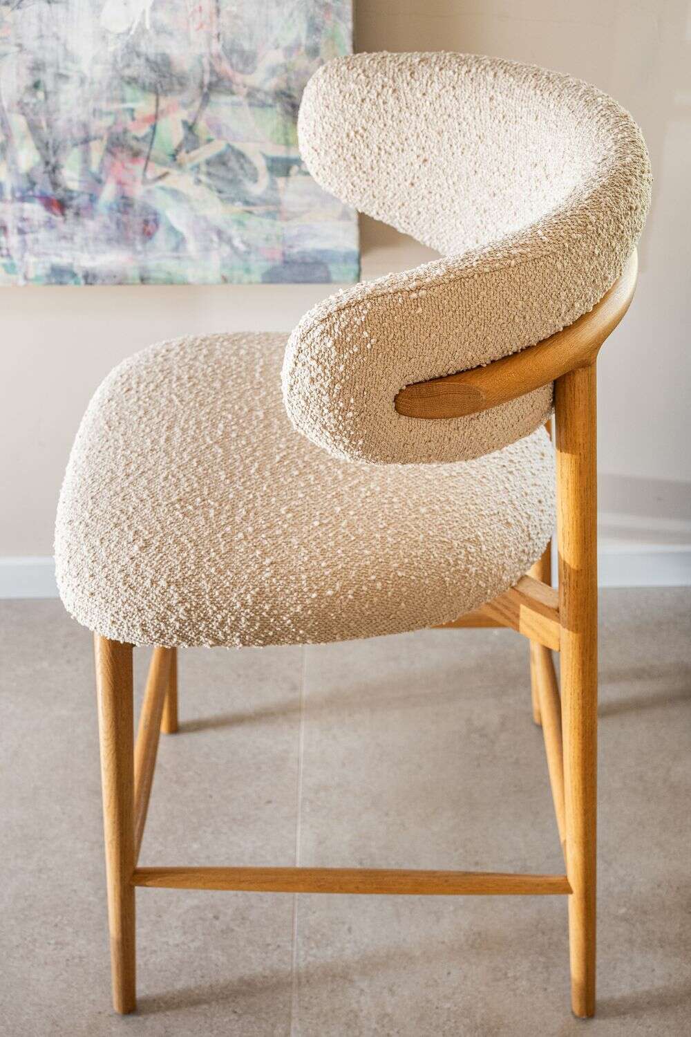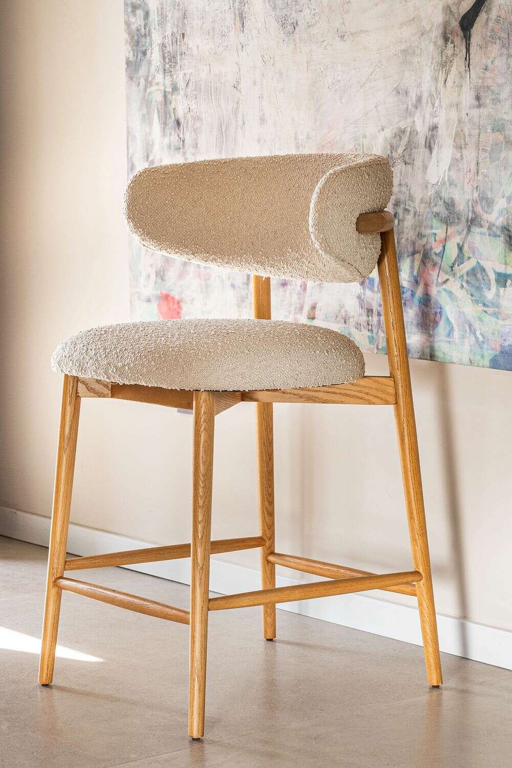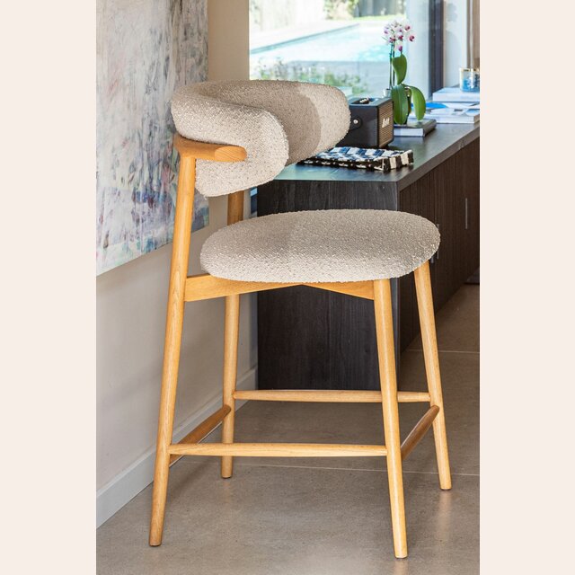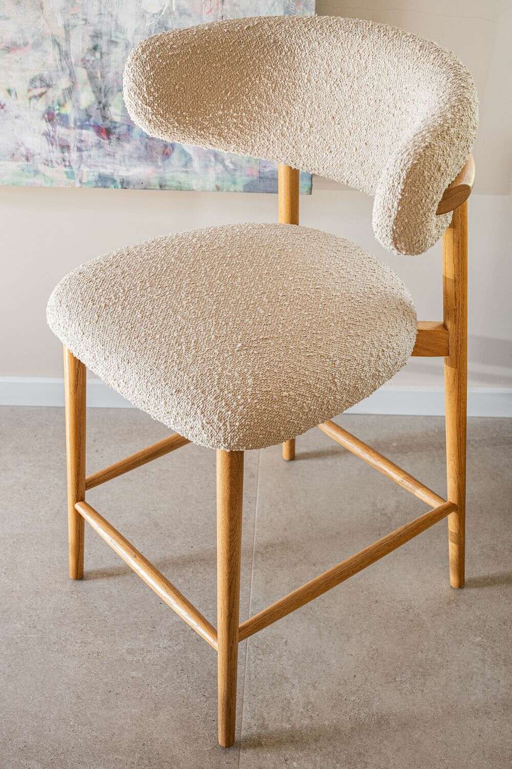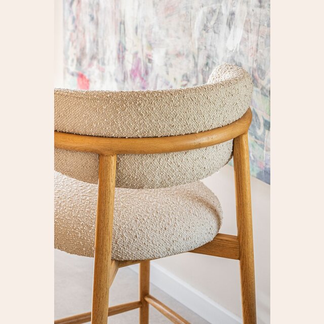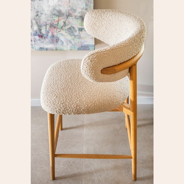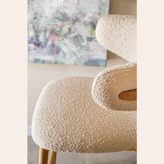 Fresno macizo en lustre natural y tapizado bouclé crudo.