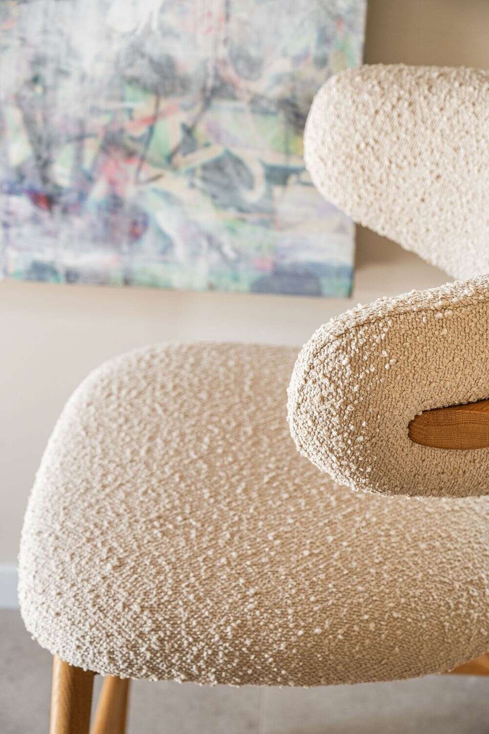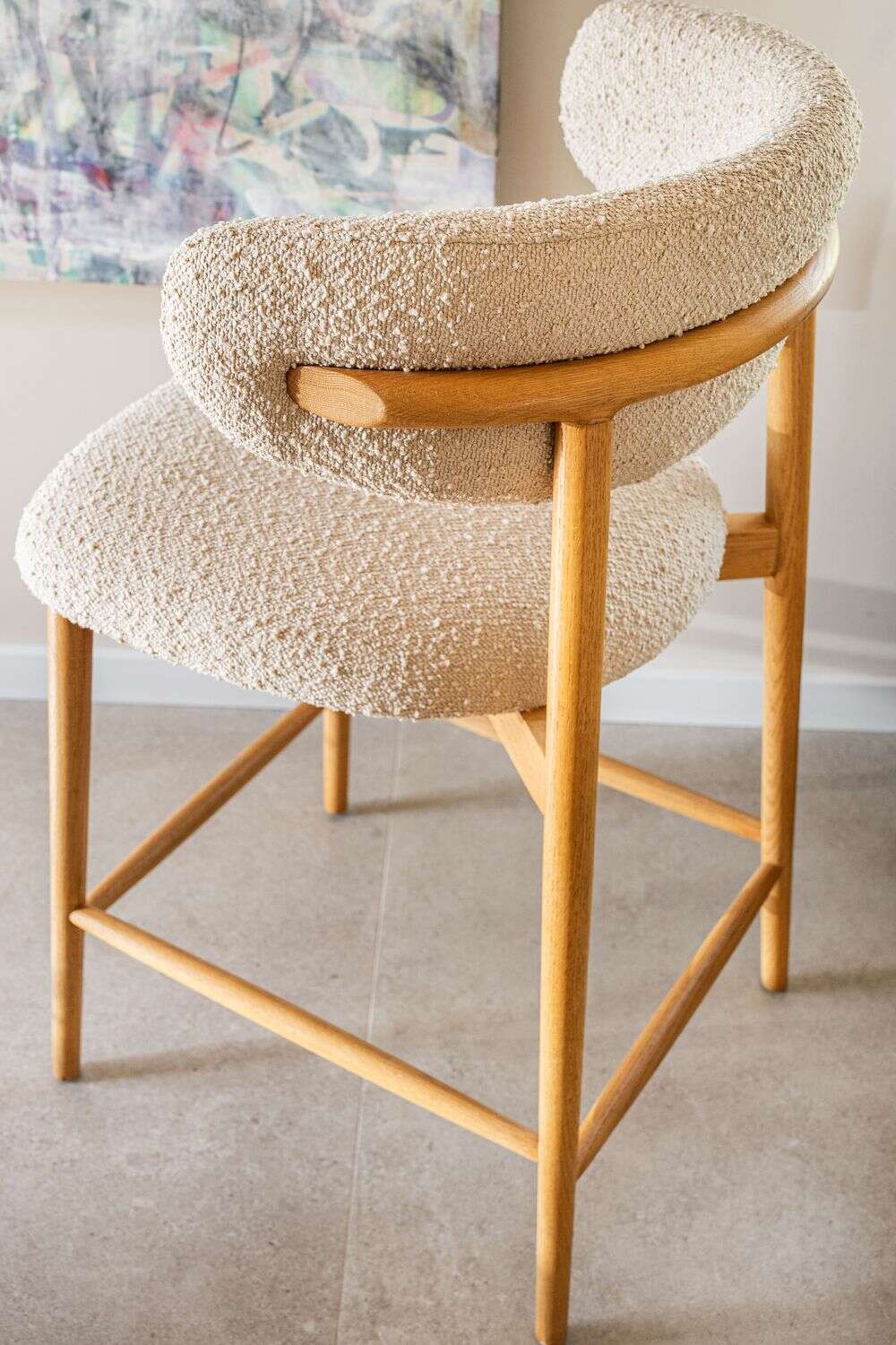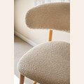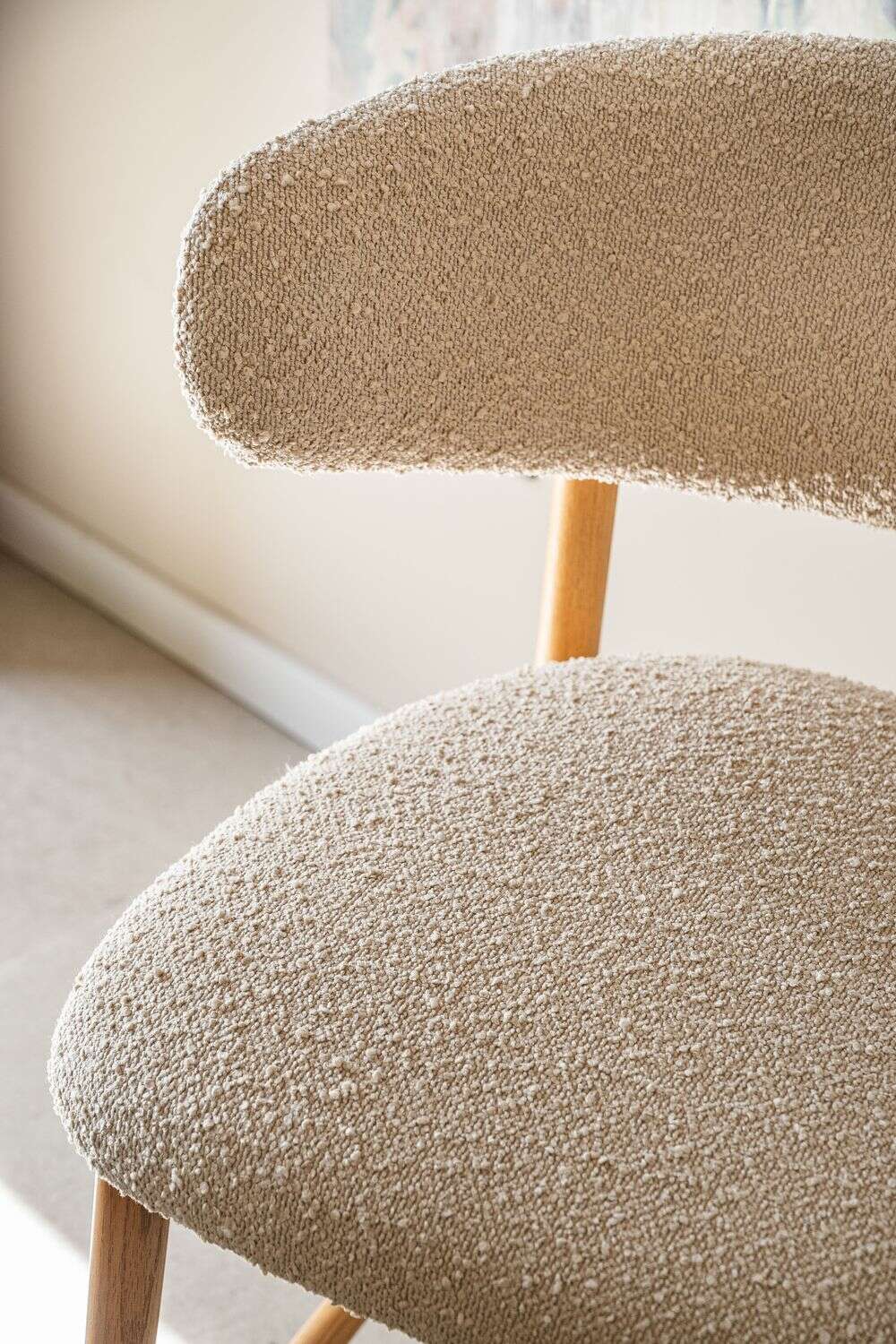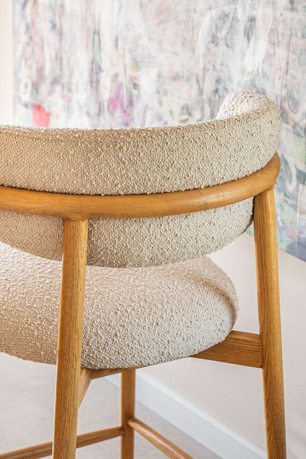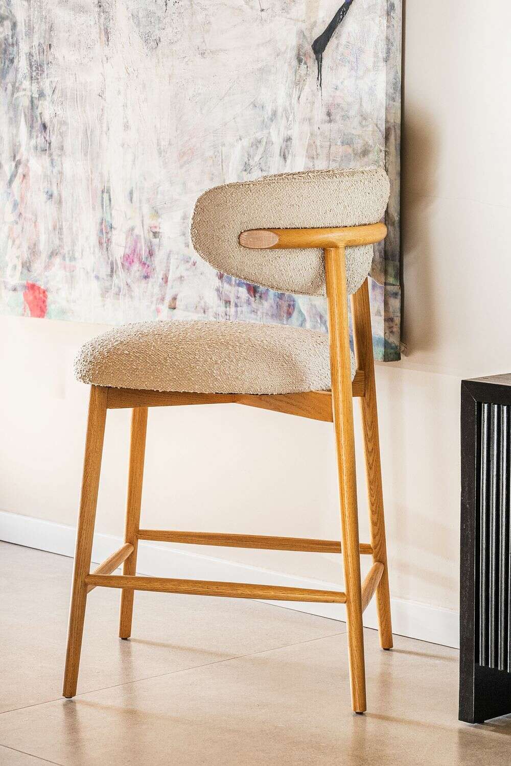 Fresno macizo en lustre natural y tapizado bouclé crudo.
