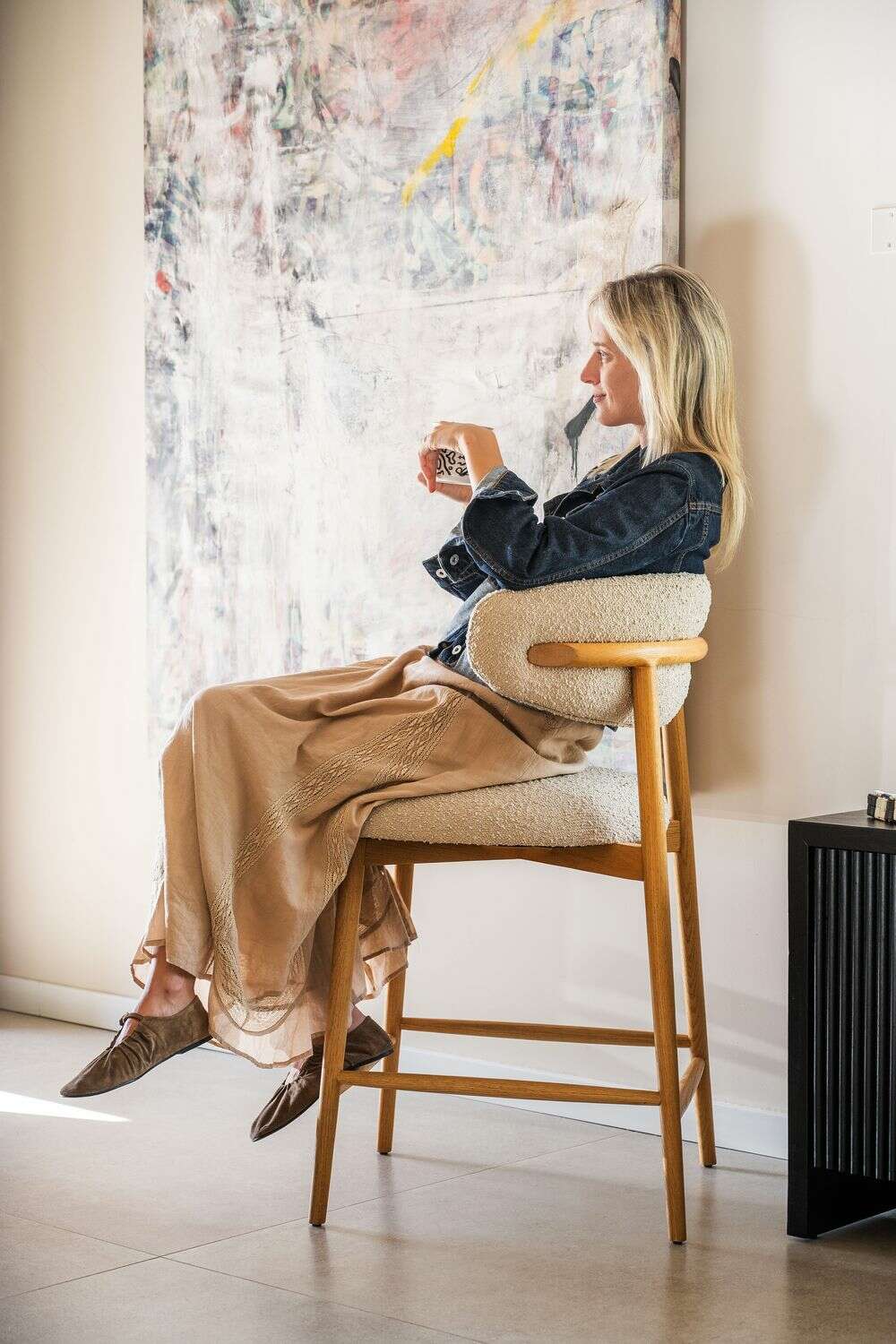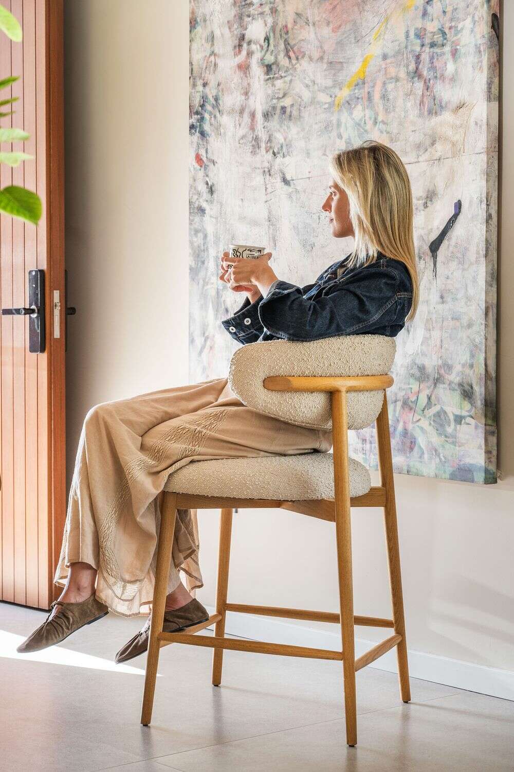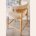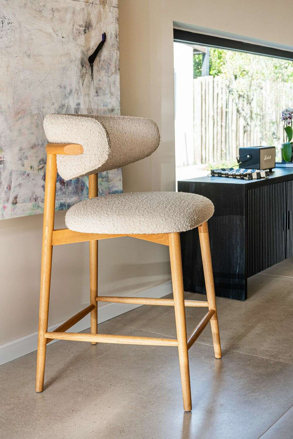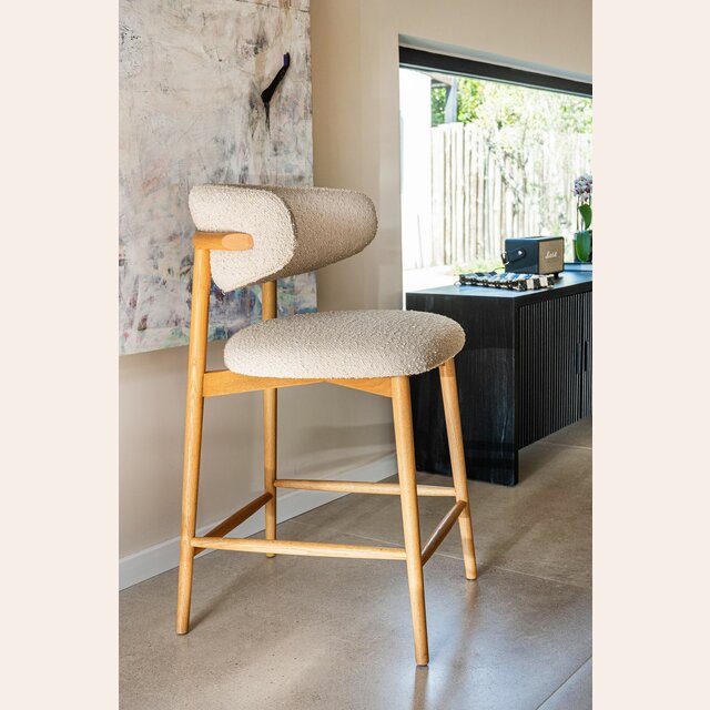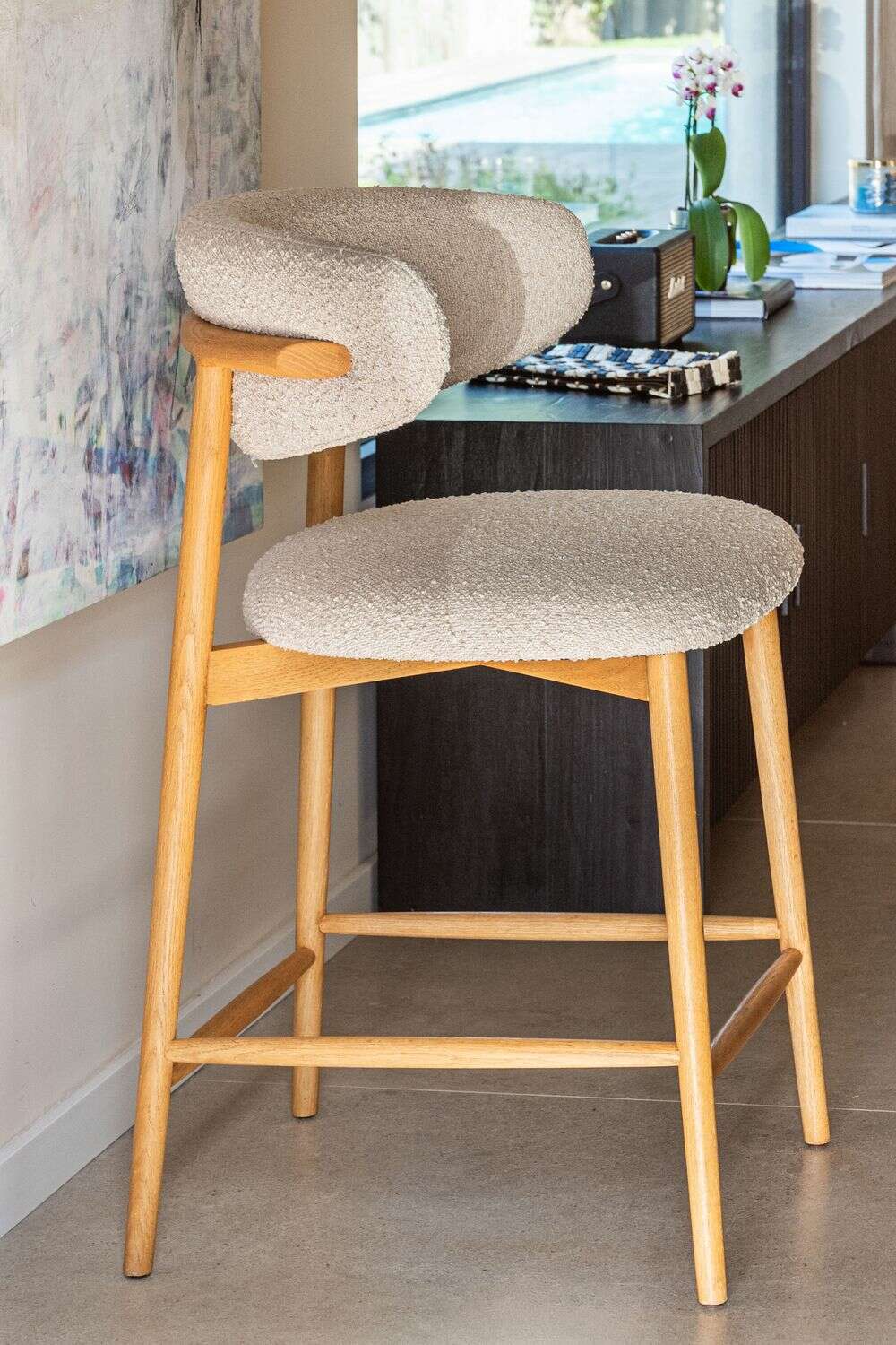 Fresno macizo en lustre natural y tapizado bouclé crudo.