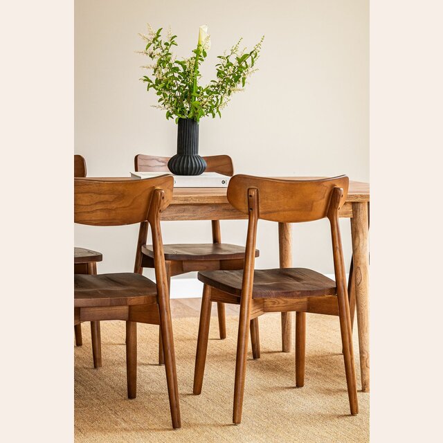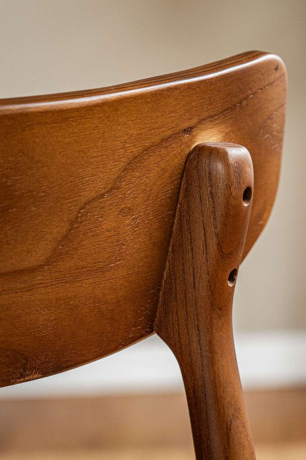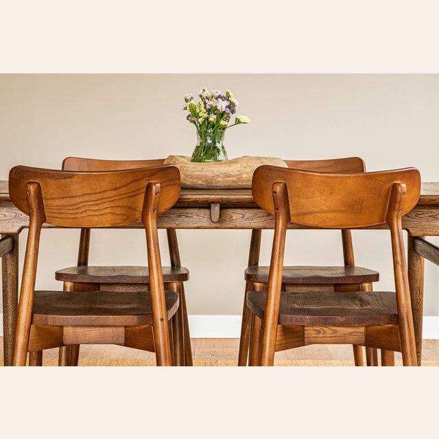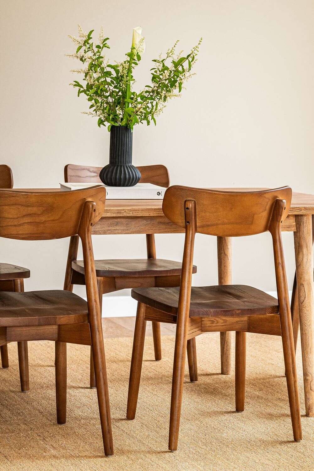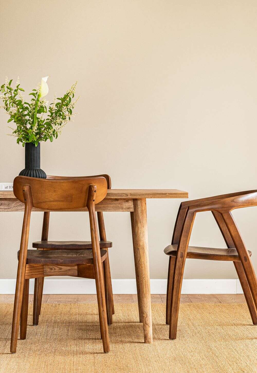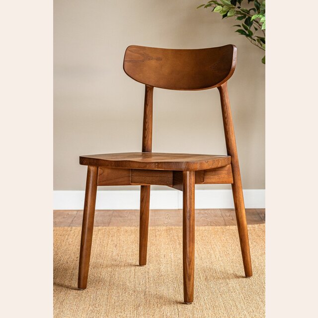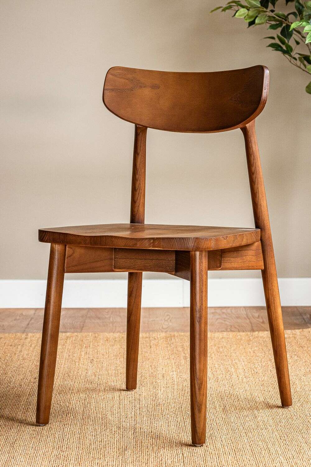 Asiento ergonómico y diseño minimalista en madera maciza de olmo en lustre avellana.