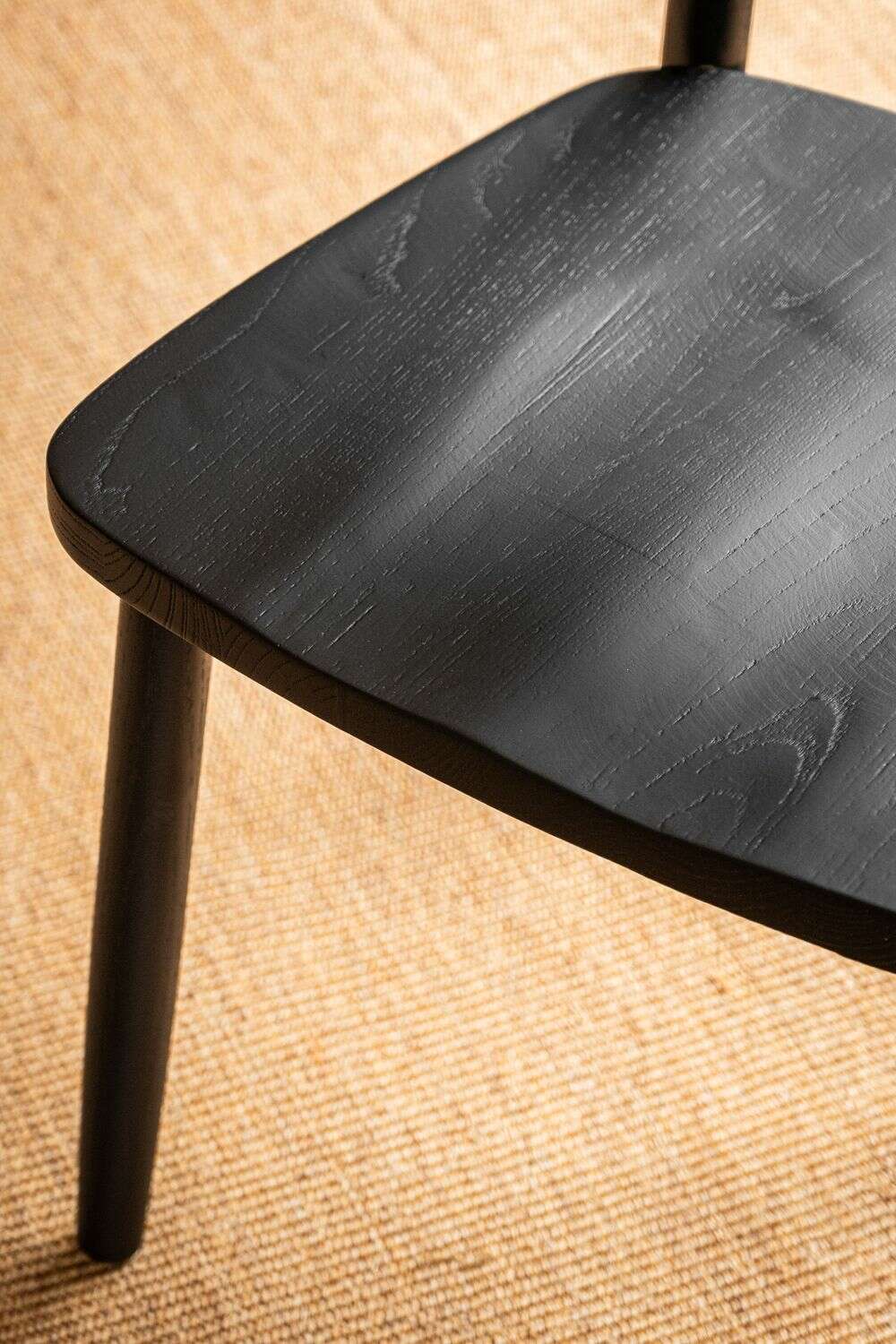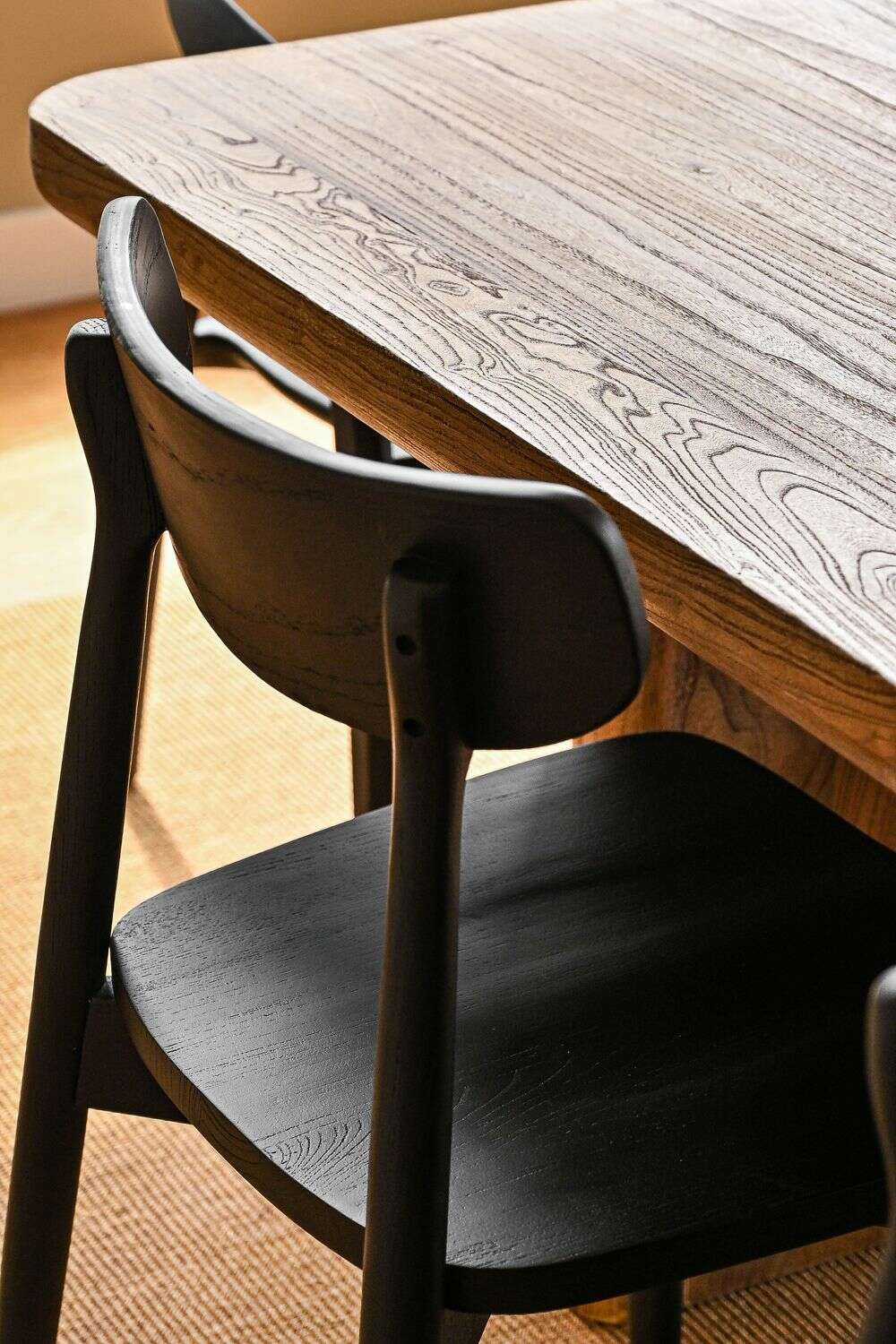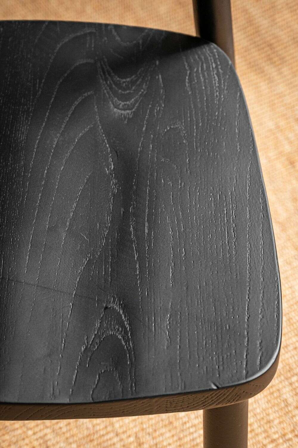 Asiento ergonómico y diseño minimalista en madera maciza de olmo en lustre avellana.