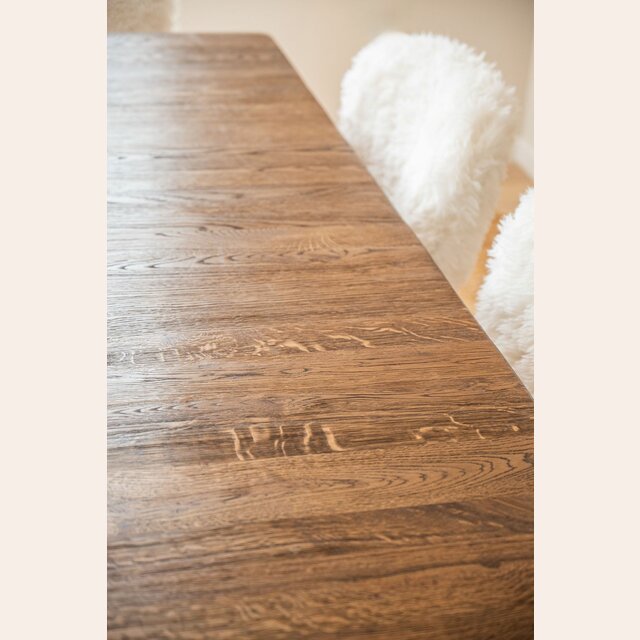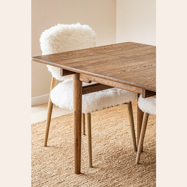 Amplias y comodísimas sillas de comedor con estructura de fresno macizo y tapizadas en pelo largo sintético color off-white, lavable con agua y jabón neutro.