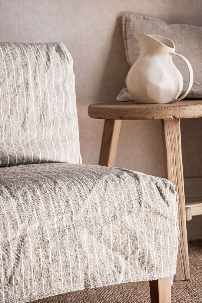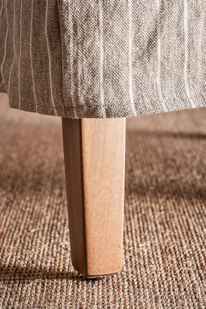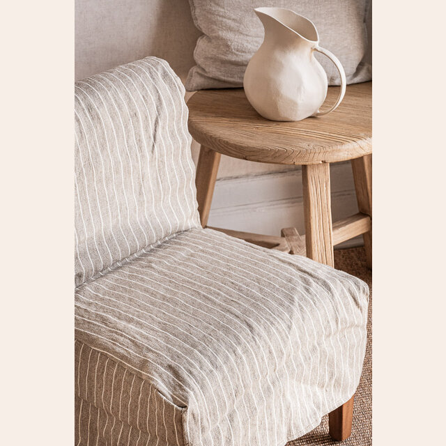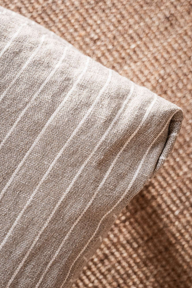 Versión con funda 100% lino natural alto gramaje en estampa a rayas beige.