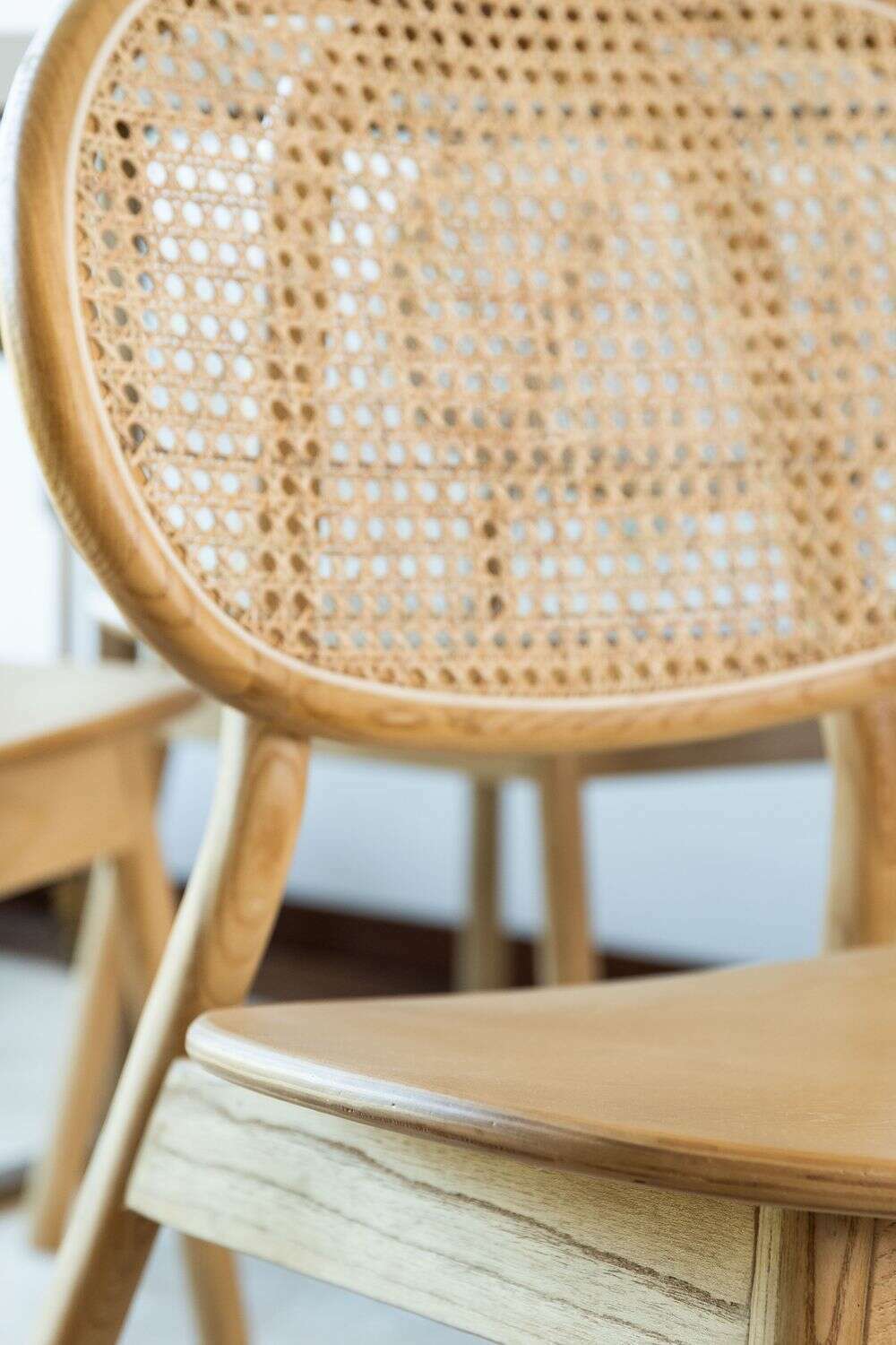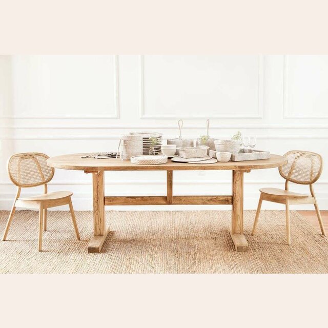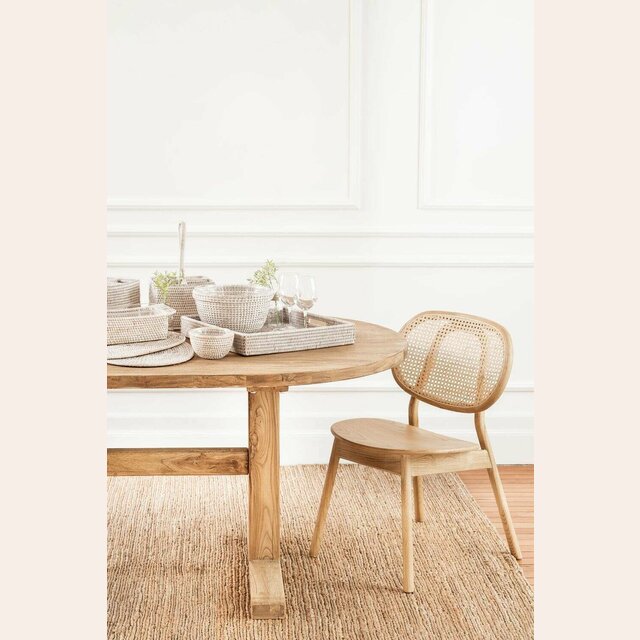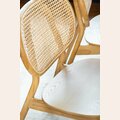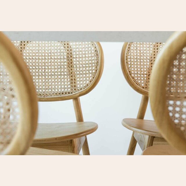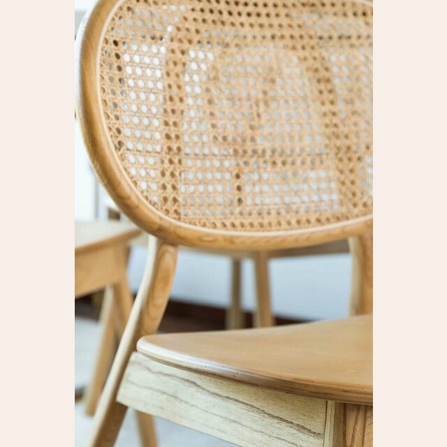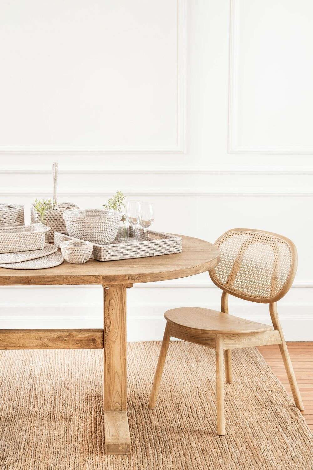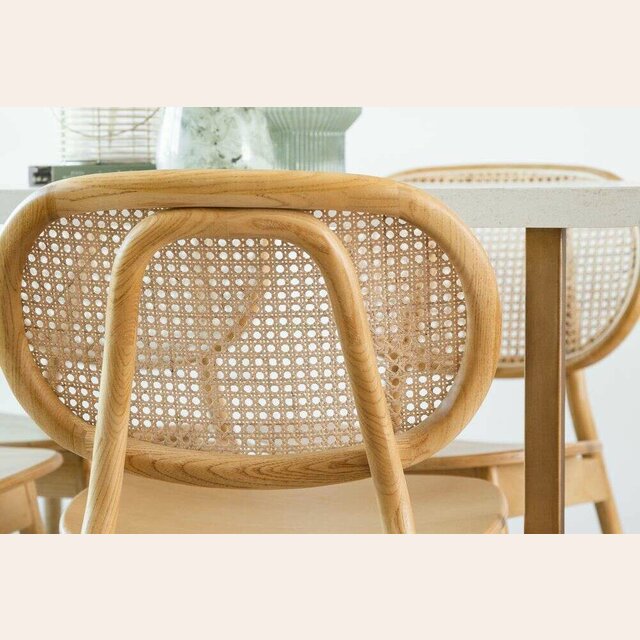 Divina silla de líneas curvas con respaldo oval de esterilla y estructura de olmo macizo en lustre natural.