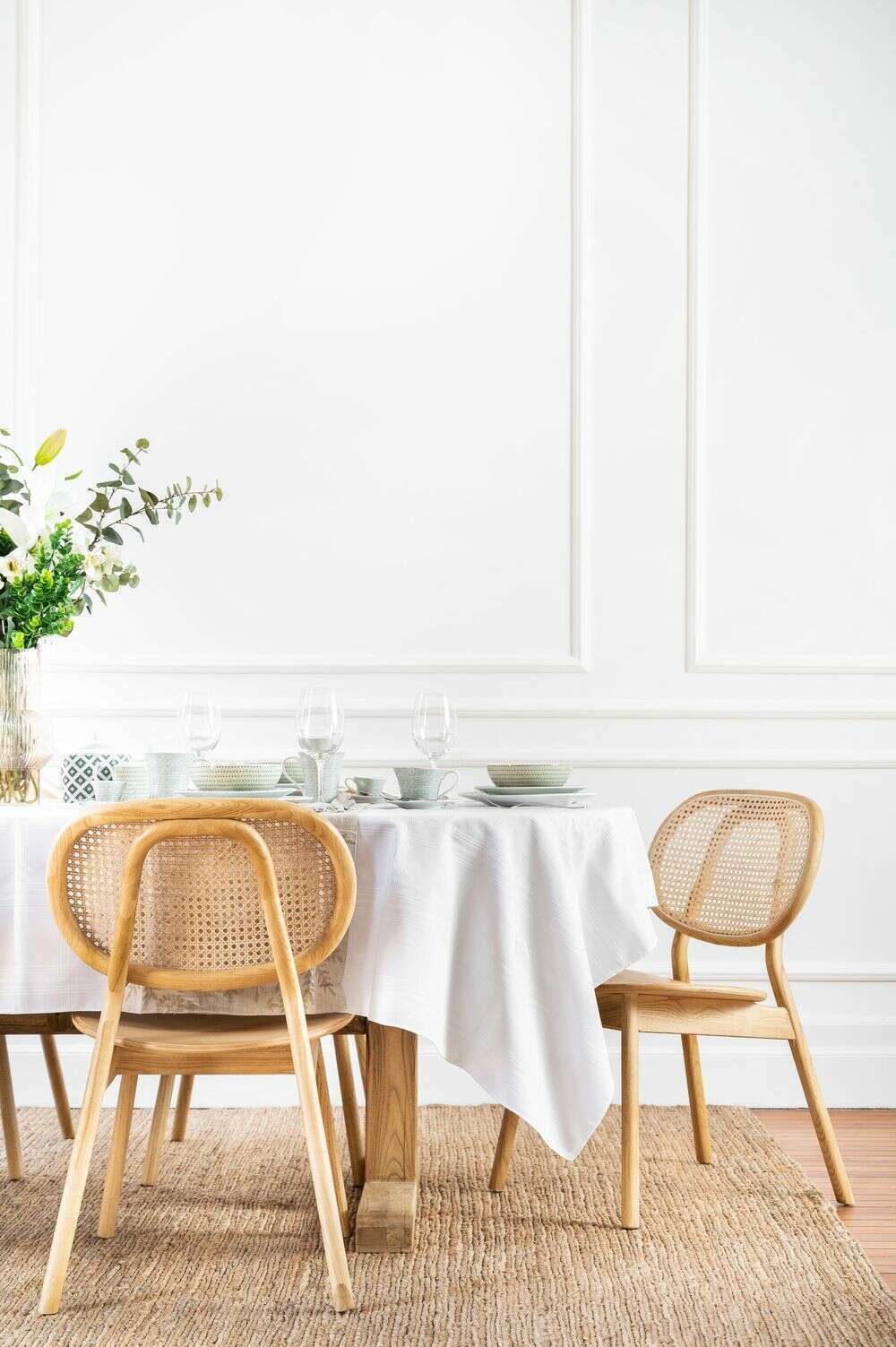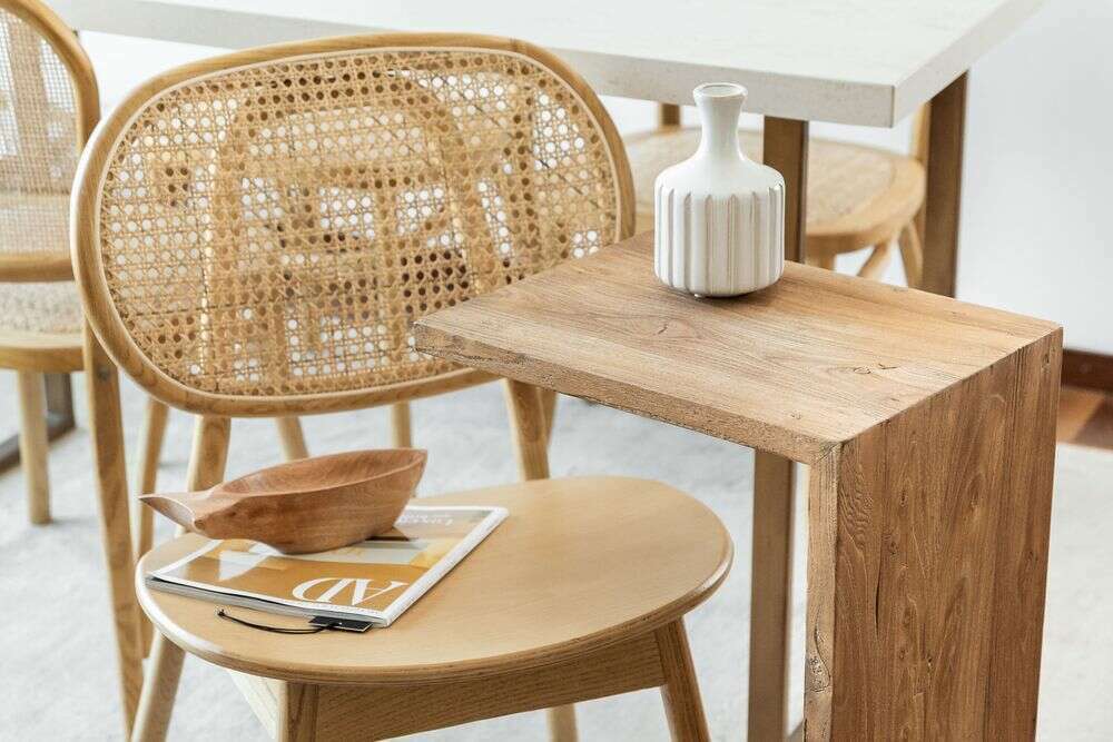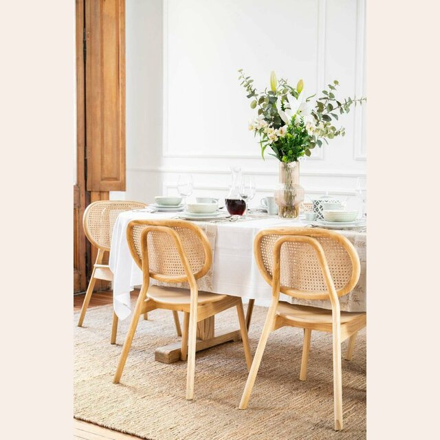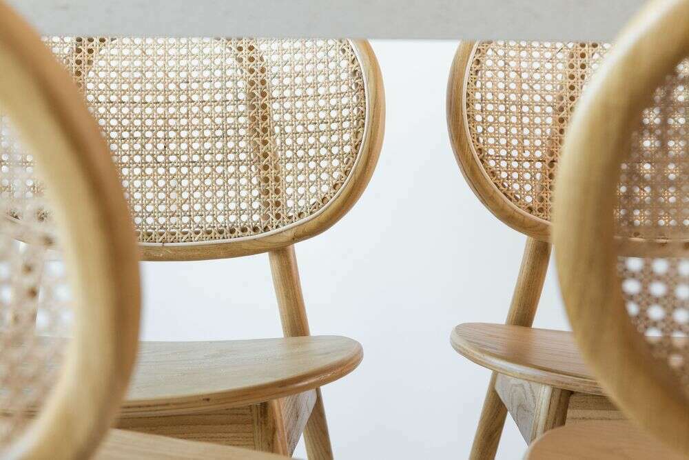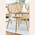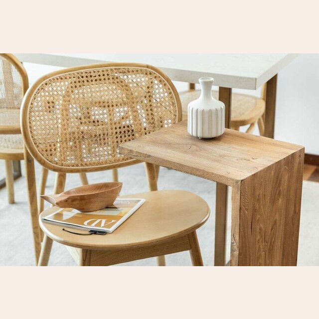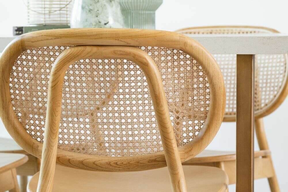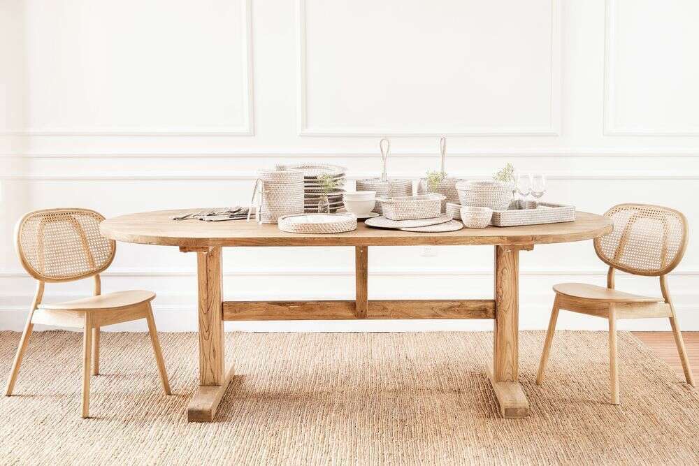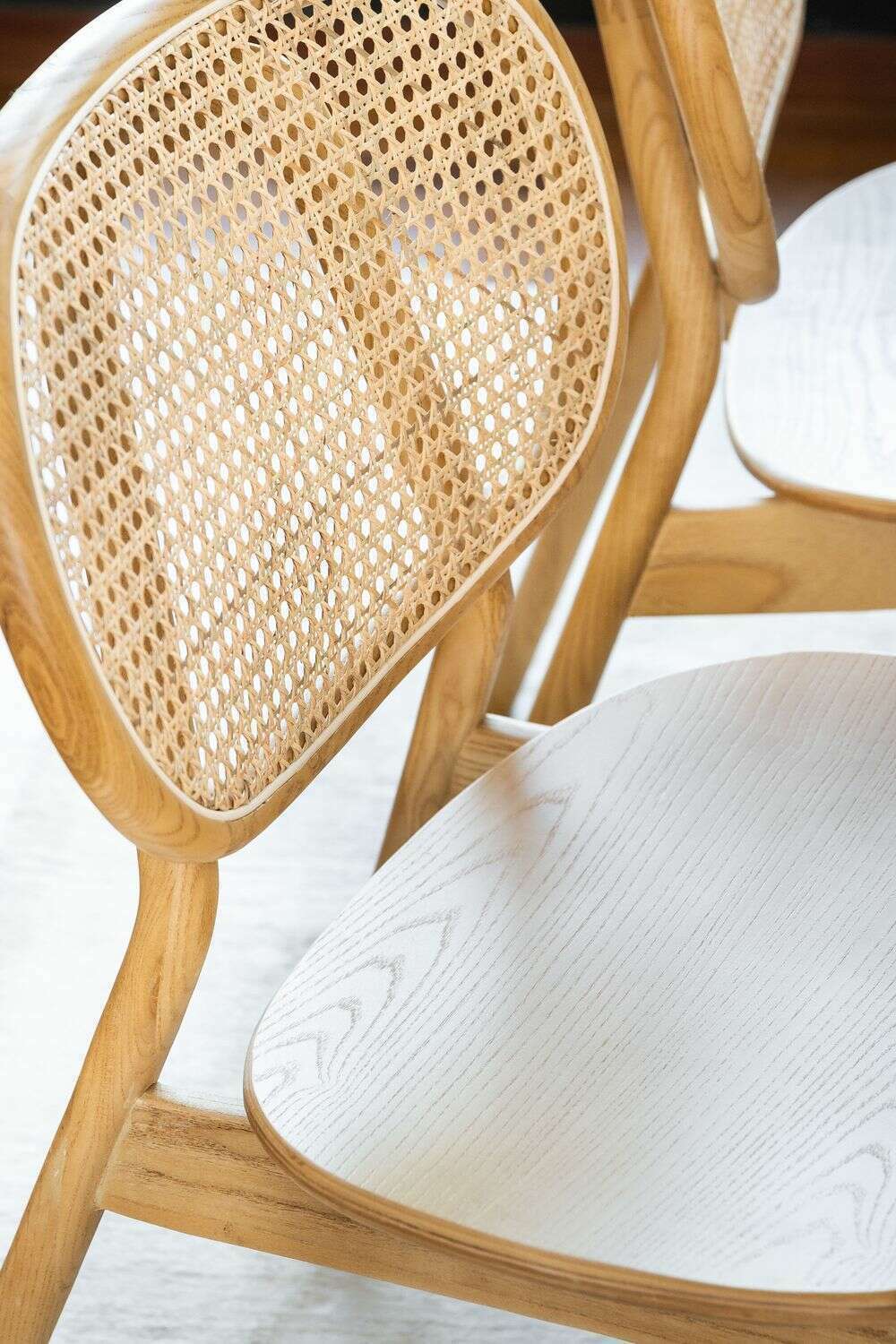 Divina silla de líneas curvas con respaldo oval de esterilla y estructura de olmo macizo en lustre natural.