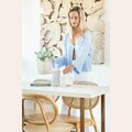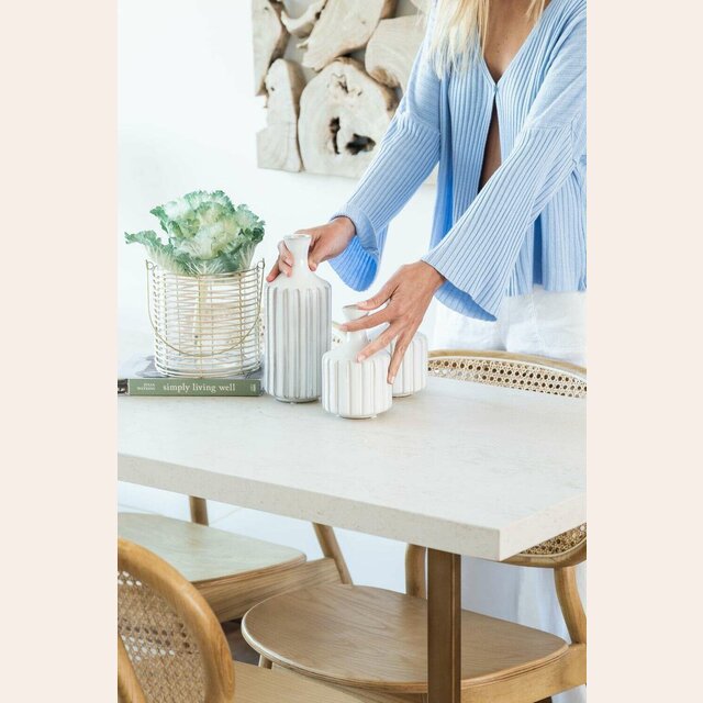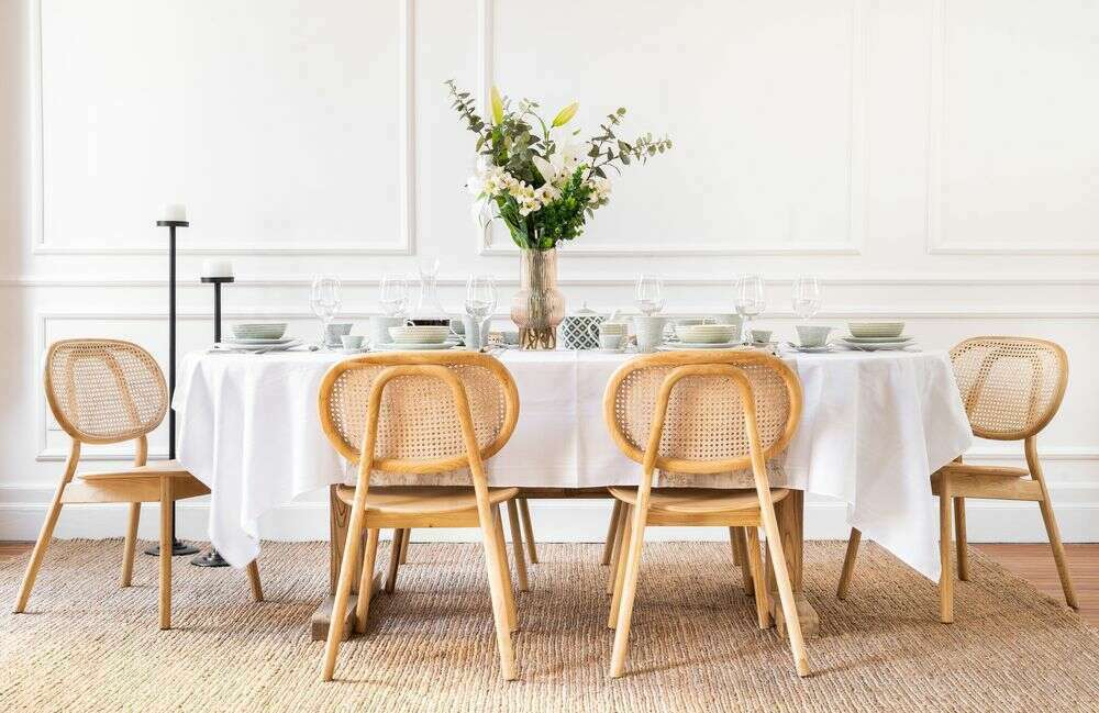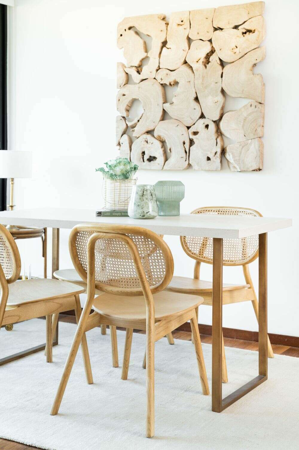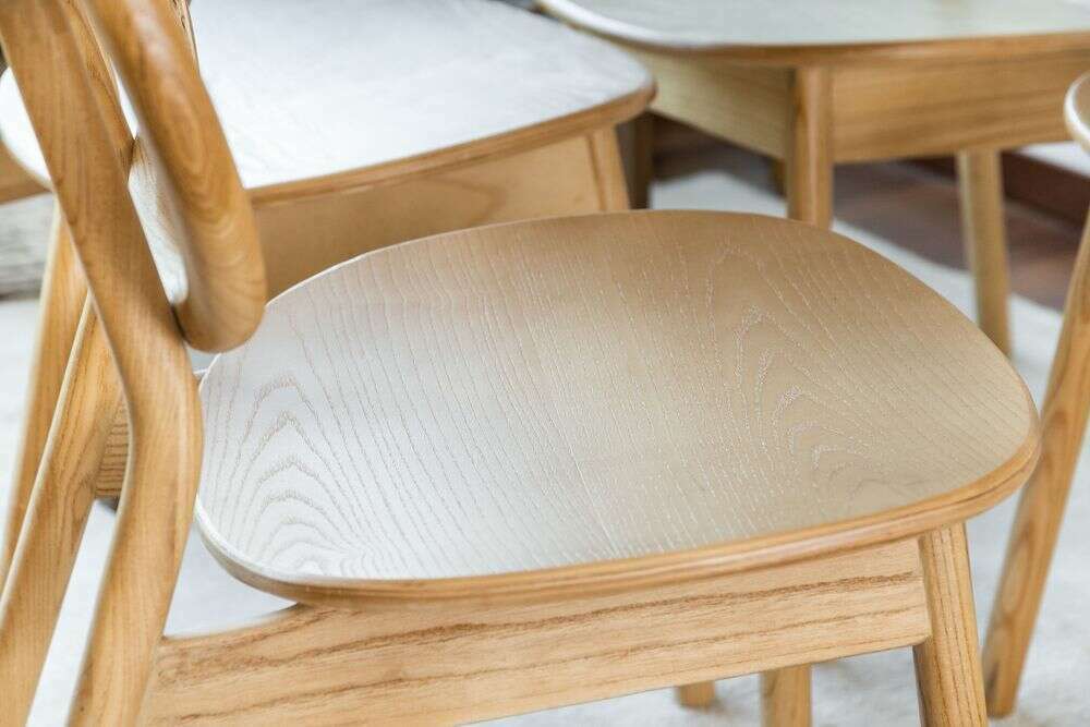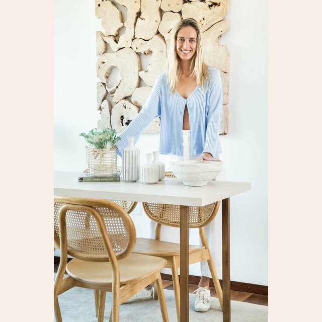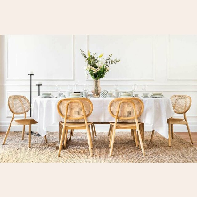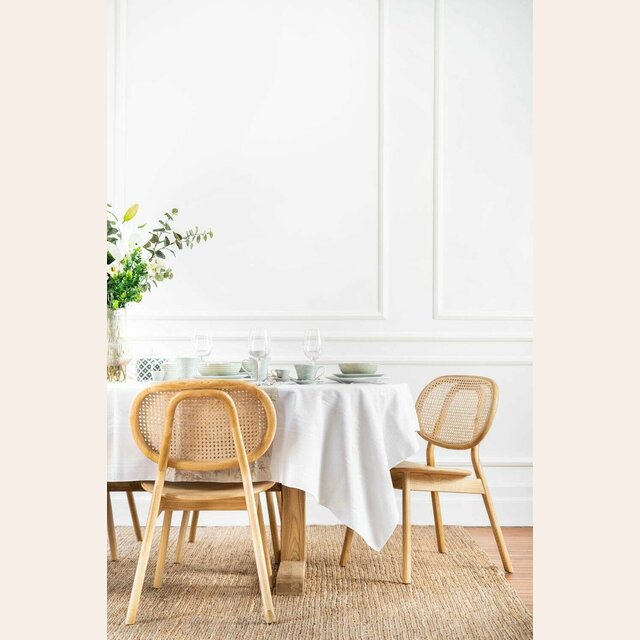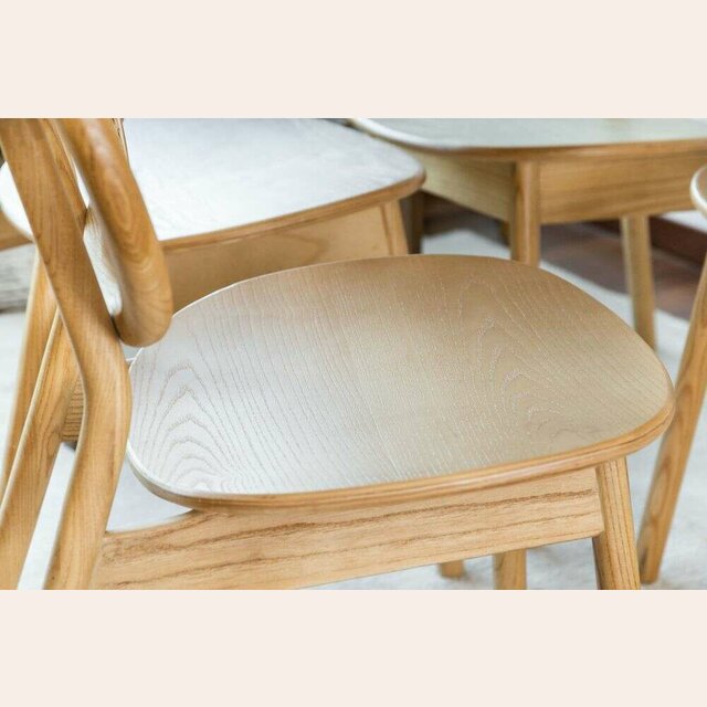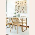 Divina silla de líneas curvas con respaldo oval de esterilla y estructura de olmo macizo en lustre natural.