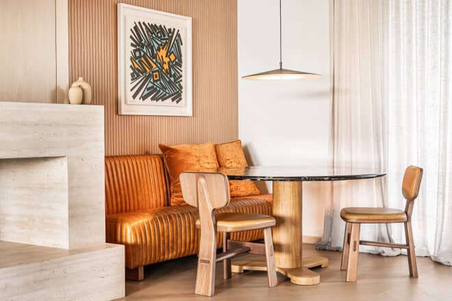 Reemplazando 2 o 3 sillas por un sillón recostado contra la pared, ahorramos el espacio adicional que deberíamos dejar para retirar las sillas.